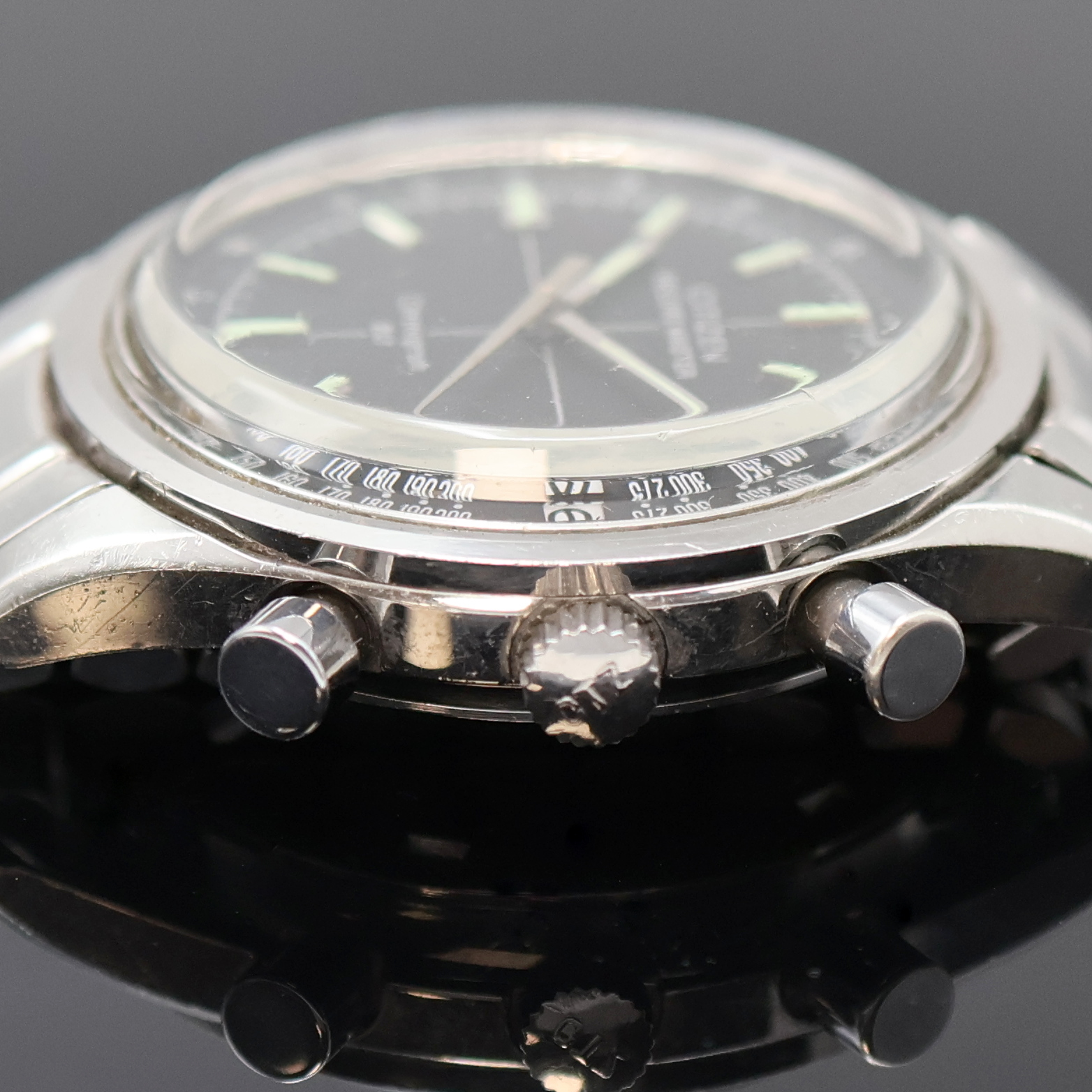 Faltschl., schwarzes Zifferbl. m. Tachymeter- skala, aufges. Leuchtind., Leuchtzeiger,