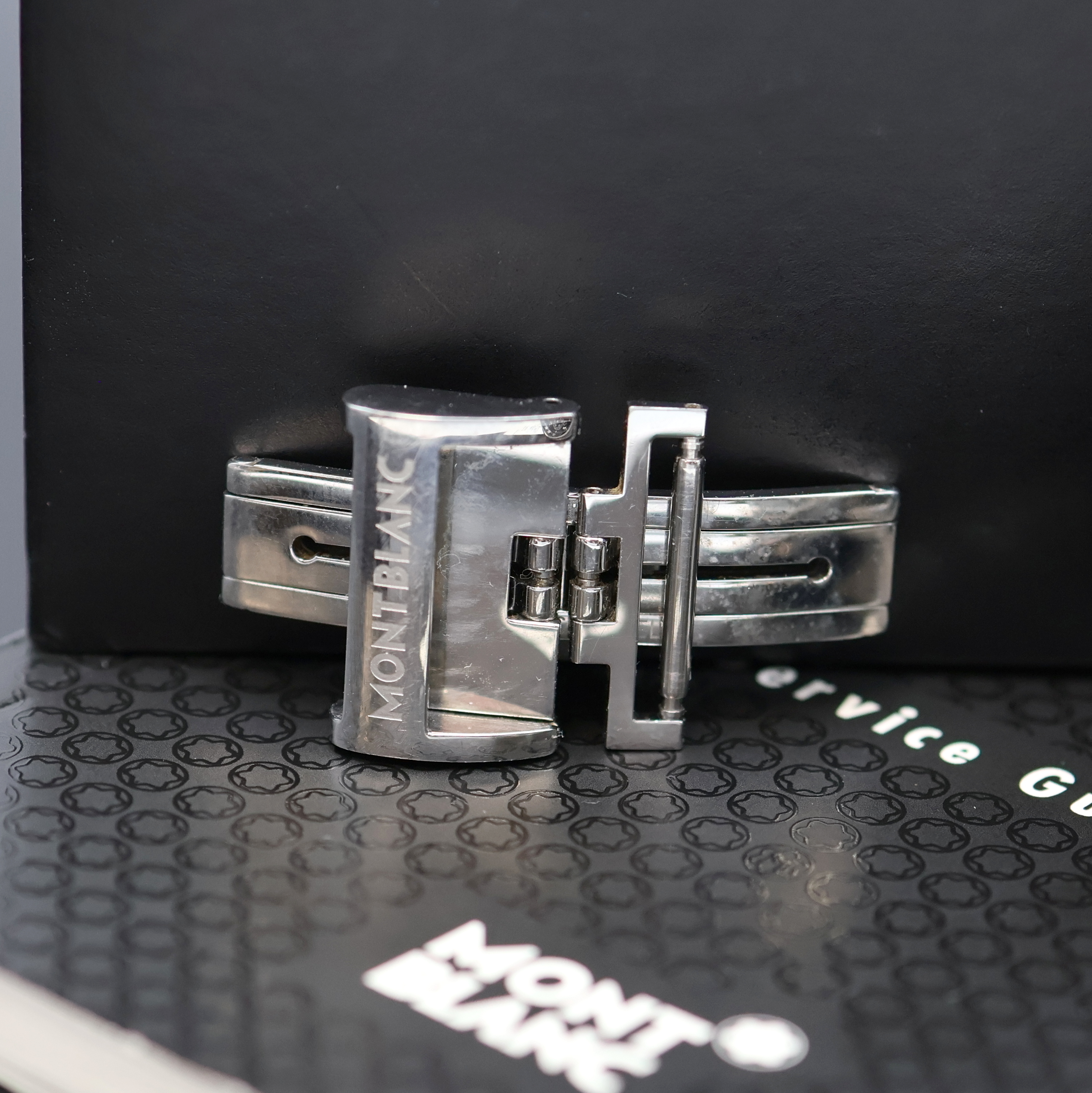 (orig. Faltschl. anbei), Boden aufgedr., schwarzes Zifferbl. m. arab. Zahlen, silb.
