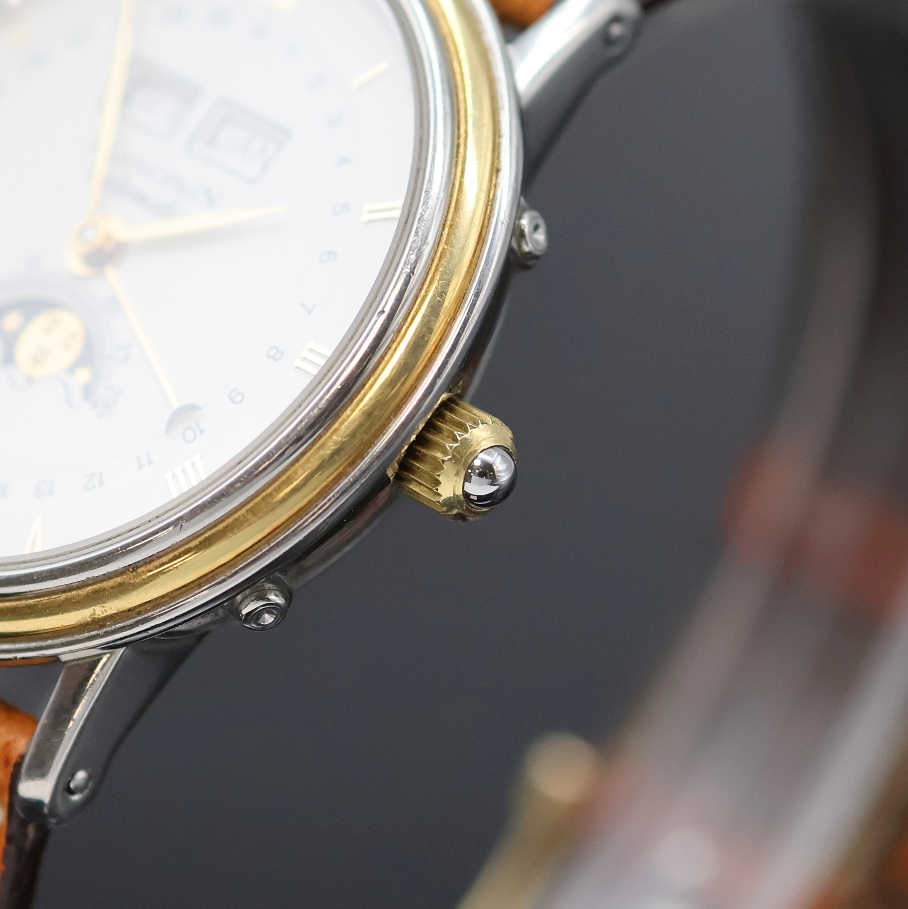 Korrekturdr. seitl. im Geh. eingel., weißes Zifferbl. m. röm. Zahlen, gold. Zeiger,