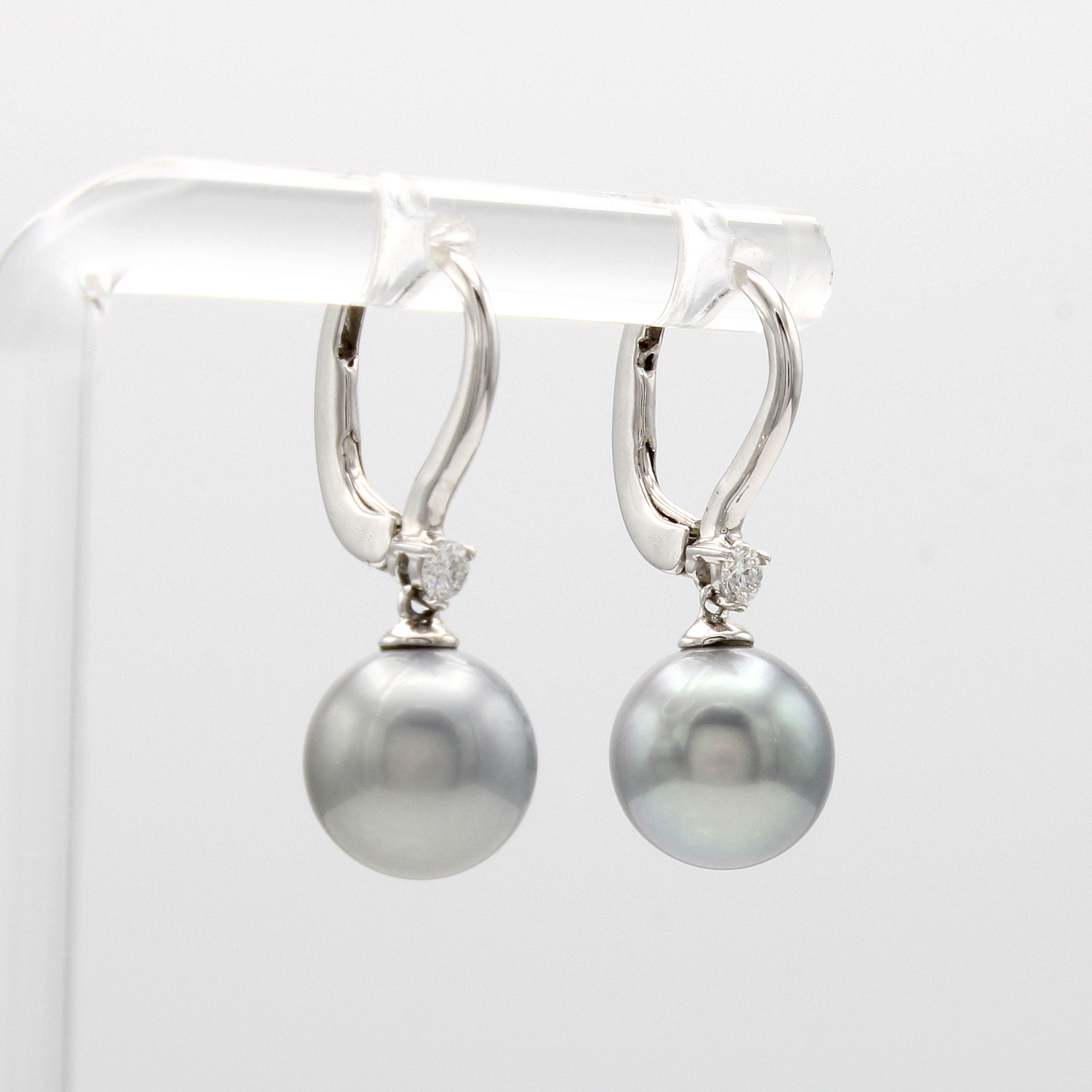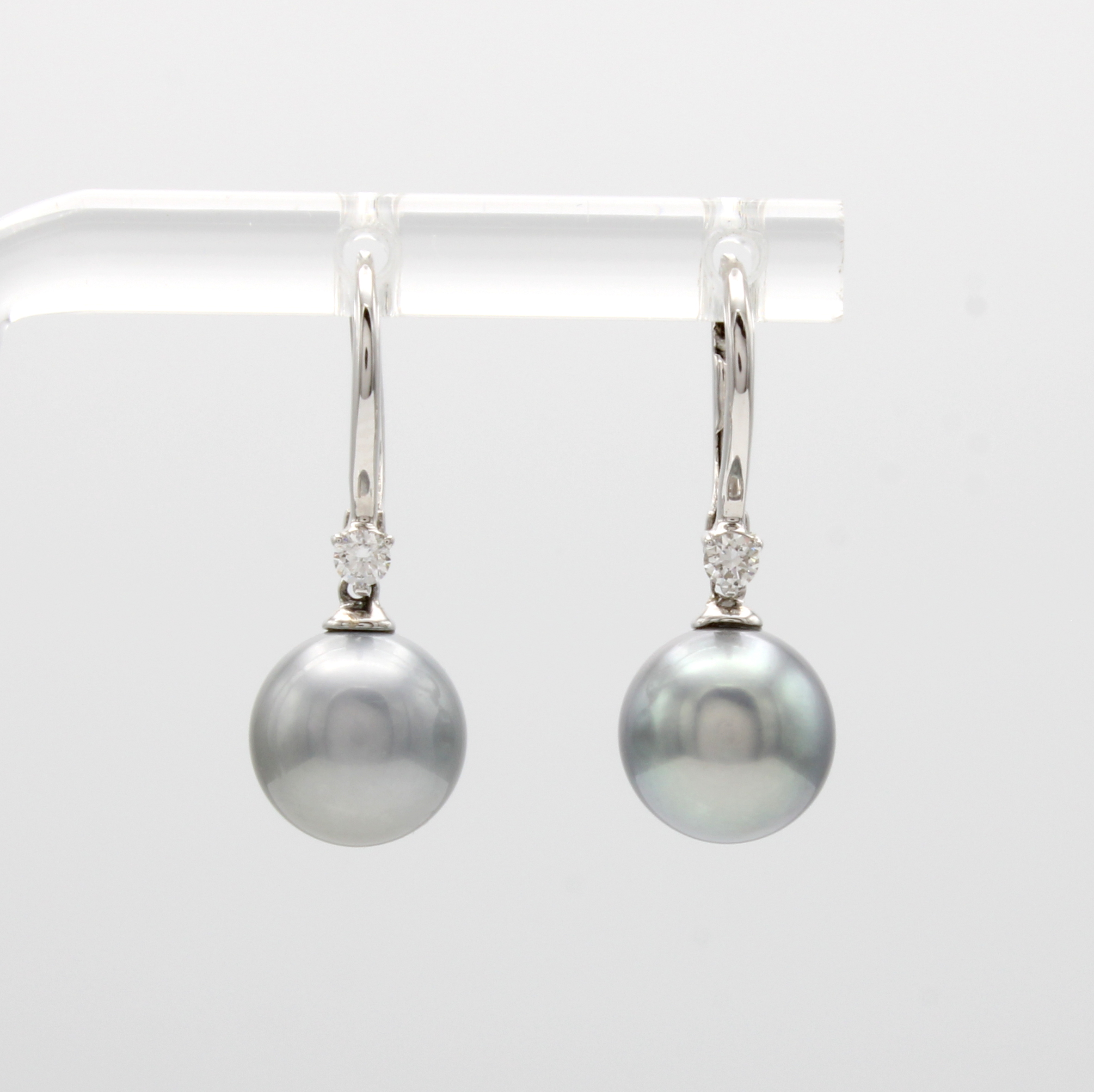 Paar Ohrgehänge mit Perlabhängungen und Brillanten, WG 750/000, 2 hellgraue Perlen ca. 9 mm, 2 Brill. zus. ca. 0.09 ct Weiß/si Schätzpreis: 1100, - EUR