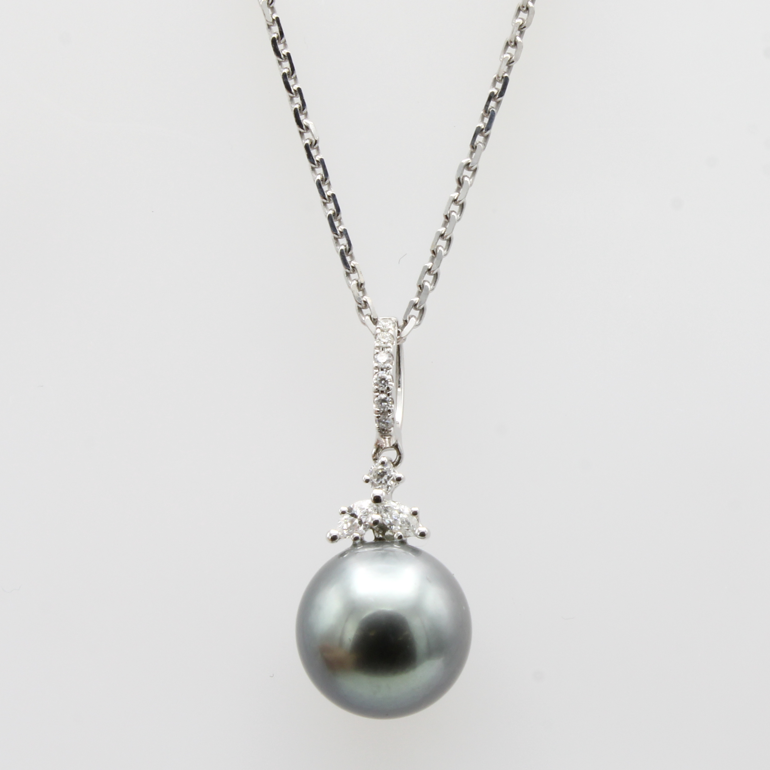 Anhänger mit Tahitiperle, Brillanten und Diamanten an Kette, WG 750/000, hellgrüne Perle ca. 10 mm, 2 Diamantnav. zus. ca. 0.08 ct u. 7 Brill. zus. ca. 0.05 ct Weiß/si, in L.ca. 42.5 u. 45.5 cm tragbar Schätzpreis: 2000, - EUR