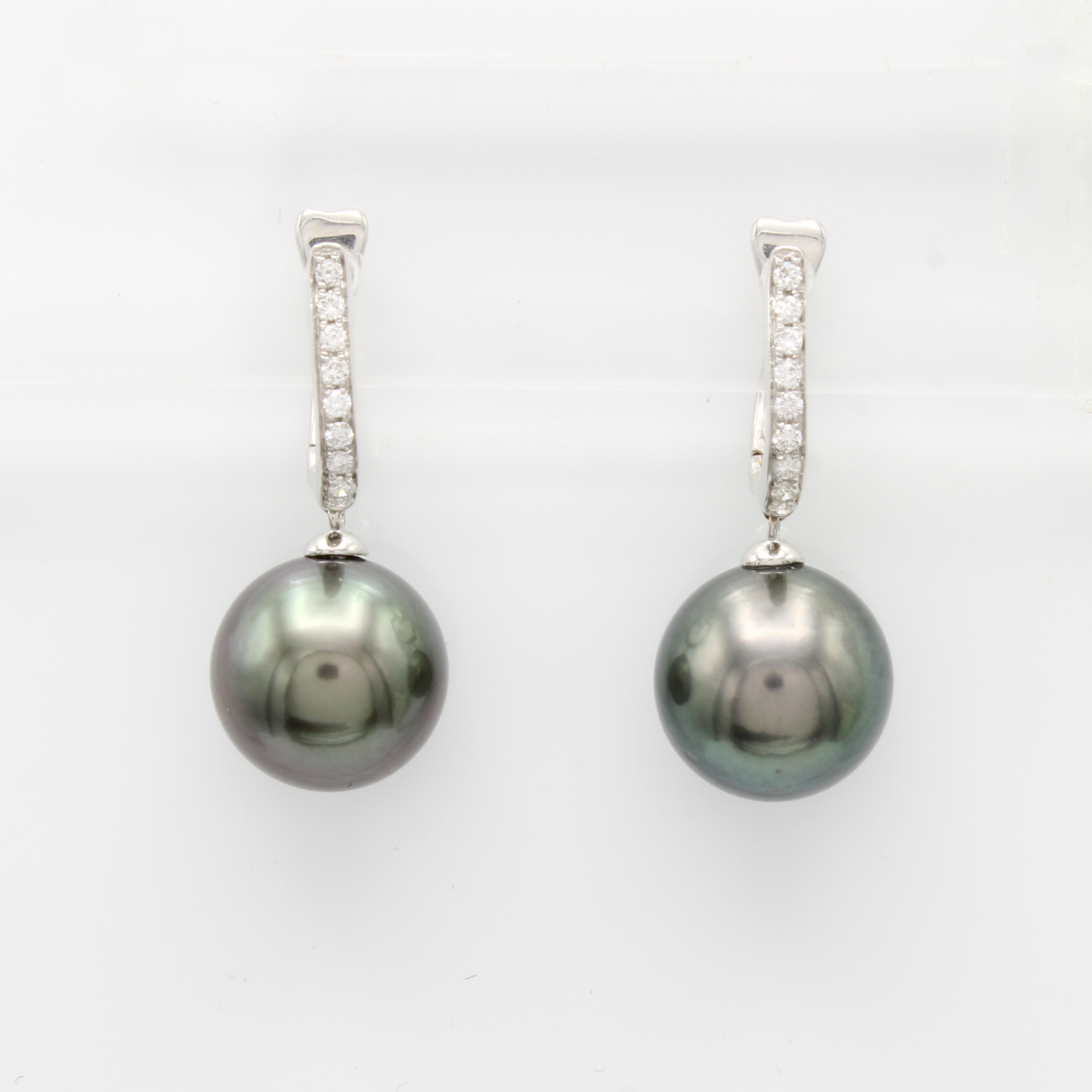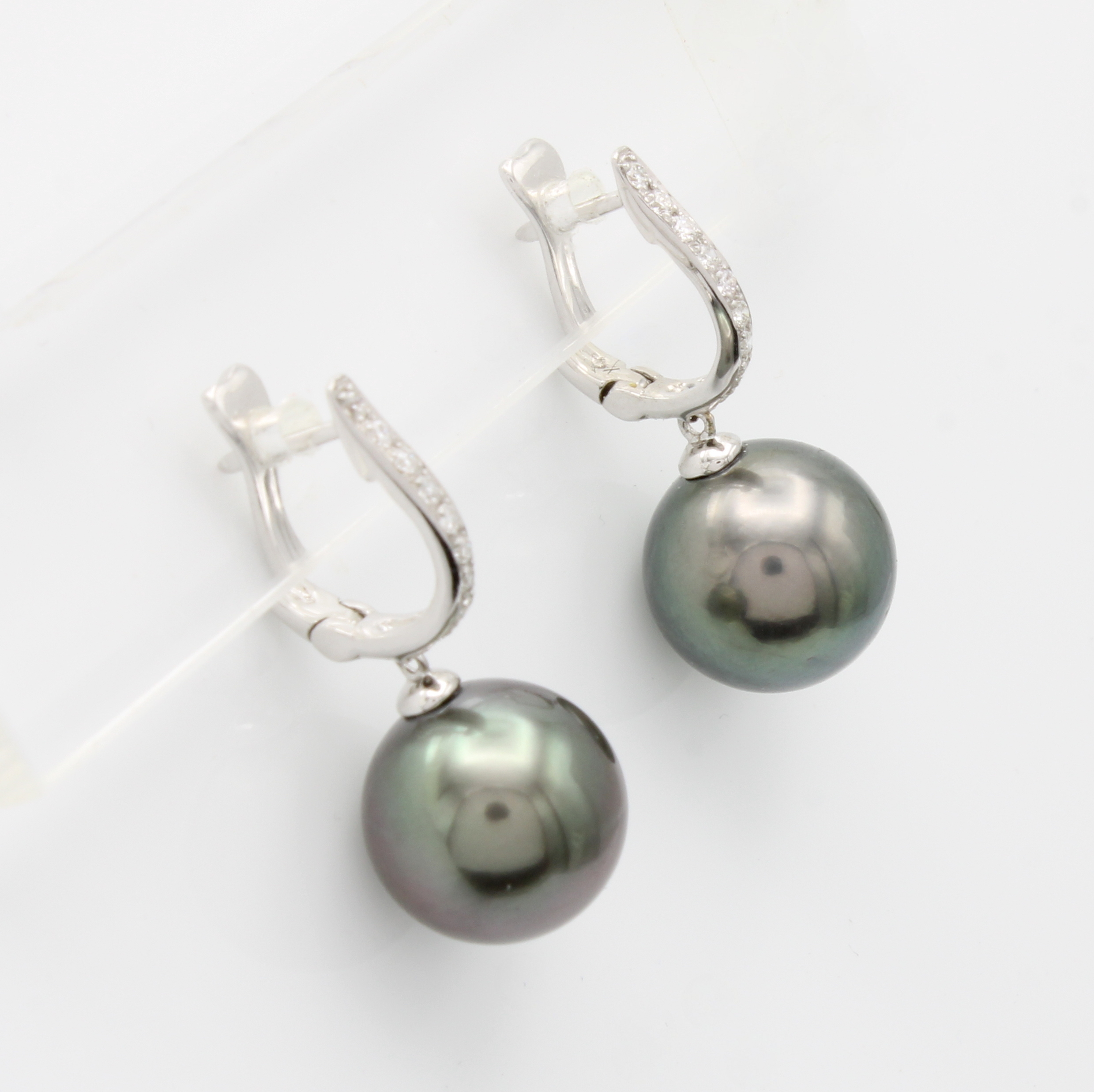 Paar Ohrgehänge mit Tahitiperlen und Brillanten, WG 750/000, 2 dunkelgrüne Perlenca. 10.5 mm, 18 Brill. zus. ca. 0.18 ct Weiß/ si, m. Clipbrisur Schätzpreis: 745, - EUR