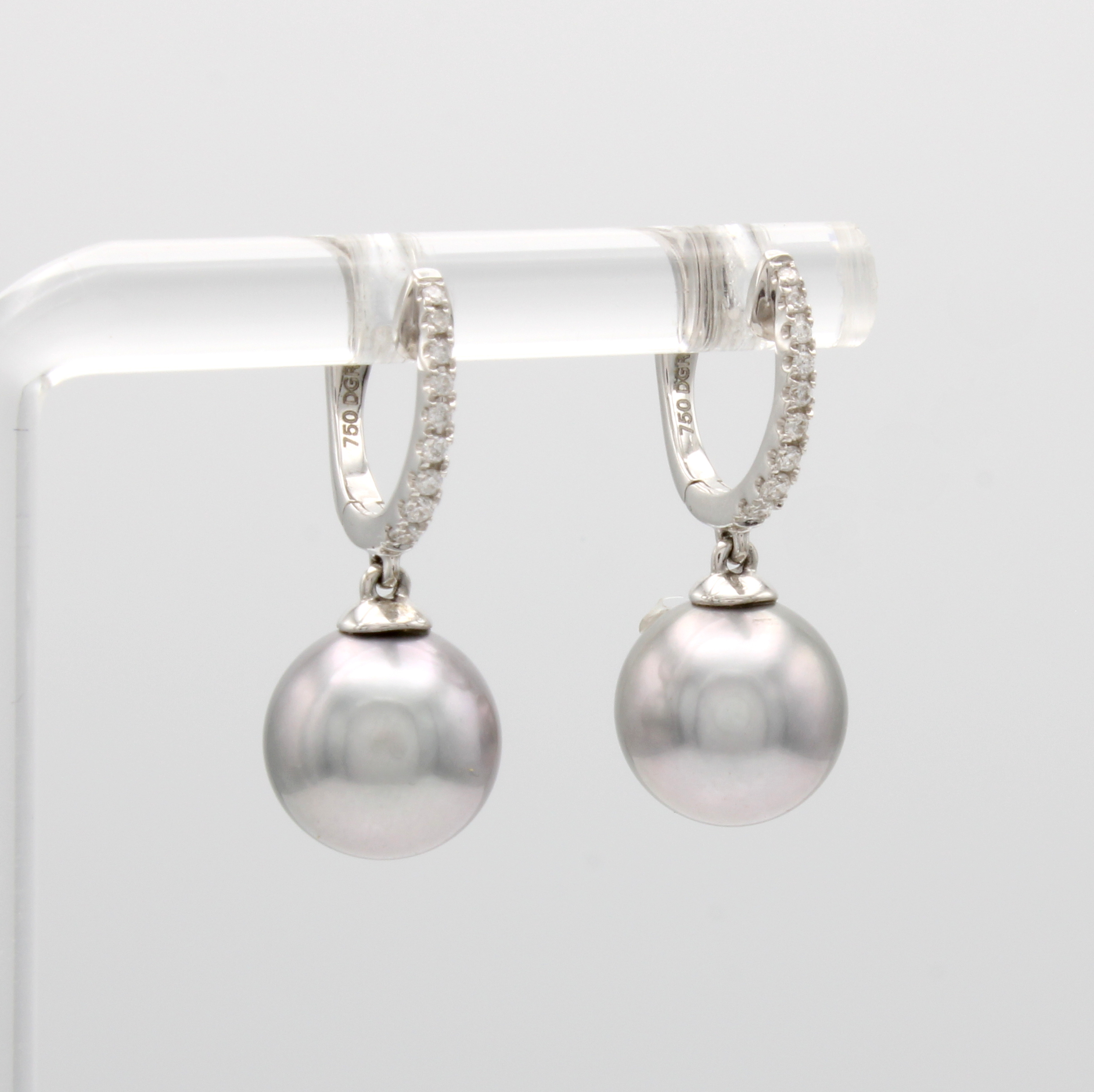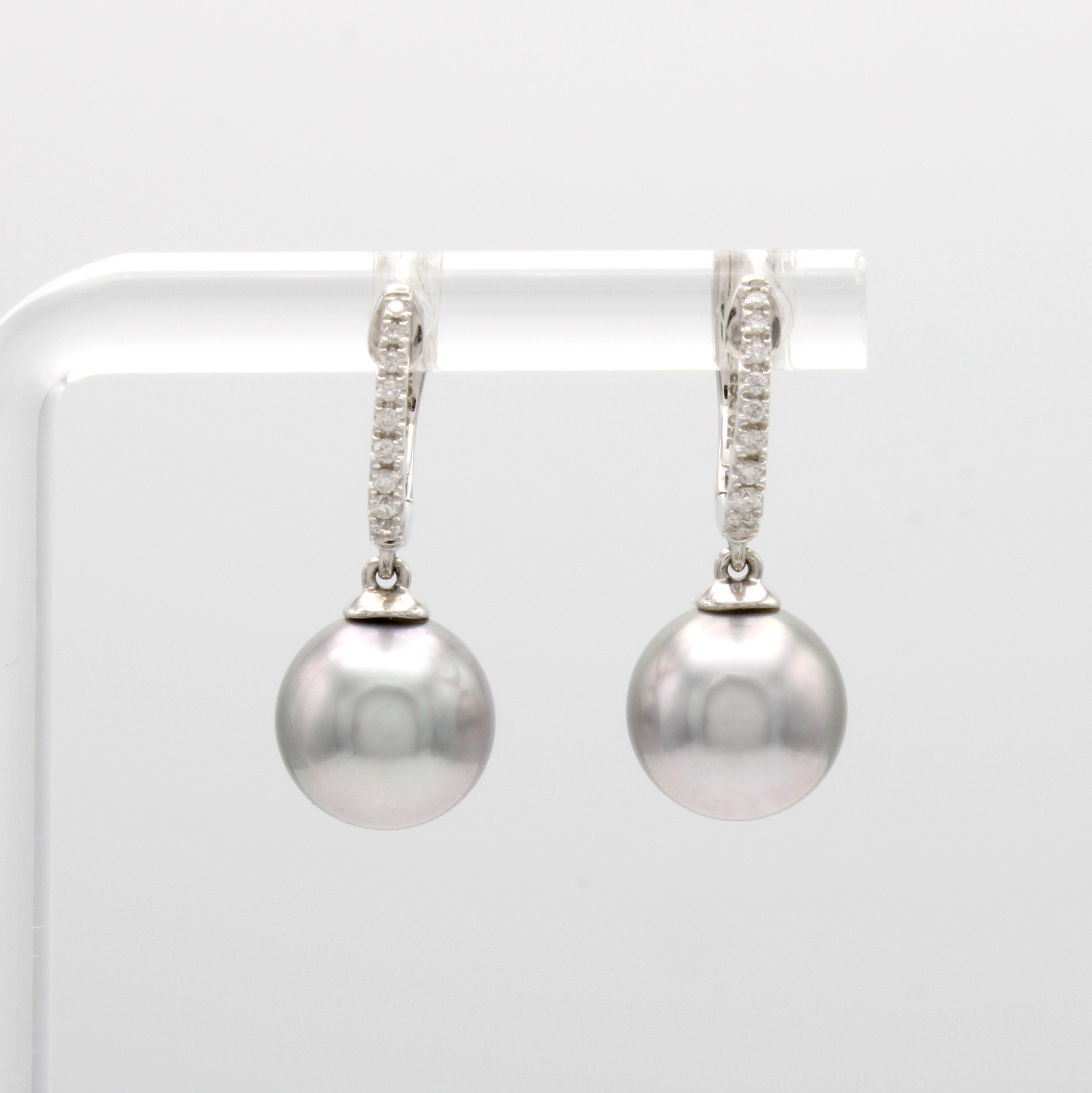 Paar Klappcreolen mit Tahitiperlen und Brillanten, WG 750/000, 2 hellgraue Perlen ca. 9 mm, 18 Brill. zus. ca. 0.11 ct feines Weiß/si Schätzpreis: 1230, - EUR