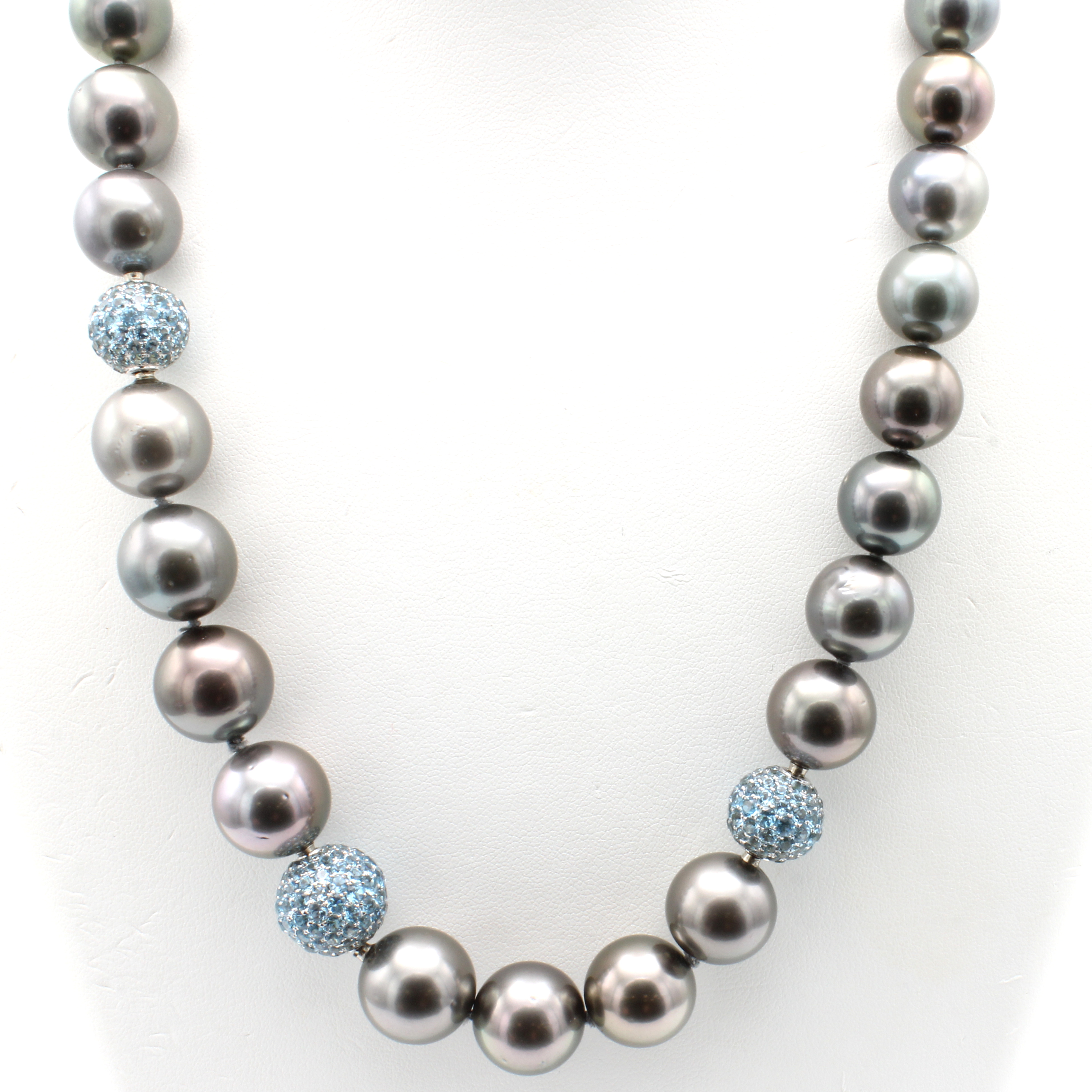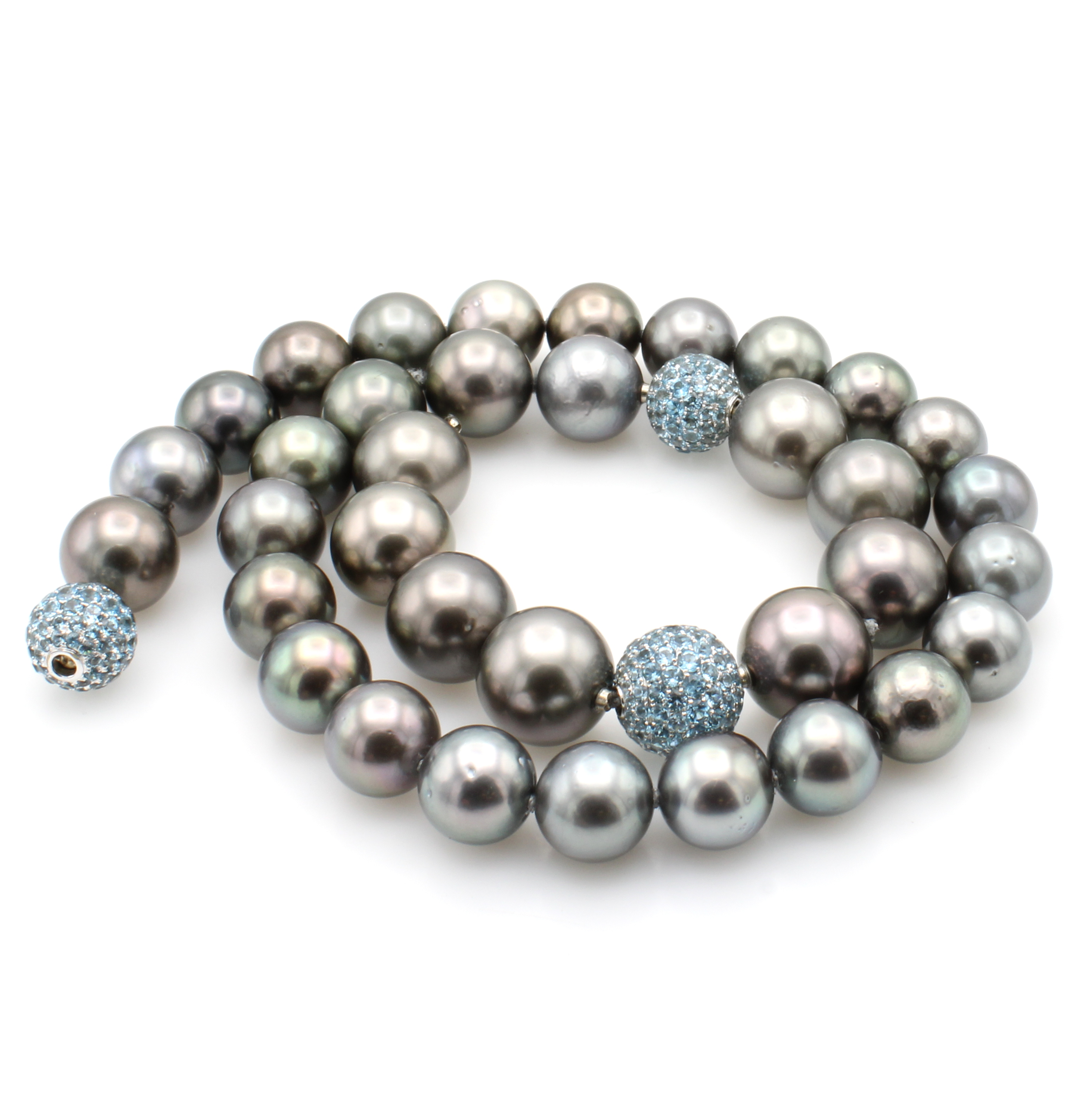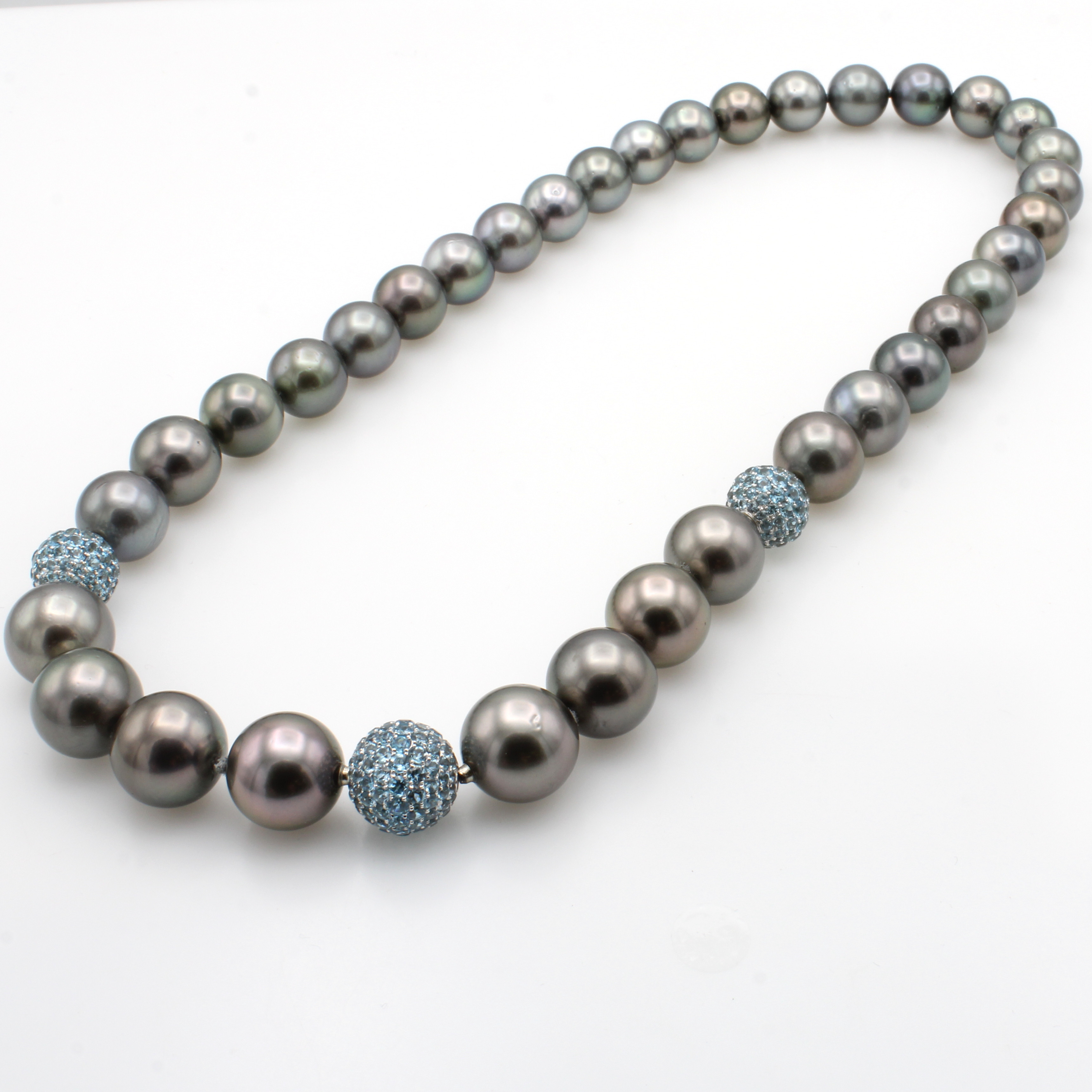 Tahitiperlcollier mit drei Blautopaswechsel- schließen, WG 750/000, im Verlauf gearb., grau-grüne Perlen, sowie grau-blaue Perlen m. versch. Übertönen ca. 12-15 mm, 314 fac. Blautopase (beh.) zus. ca. 13.81 ct, L. ca. 51cm Schätzpreis: 12540, - EUR