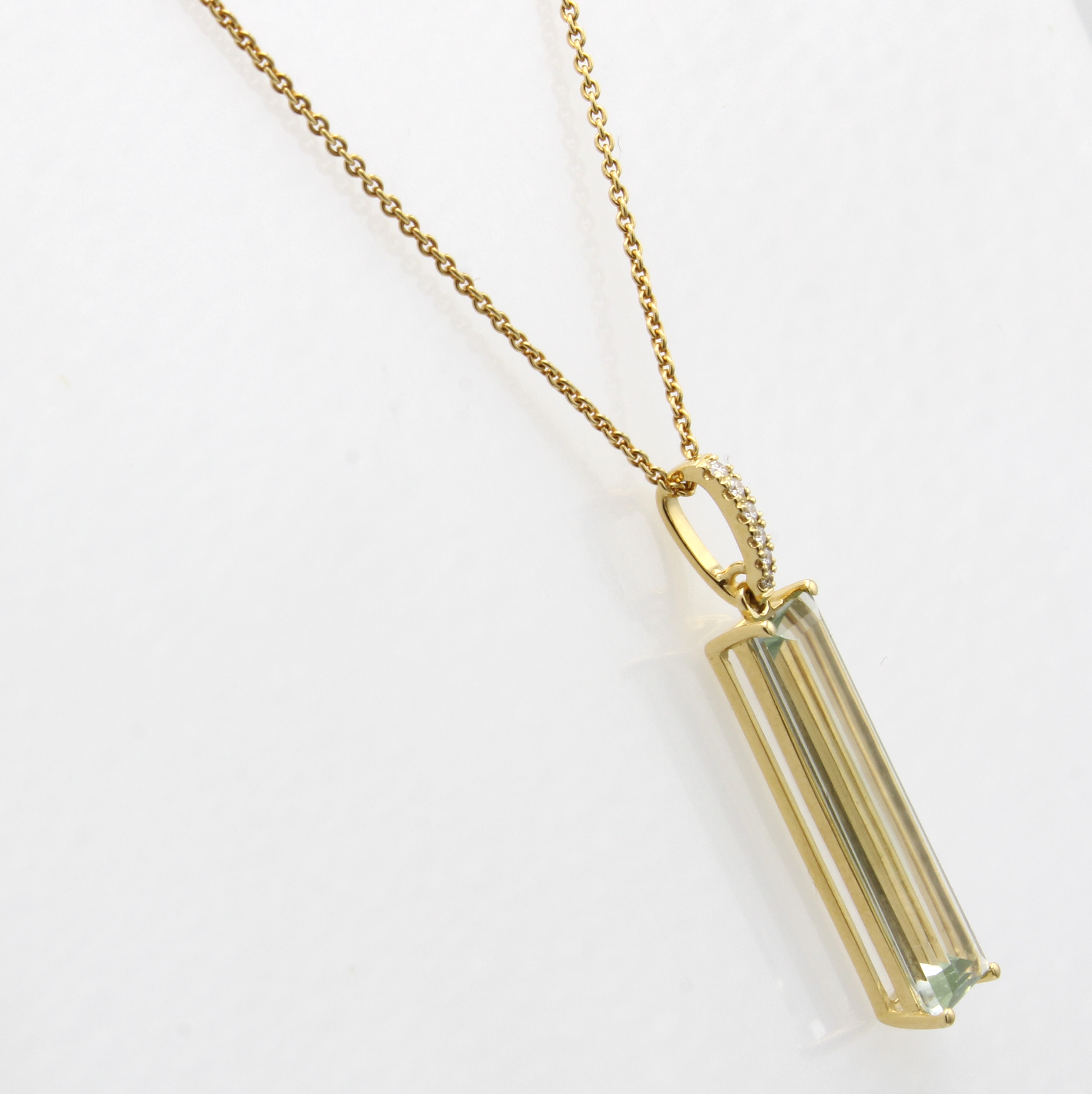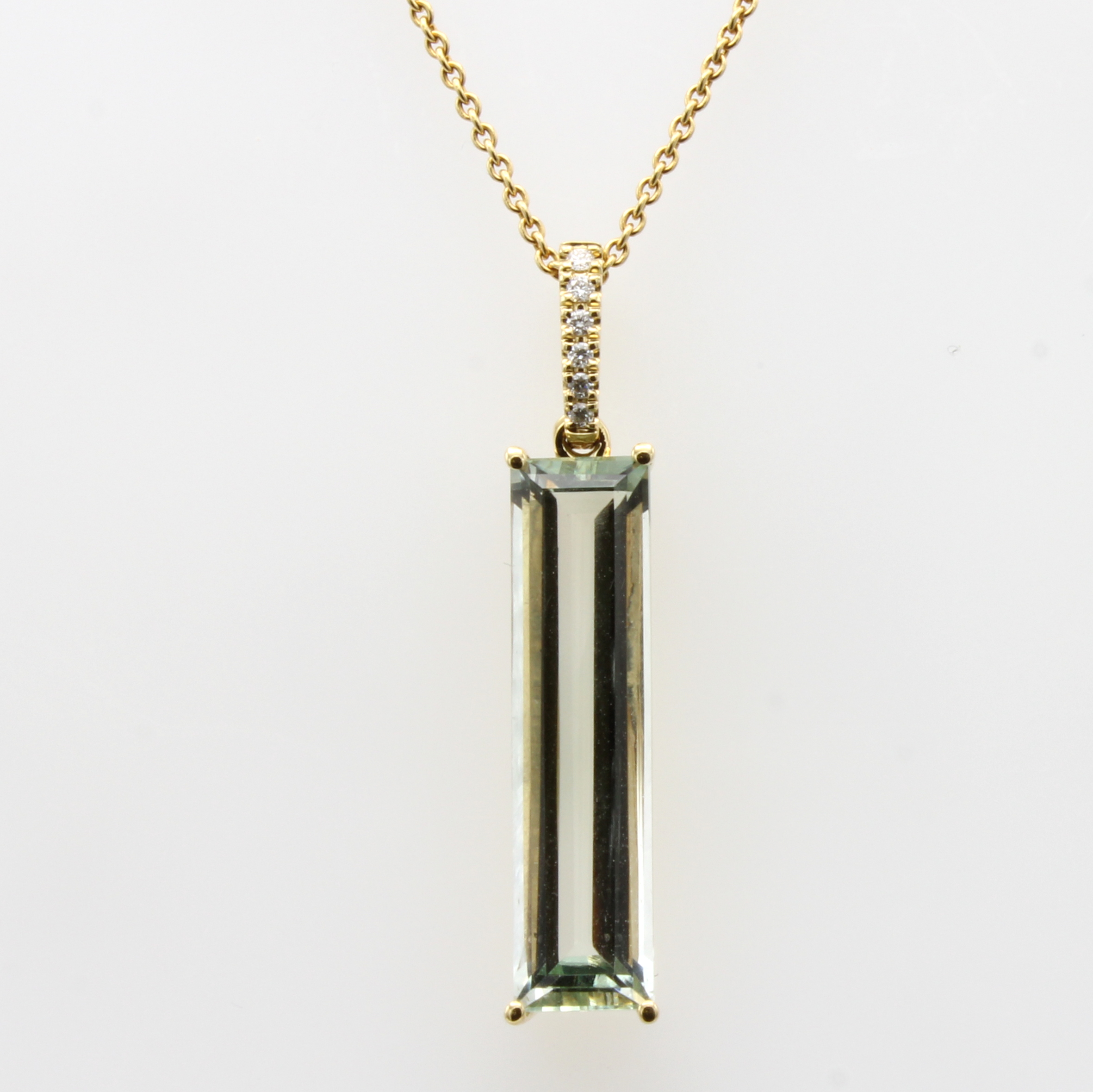 Anhänger mit Amethyst und Brillanten an Kette, GG 750/000, grüner Amethyst ca. 6 ct, 6 Brill. zus. ca. 0.05 ct feines Weiß/si, L. ca.42 cm Schätzpreis: 1890, - EUR