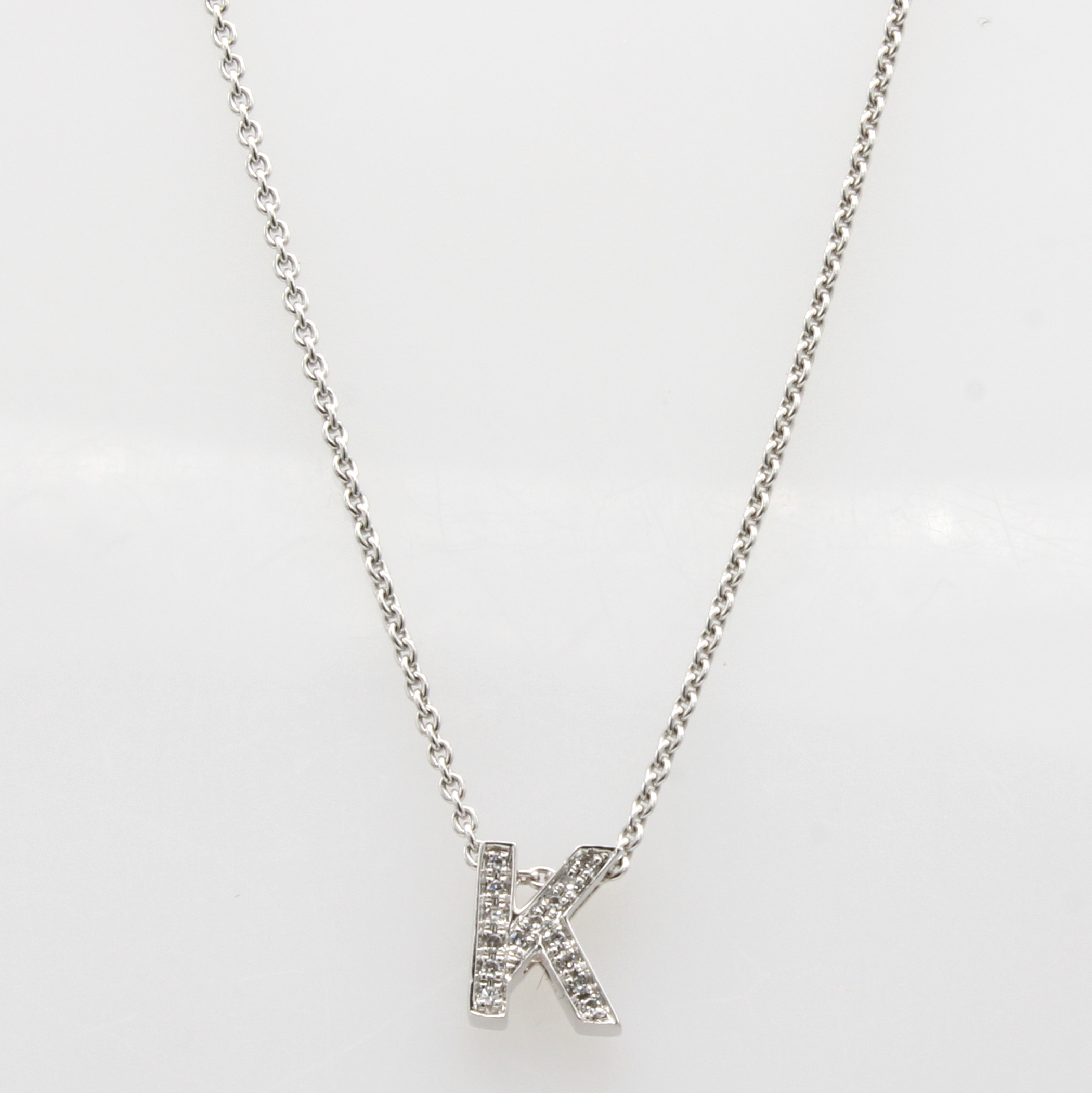 Anhänger mit Brillanten "K" an Kette, WG 750/000, WG 750/000, 15 Brill. zus. ca. 0.03ct Weiß/si, L. ca. 42 cm Schätzpreis: 1080, - EUR