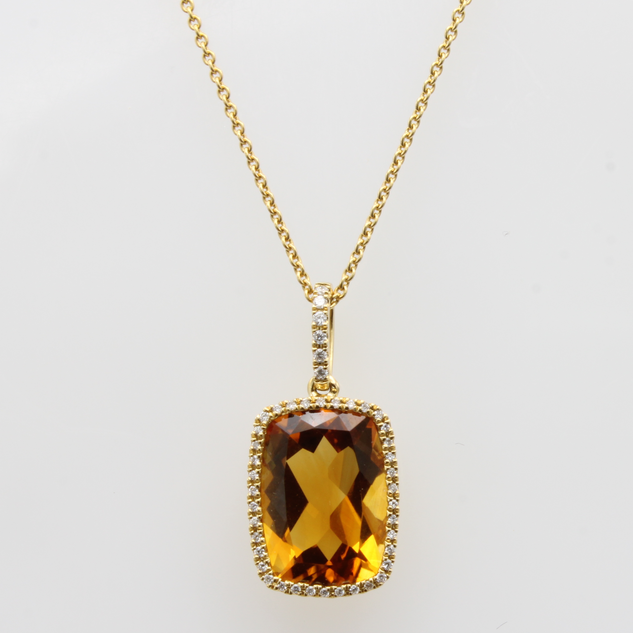 Anhänger mit Citrin und Brillanten an Kette, GG 750/000, 44 Brill. zus. ca. 0.16 ct feines Weiß/si, Citrin ca. 6.2 ct, L. ca. 42.5 cm Schätzpreis: 2180, - EUR
