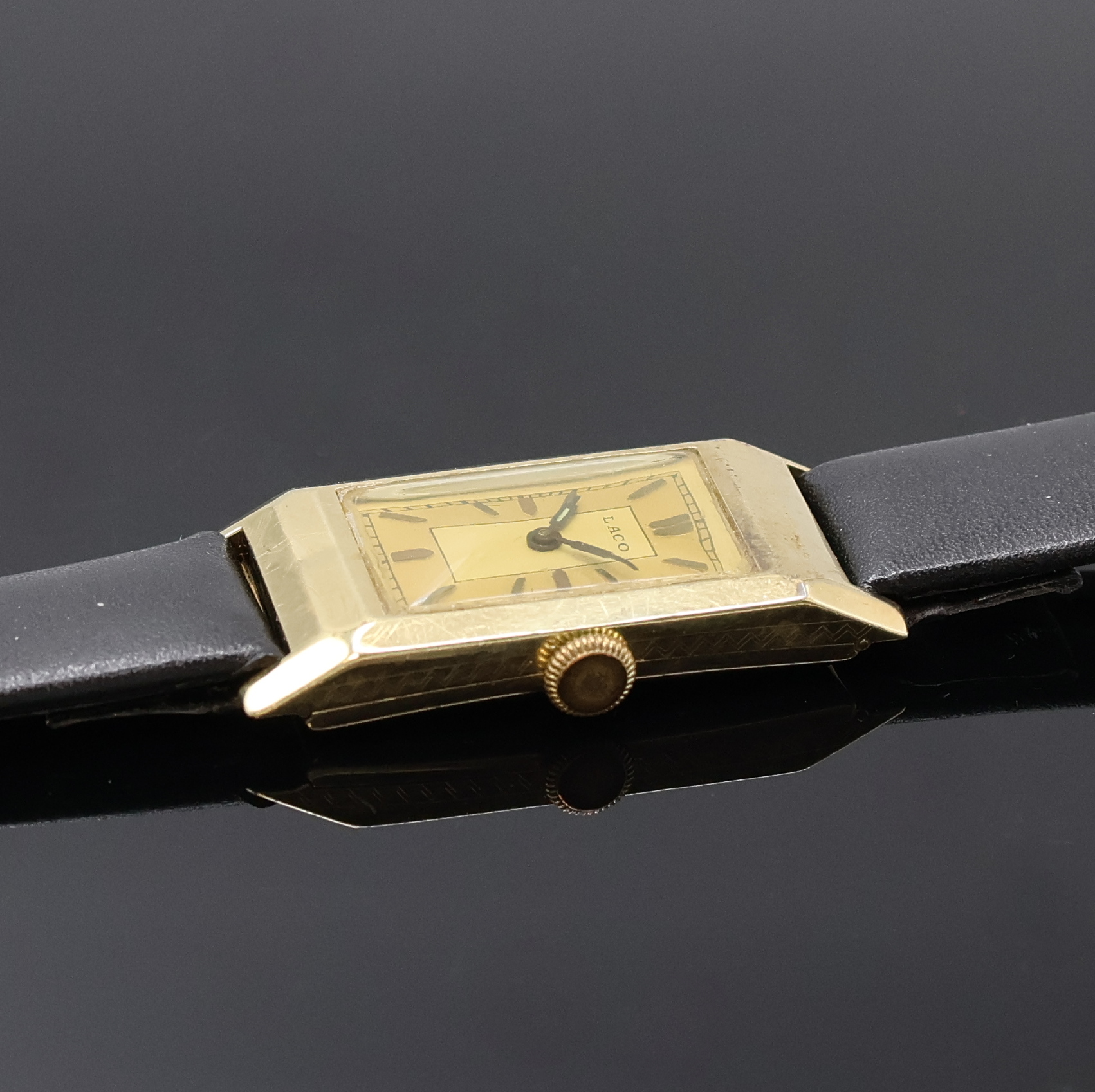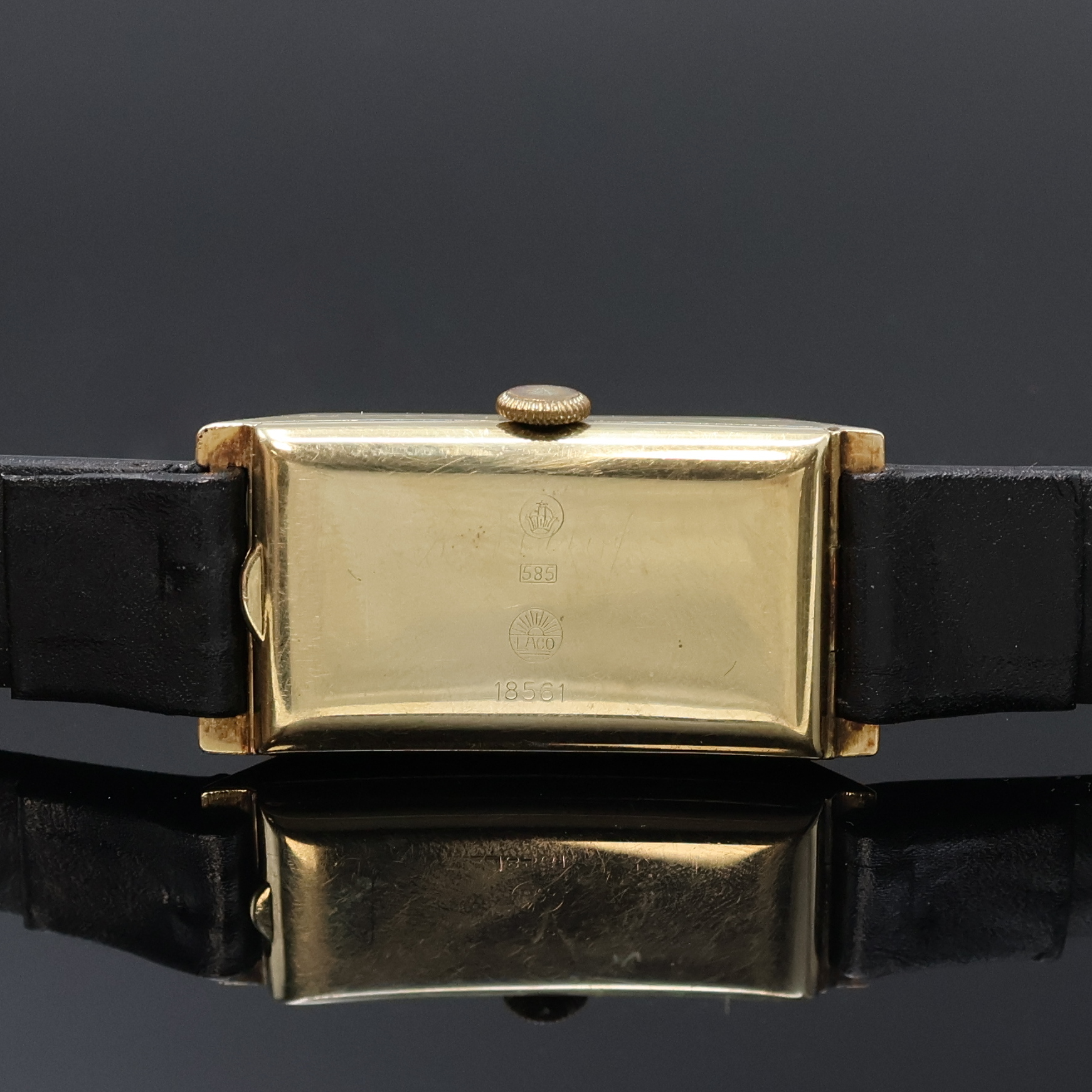 LACO rechteckige Armbanduhr in GG 585/000, Deutschland um 1935, Handaufzug, 2-teil.