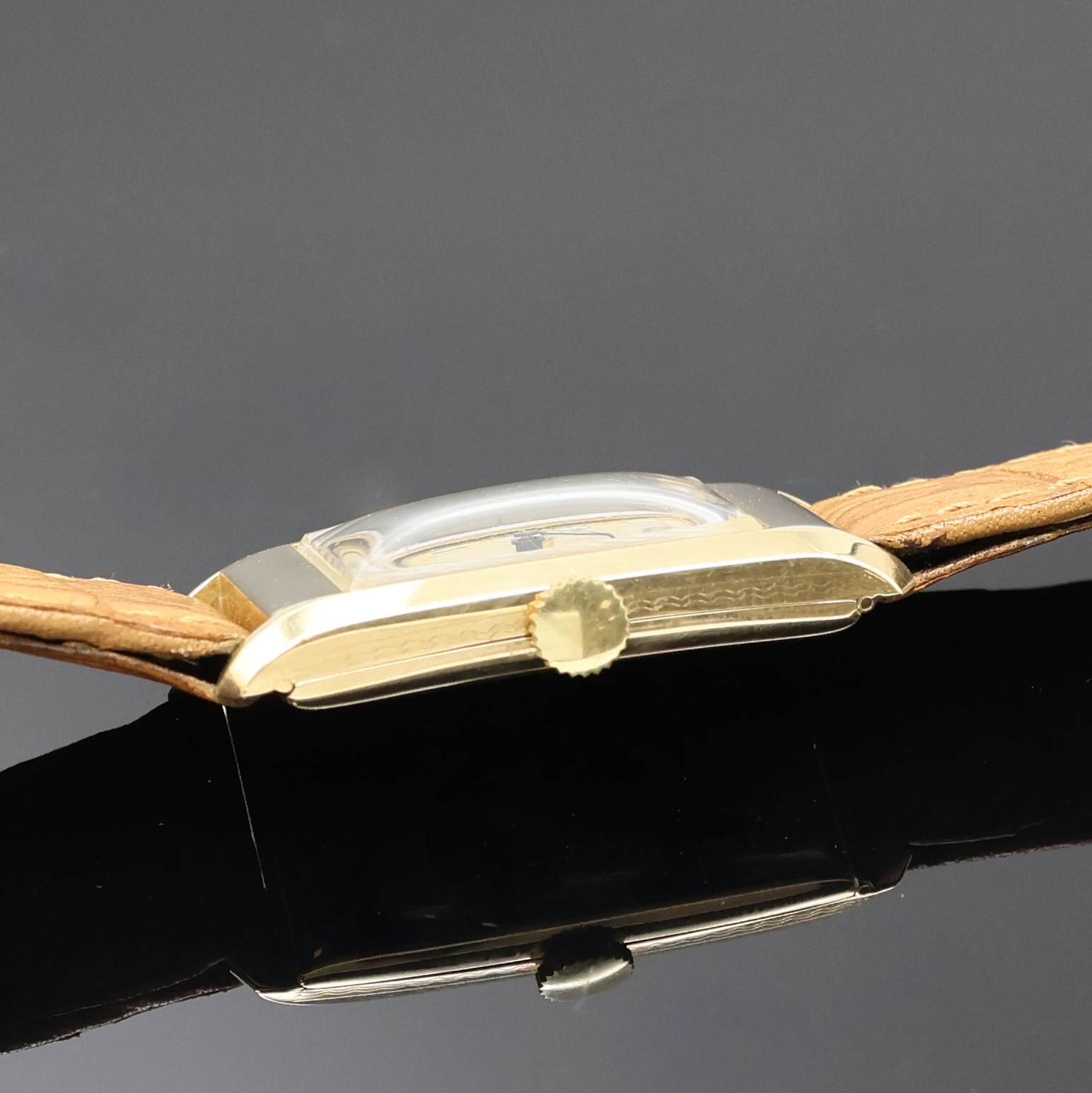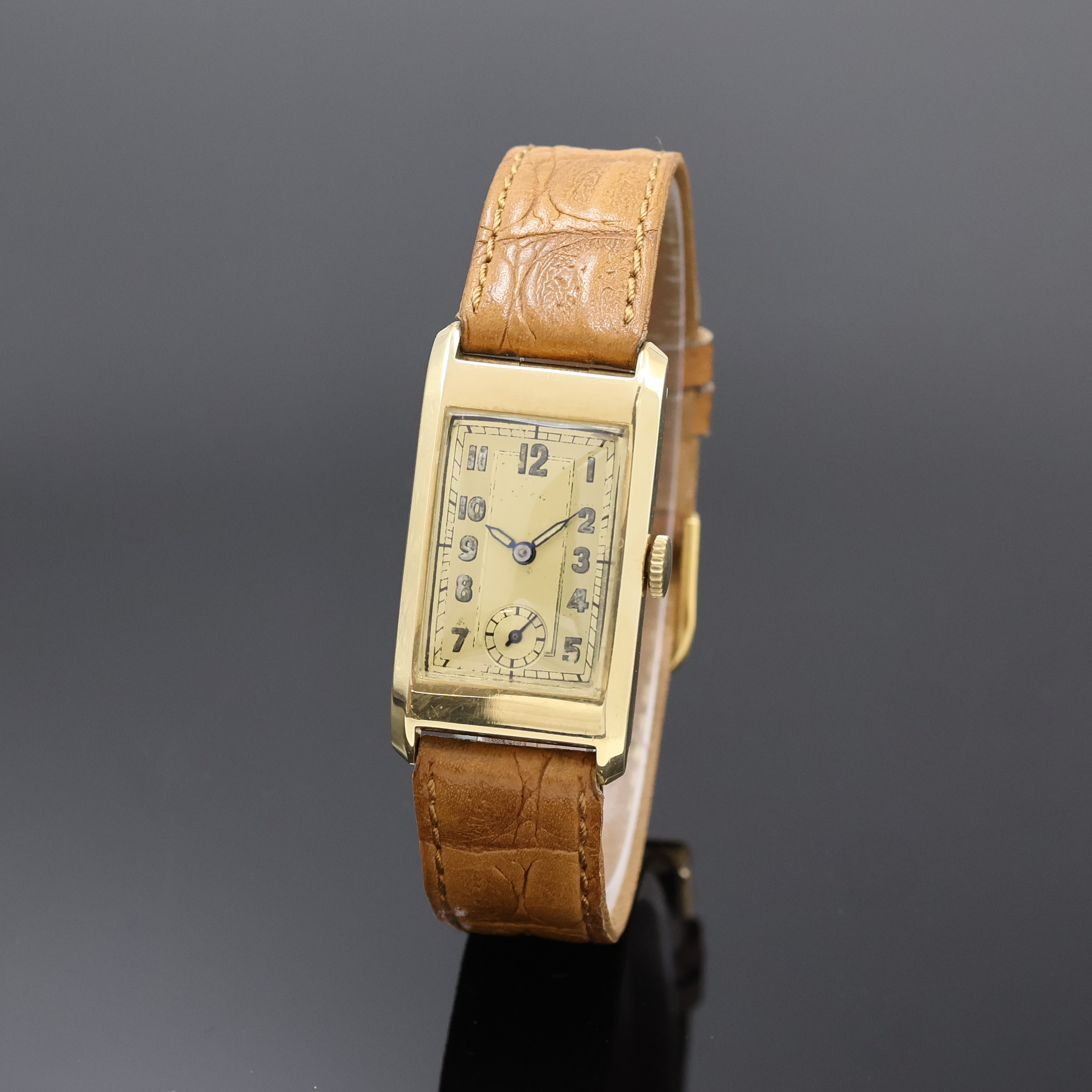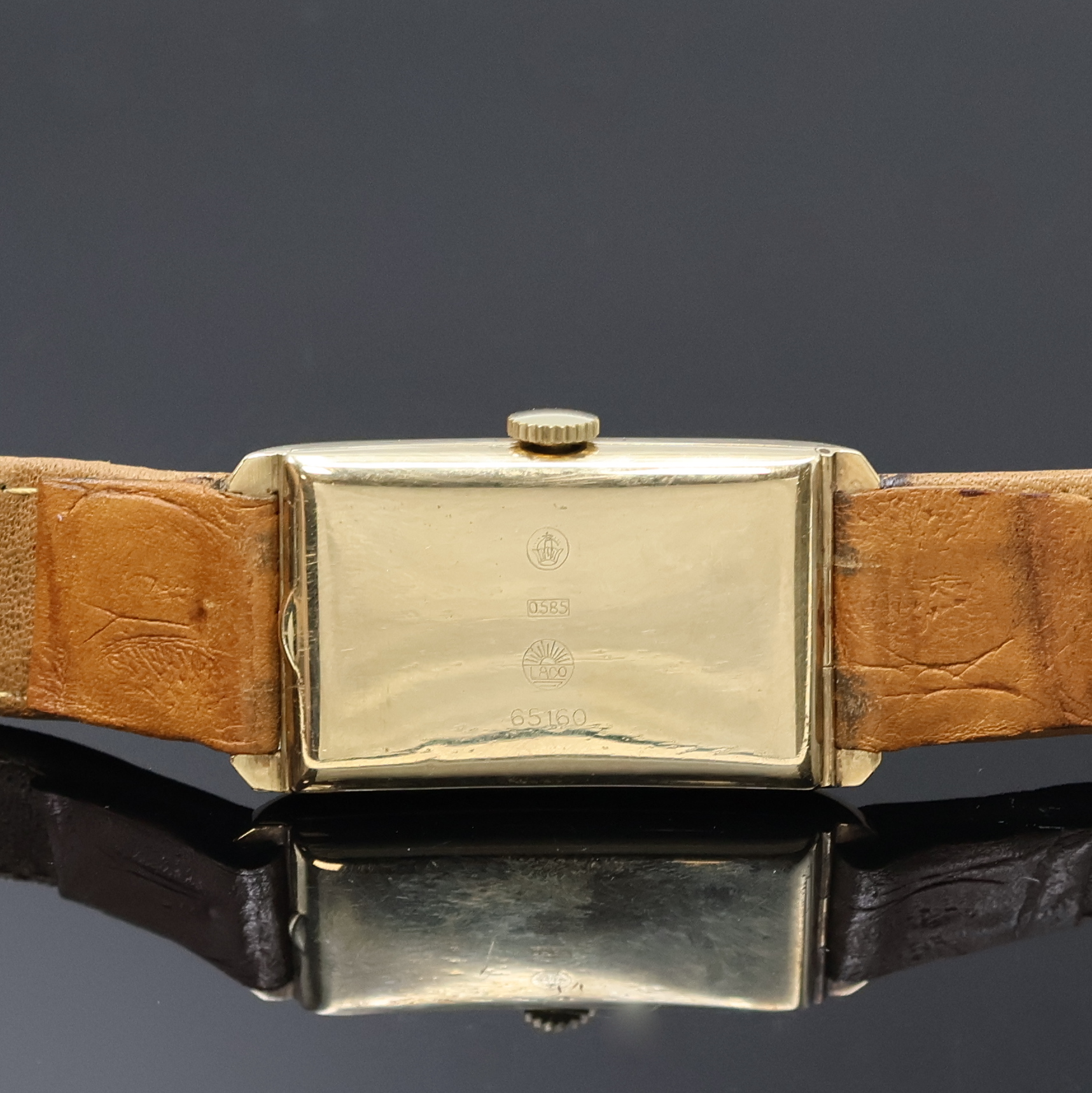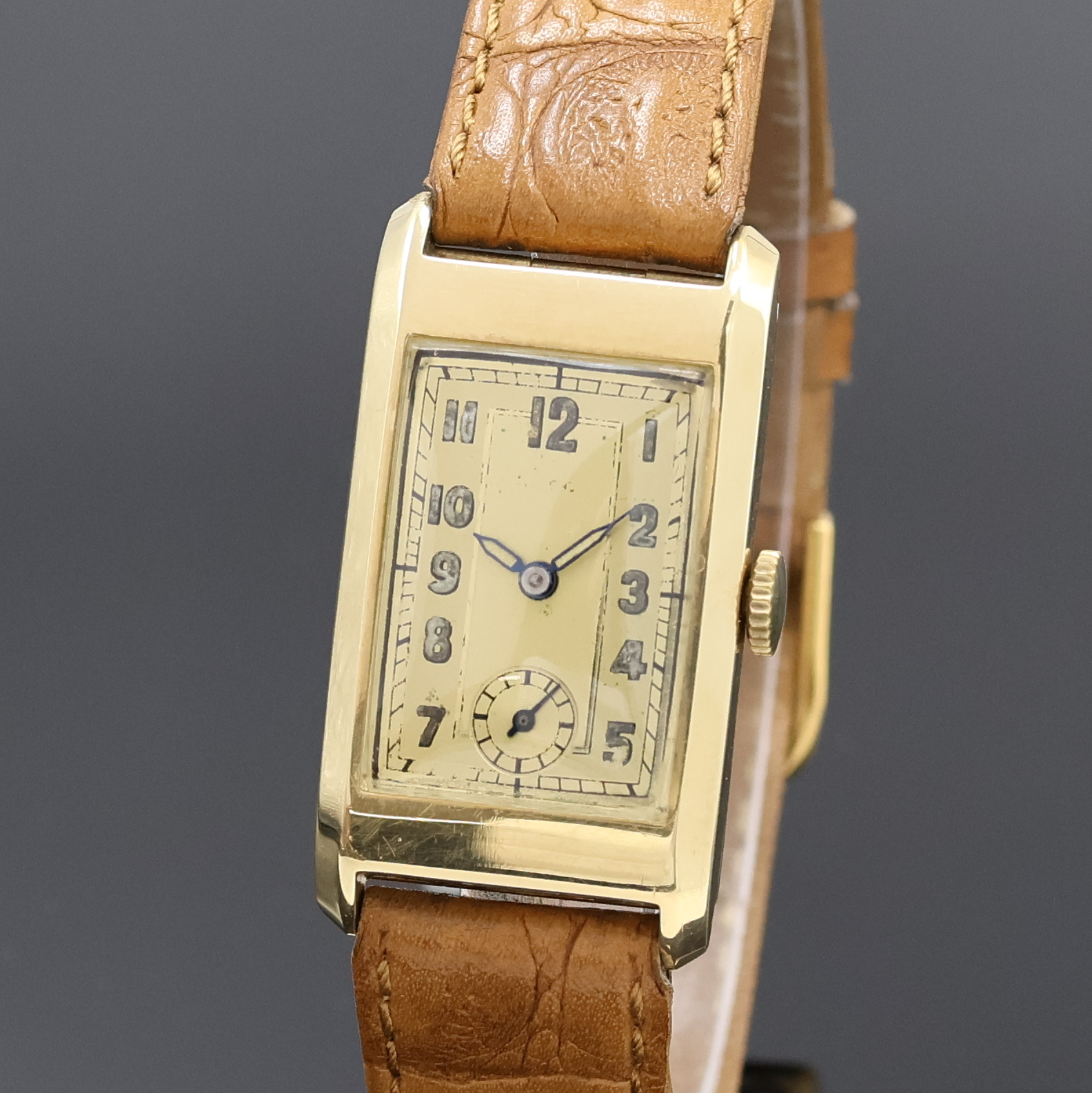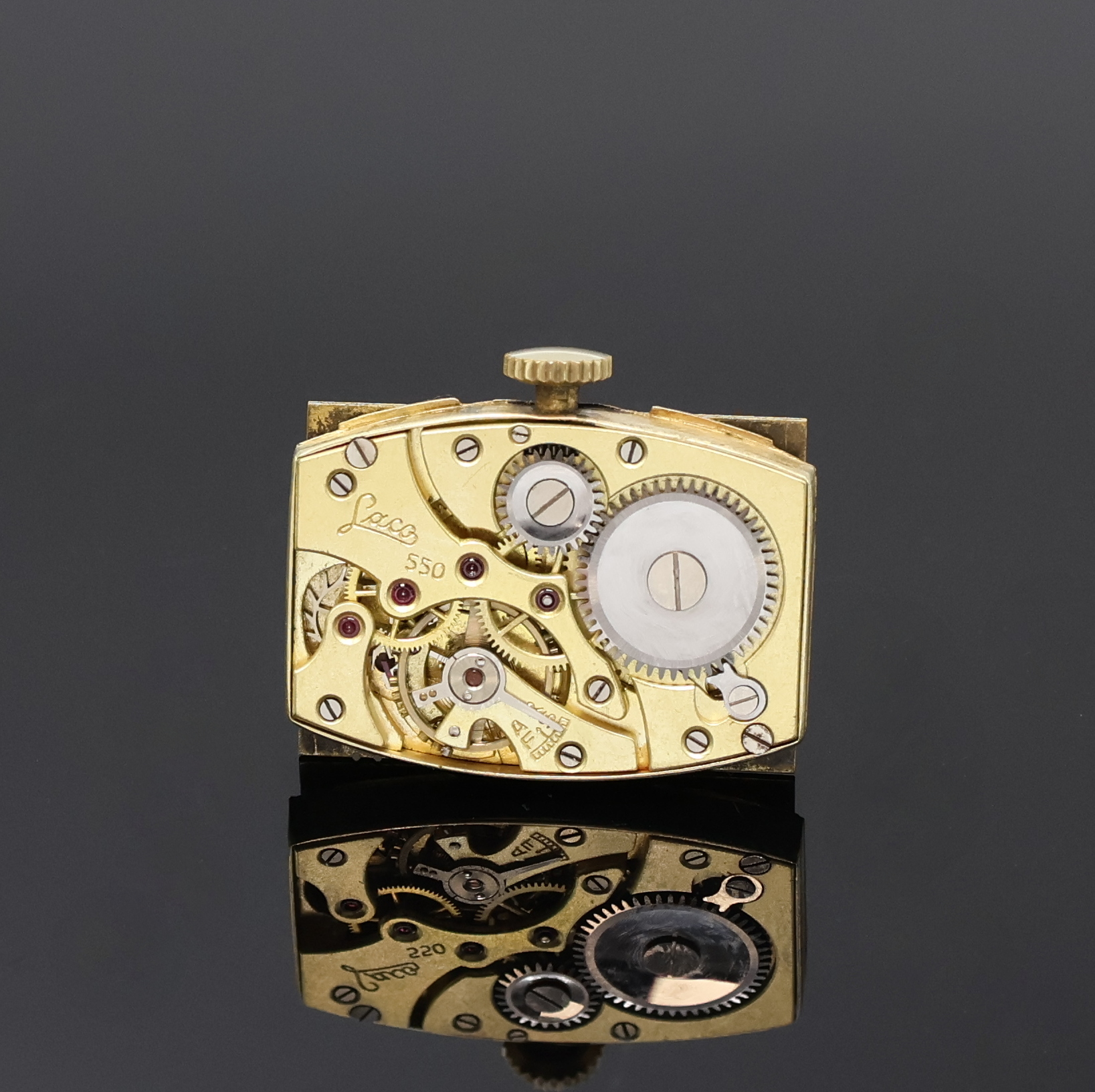 LACO rechteckige Armbanduhr in GG 585/000, Deutschland um 1940, Handaufzug, 2-teil.