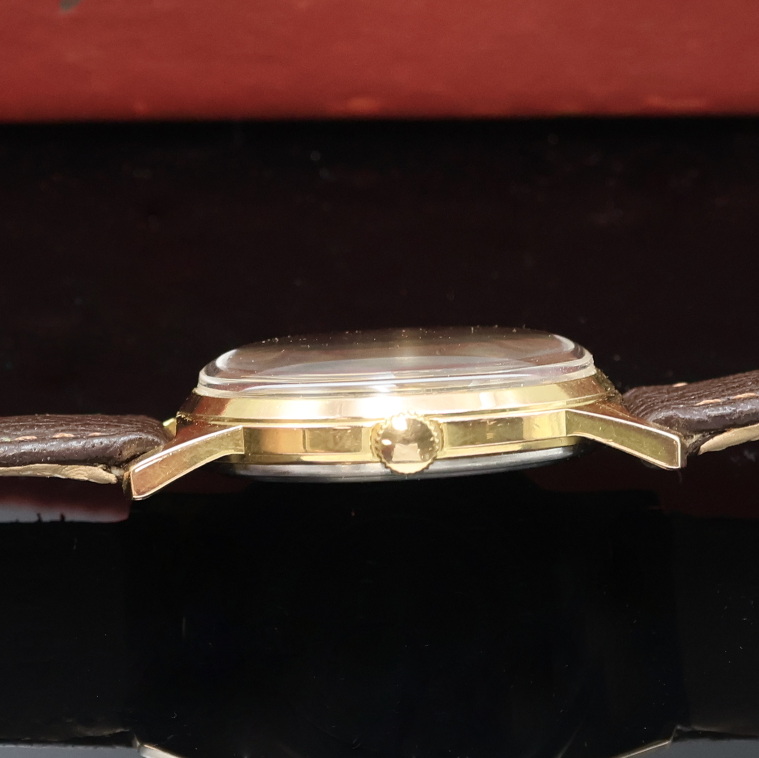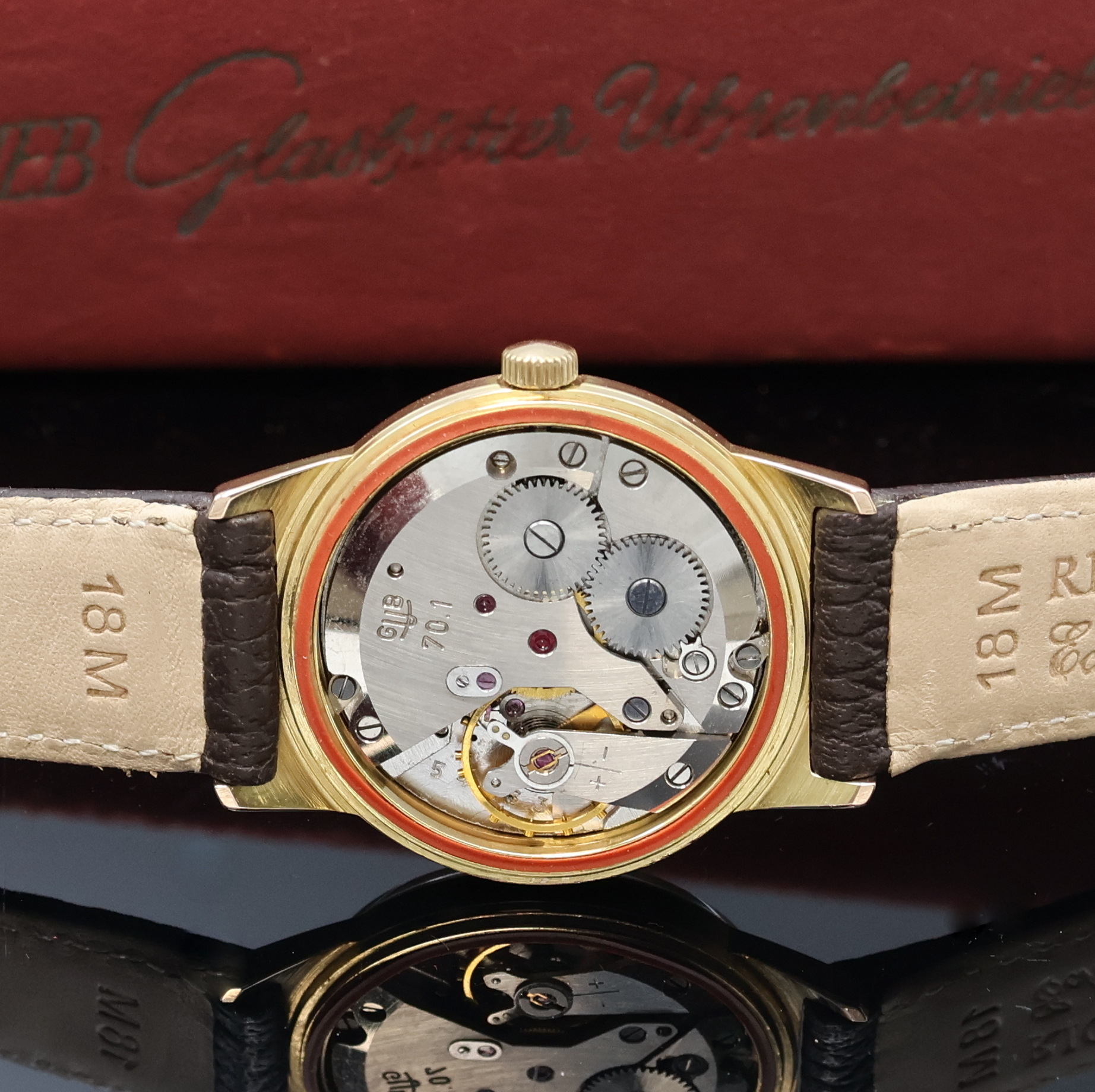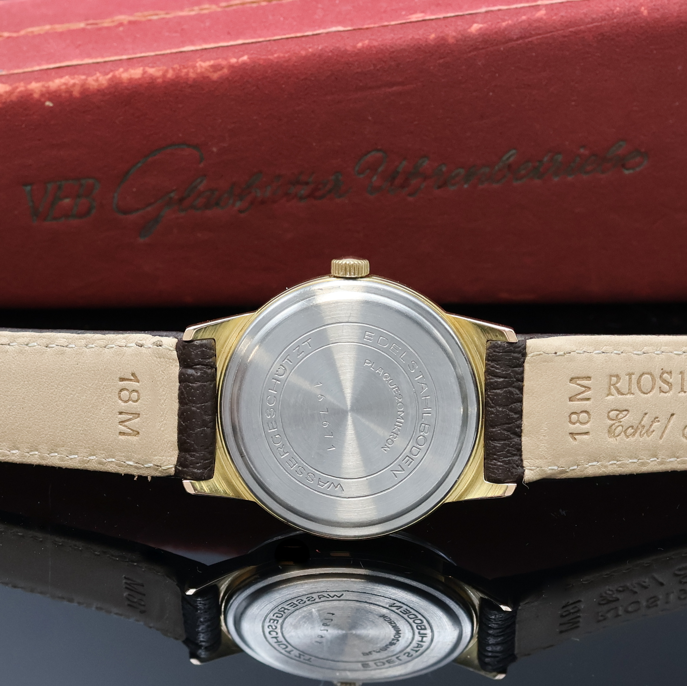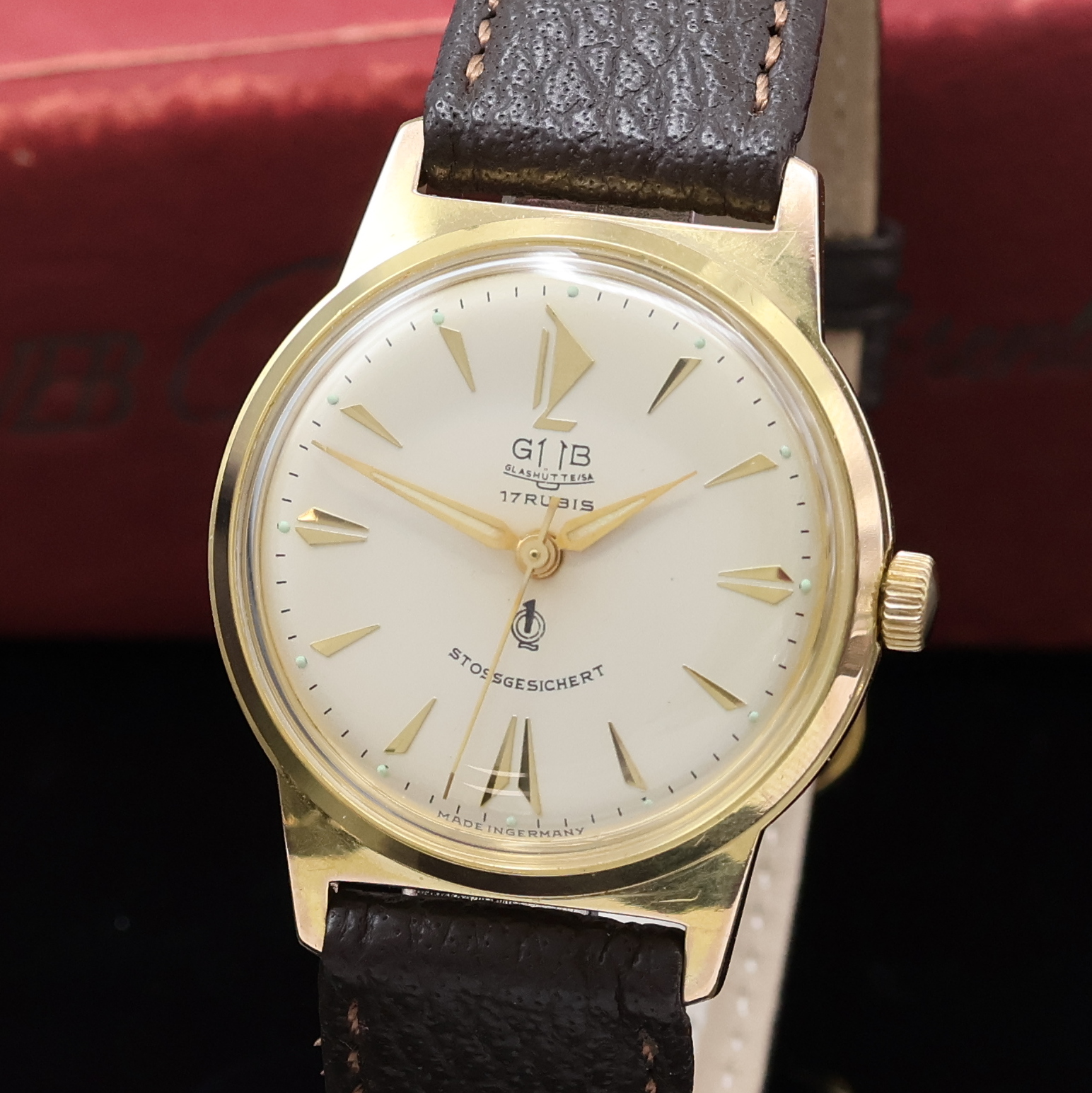 GUB Q1 vergoldete Armbanduhr mit original Box, DDR um 1960, Handaufzug, 2-tlg. Geh.