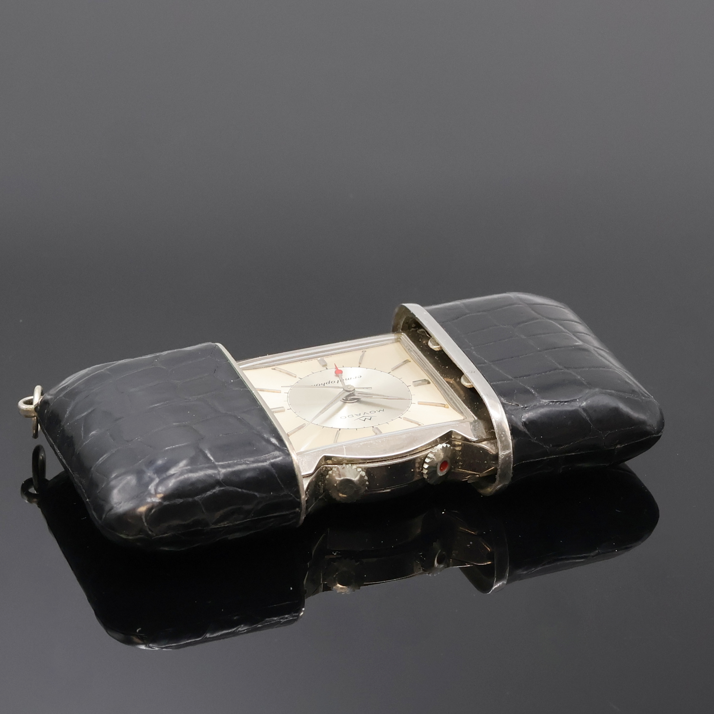 MOVADO Ermetophon Schiebeührchen mit Wecker, Schweiz um 1960, Schiebeaufzug, Leder-