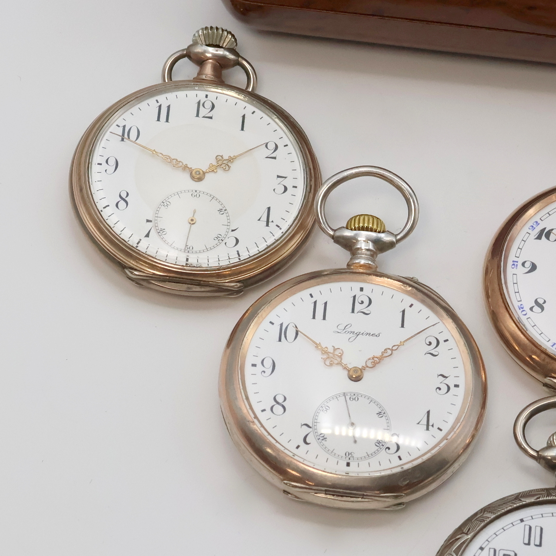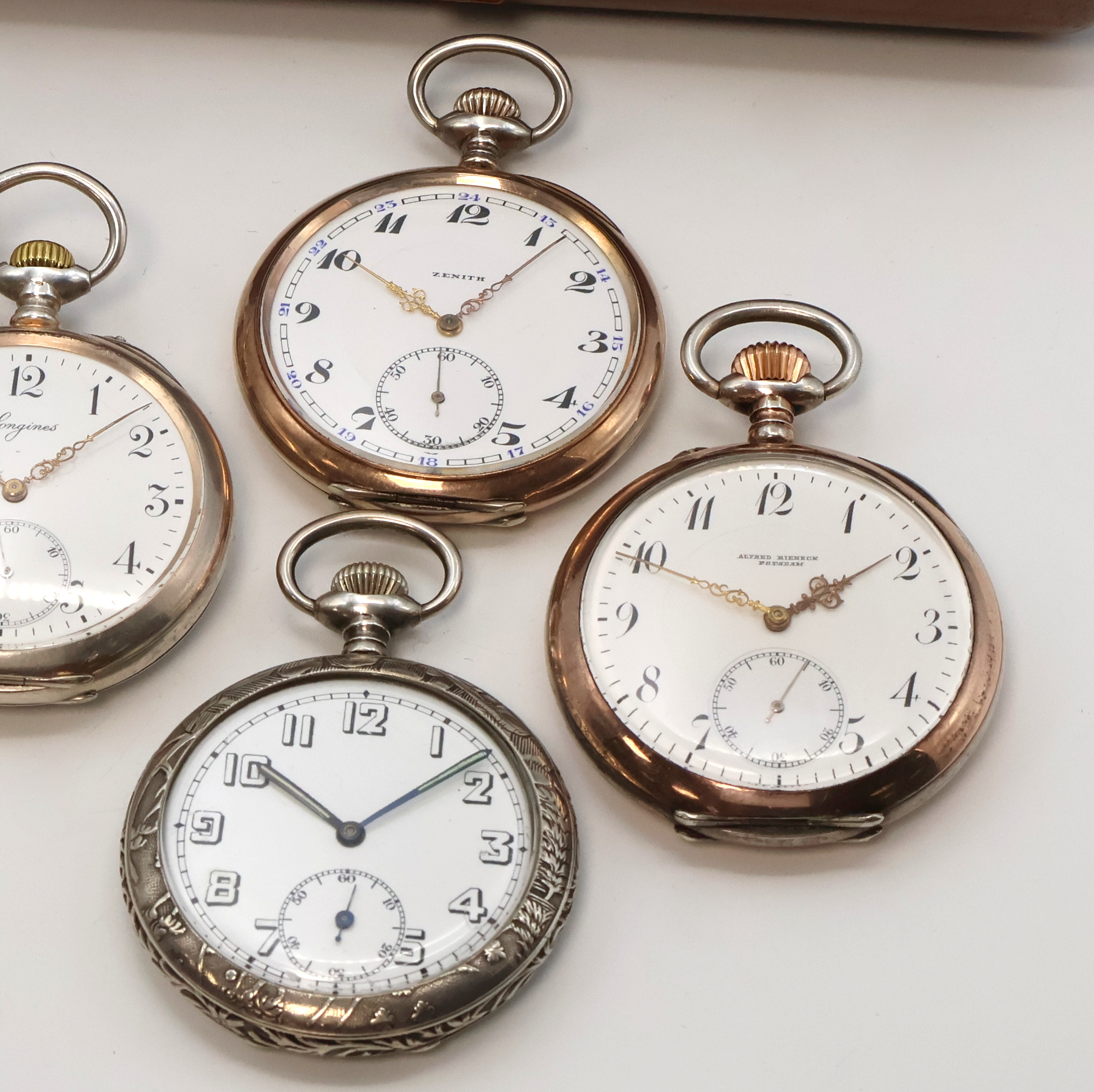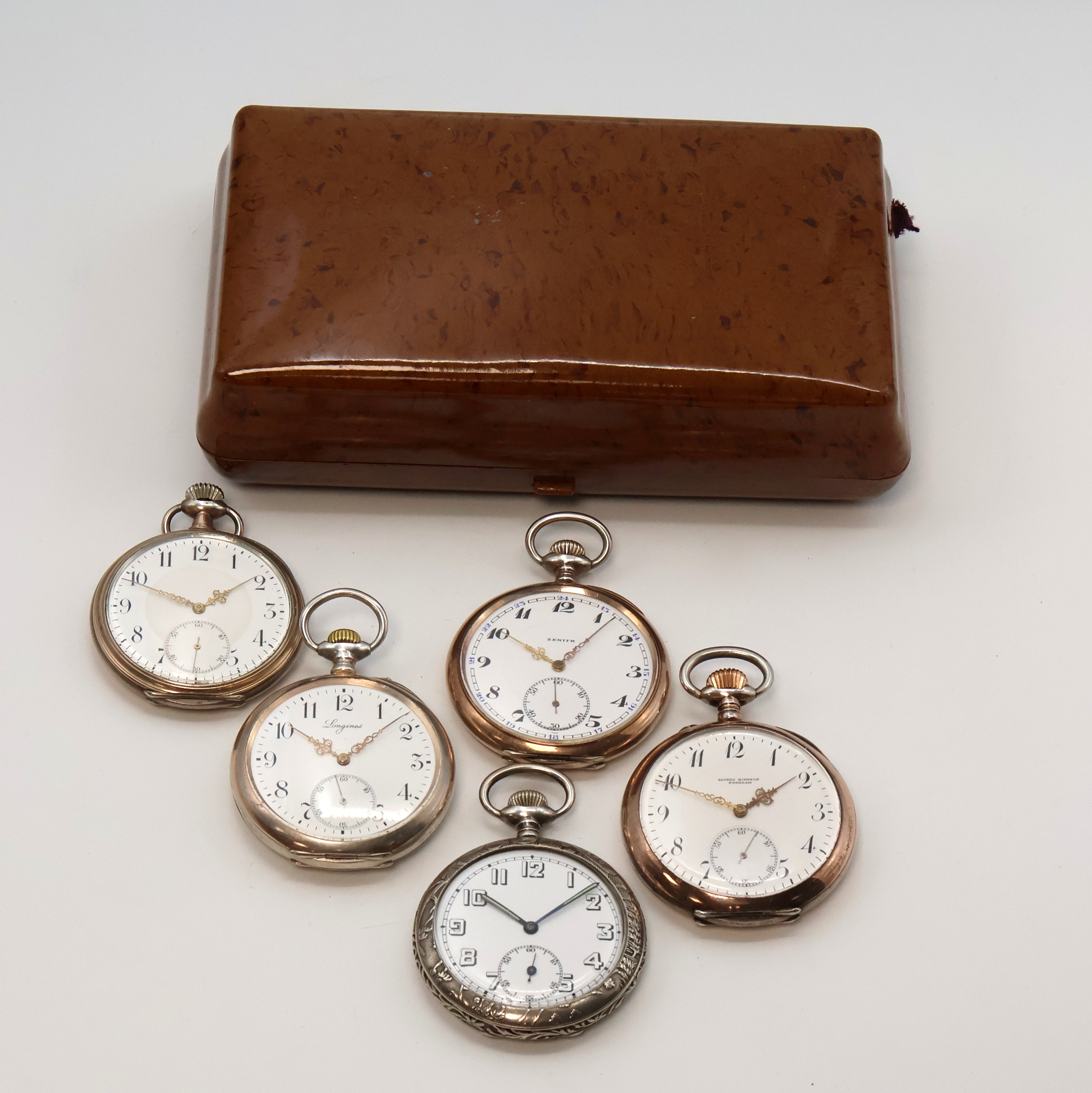 5 offene Silbertaschenuhren, Schweiz um 1910, Geh. dell., 4 x guill. und 1 x floral grav., Emailzifferbl. teils. riss., arab. Zahlen, kl. Sek. bei 6, Zeiger teils. später, Marken wie z. B.: ZENITH, LONGINES, REVUE,.., Ankerwerke, 3 x mit Feinreg., D. ca. 50 bis 53 mm, Gesamtgew. ca. 420g, Etui für 3 Uhren anbei, Überh. unerl., 1 x Glas zu ers., EZ 2-4, aus Sammlungsauflösung