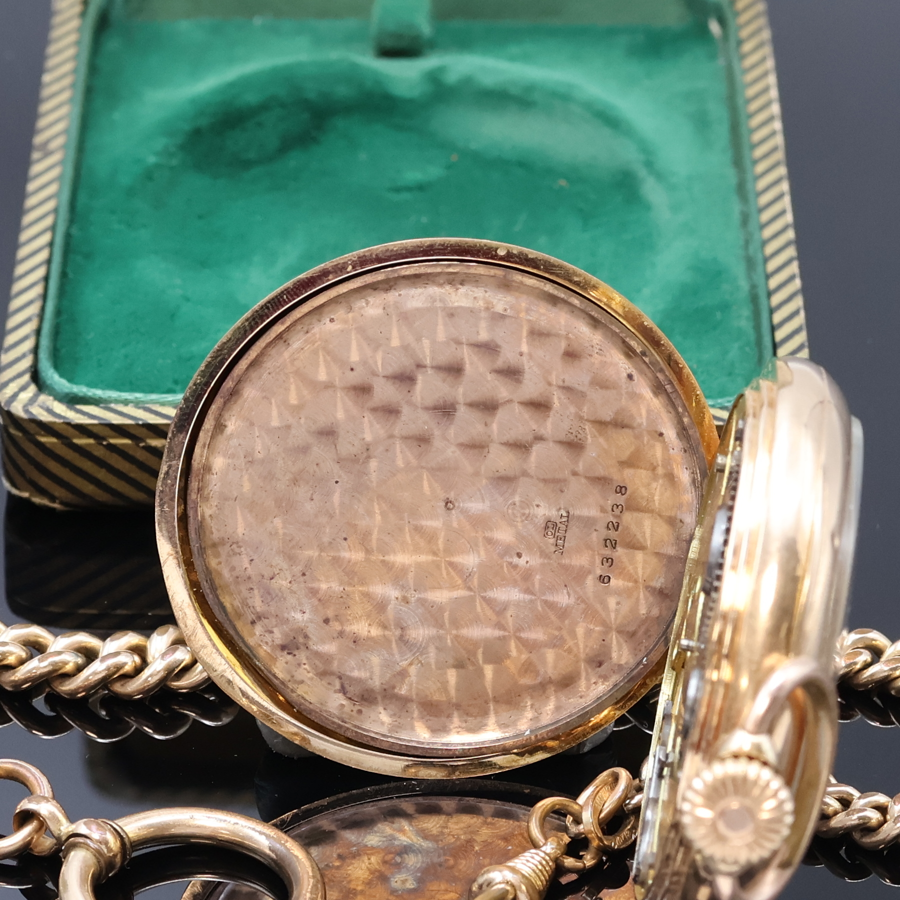 Offene Herrentaschenuhr in RG 585/000, Schweiz um 1910, guill. Geh., Metallcuv.,