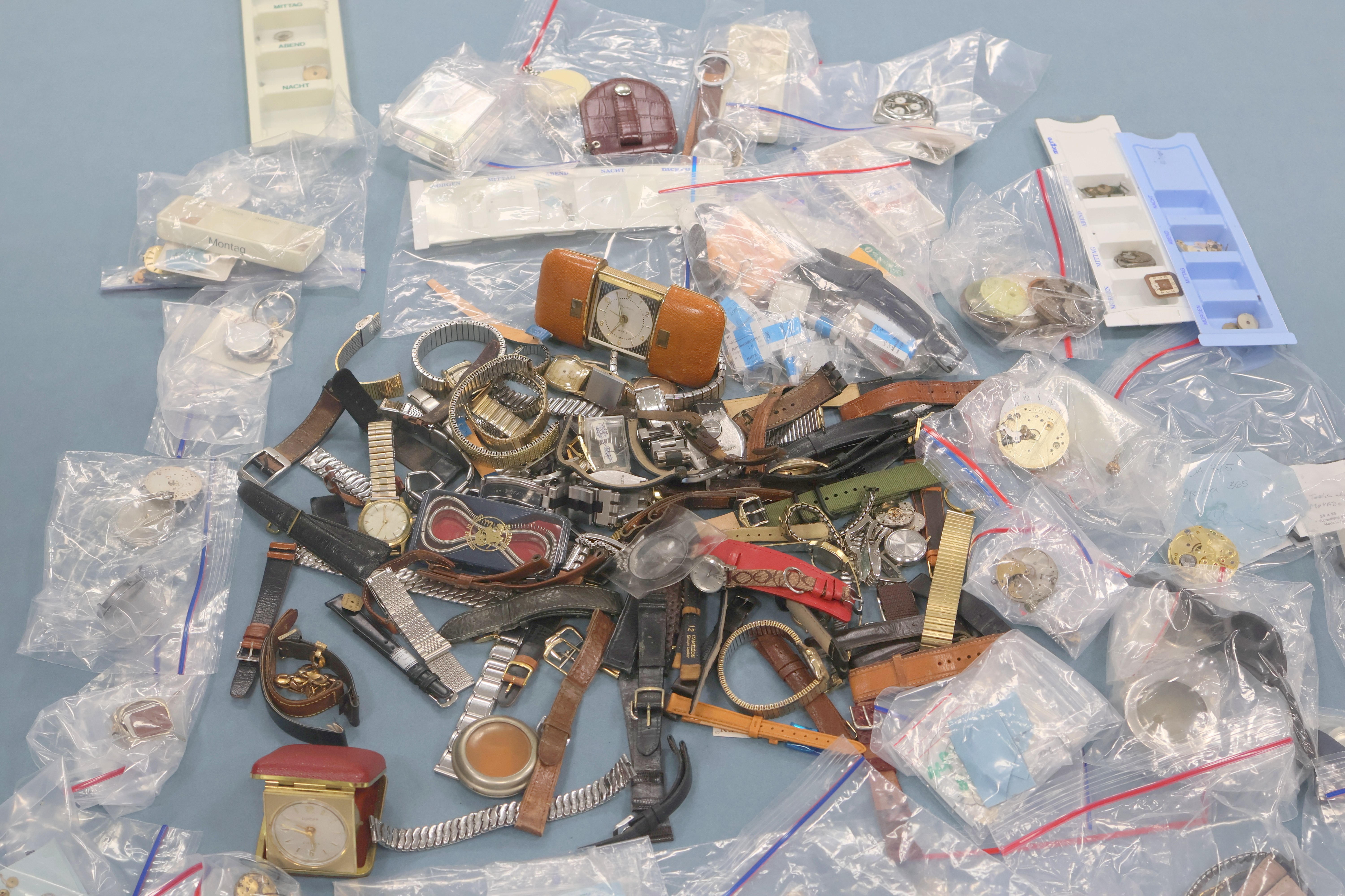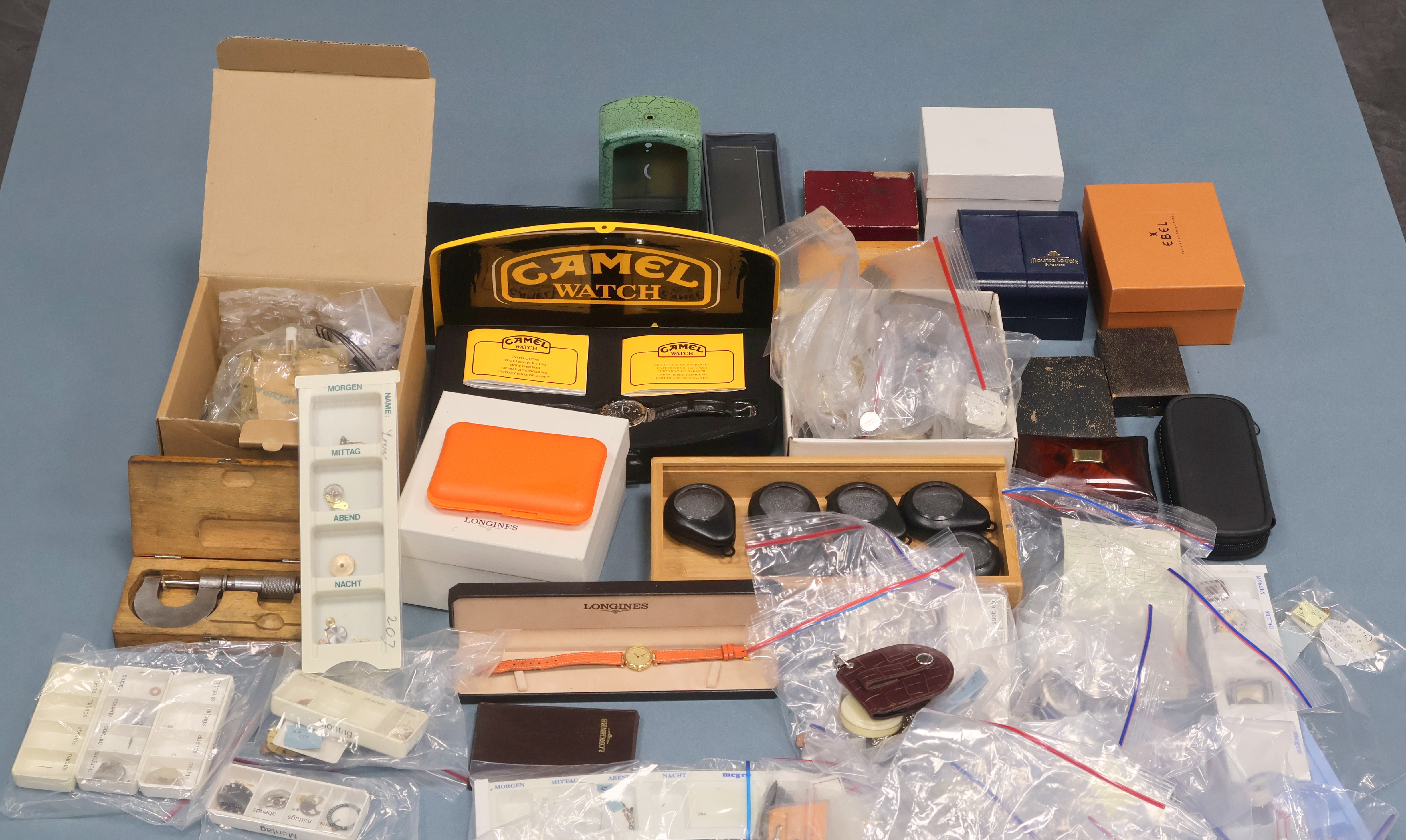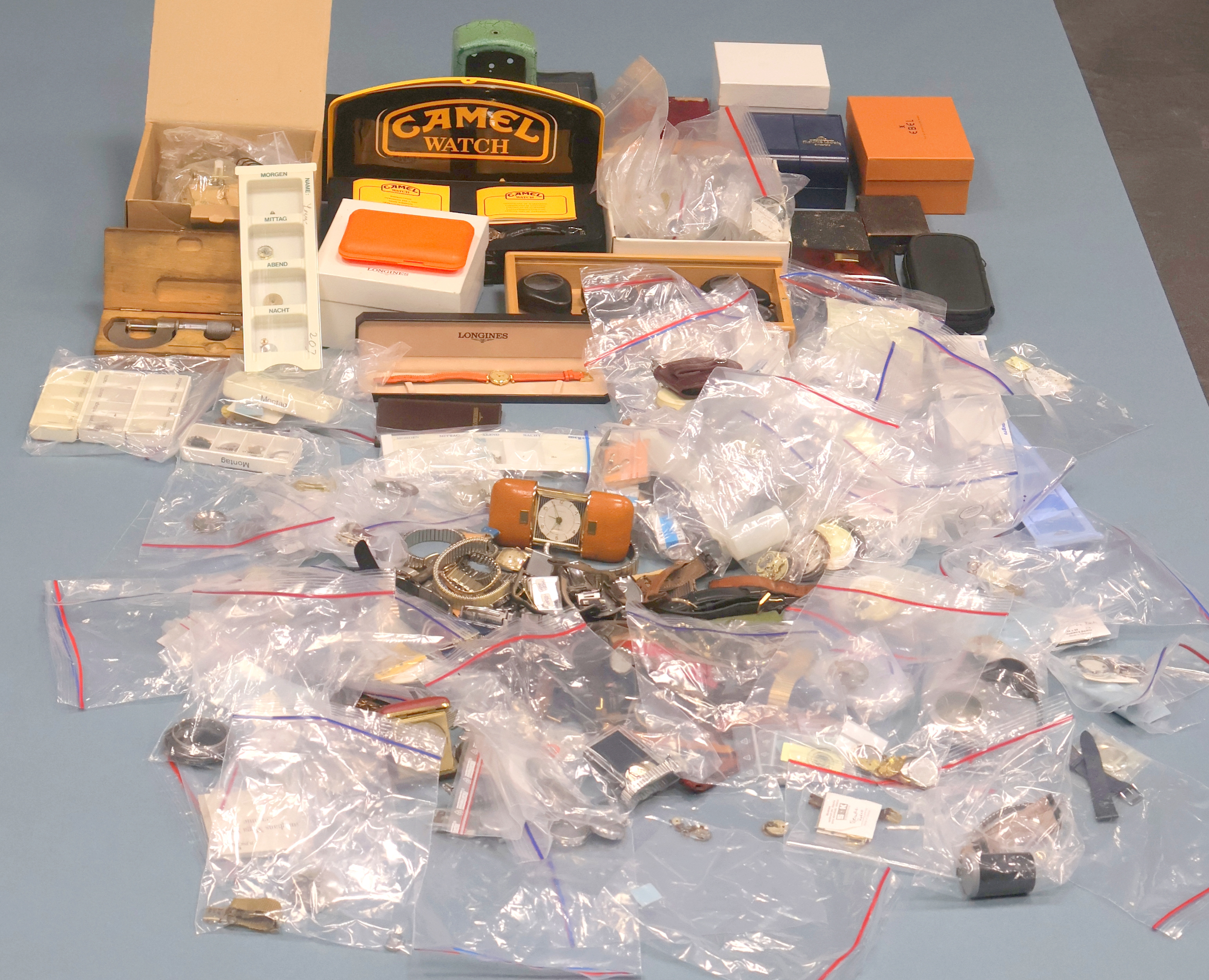Großes Konvolut für Reparaturzwecke, diverse Teile für Armband-, Taschenuhren etc. verschiedener Hersteller, Uhren-Boxen, Armbänder, Zifferblätter und vieles mehr