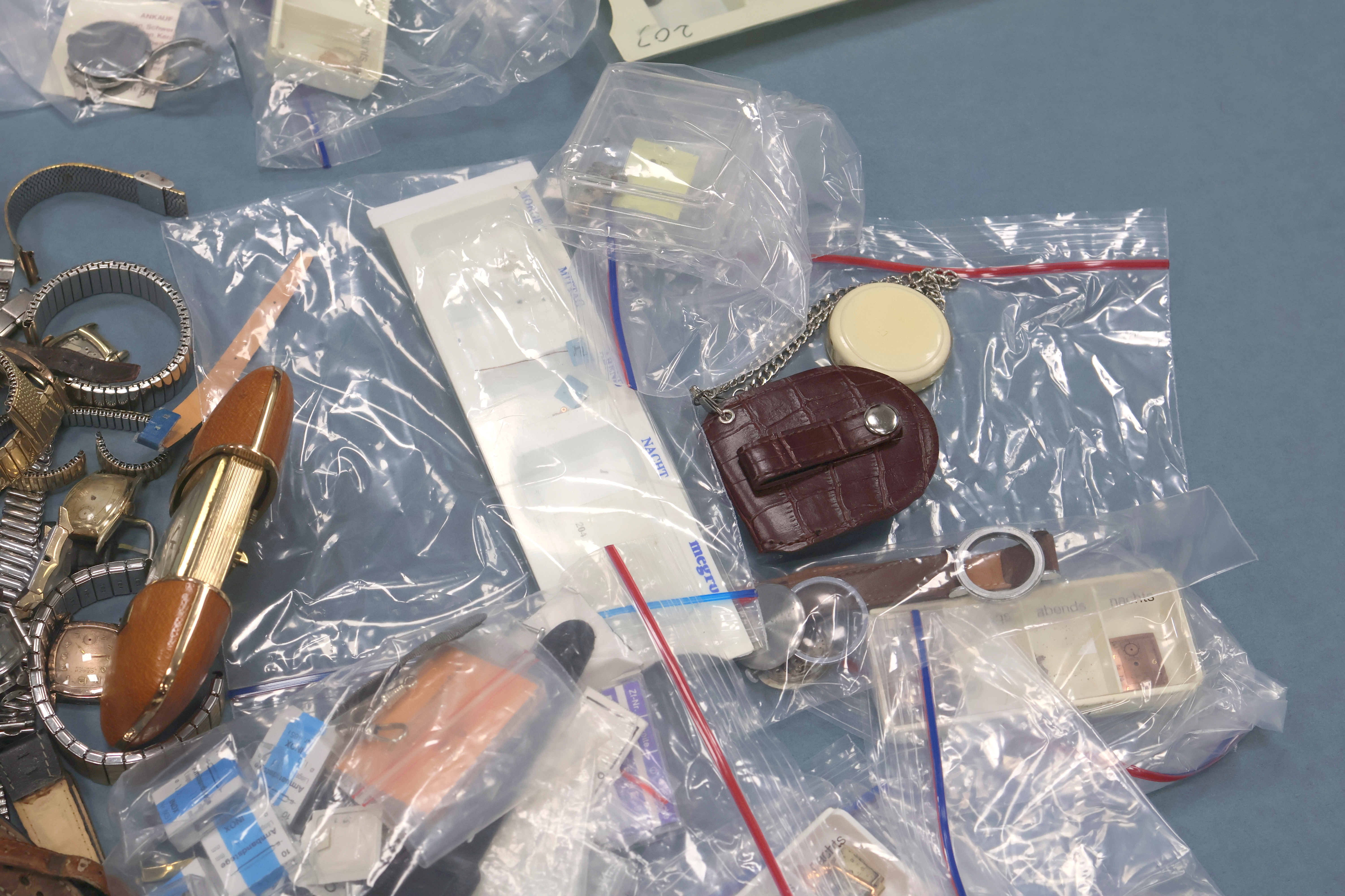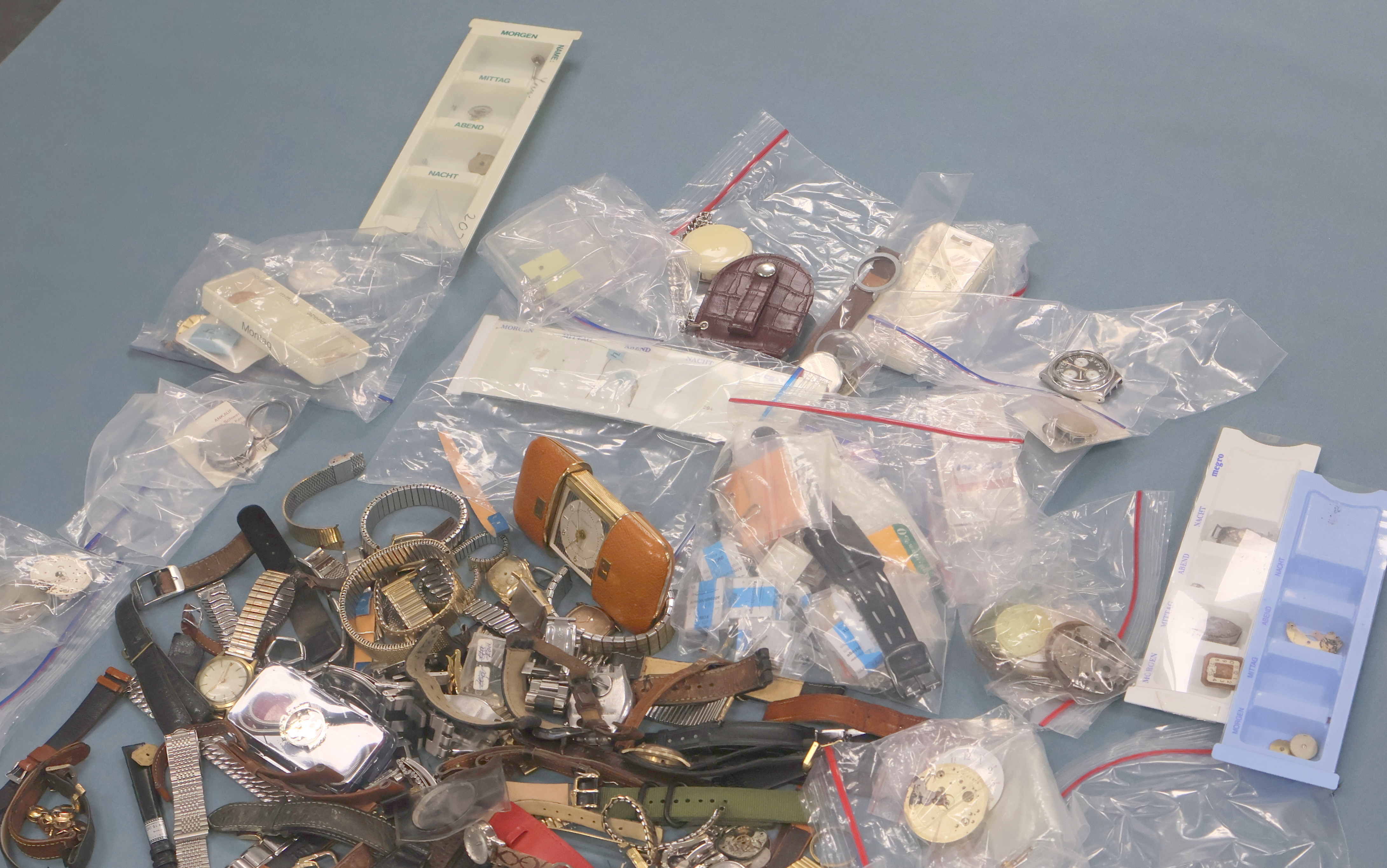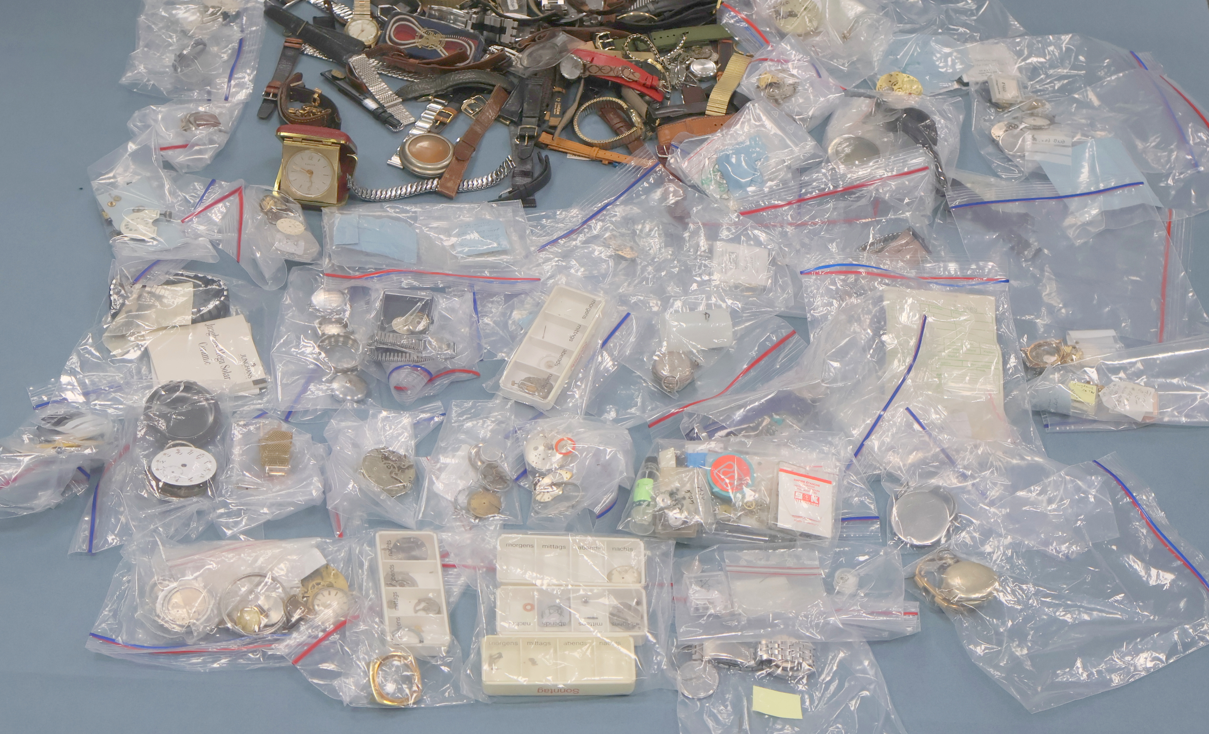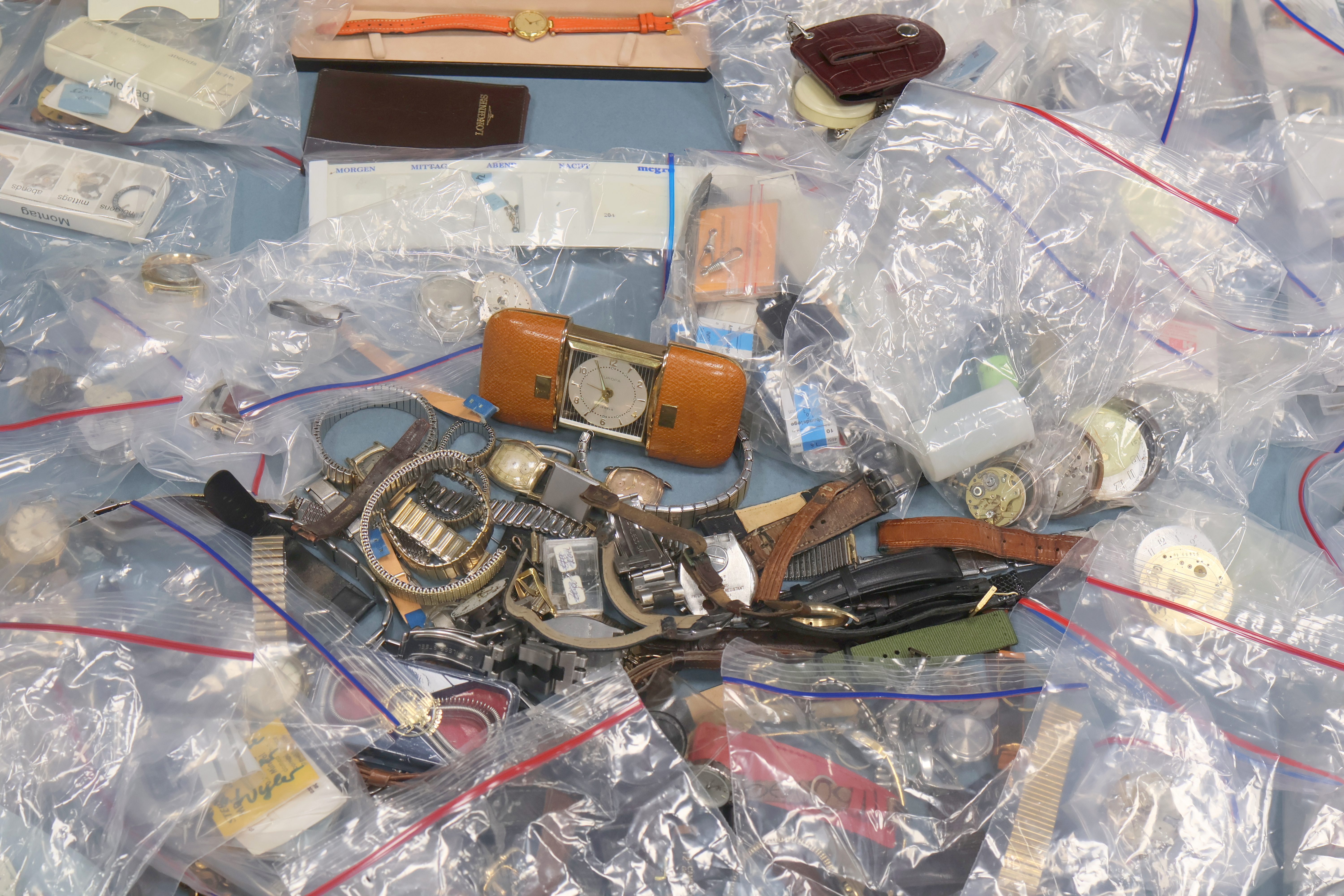 Großes Konvolut für Reparaturzwecke, diverse Teile für Armband-, Taschenuhren etc. verschiedener Hersteller, Uhren-Boxen, Armbänder, Zifferblätter und vieles mehr