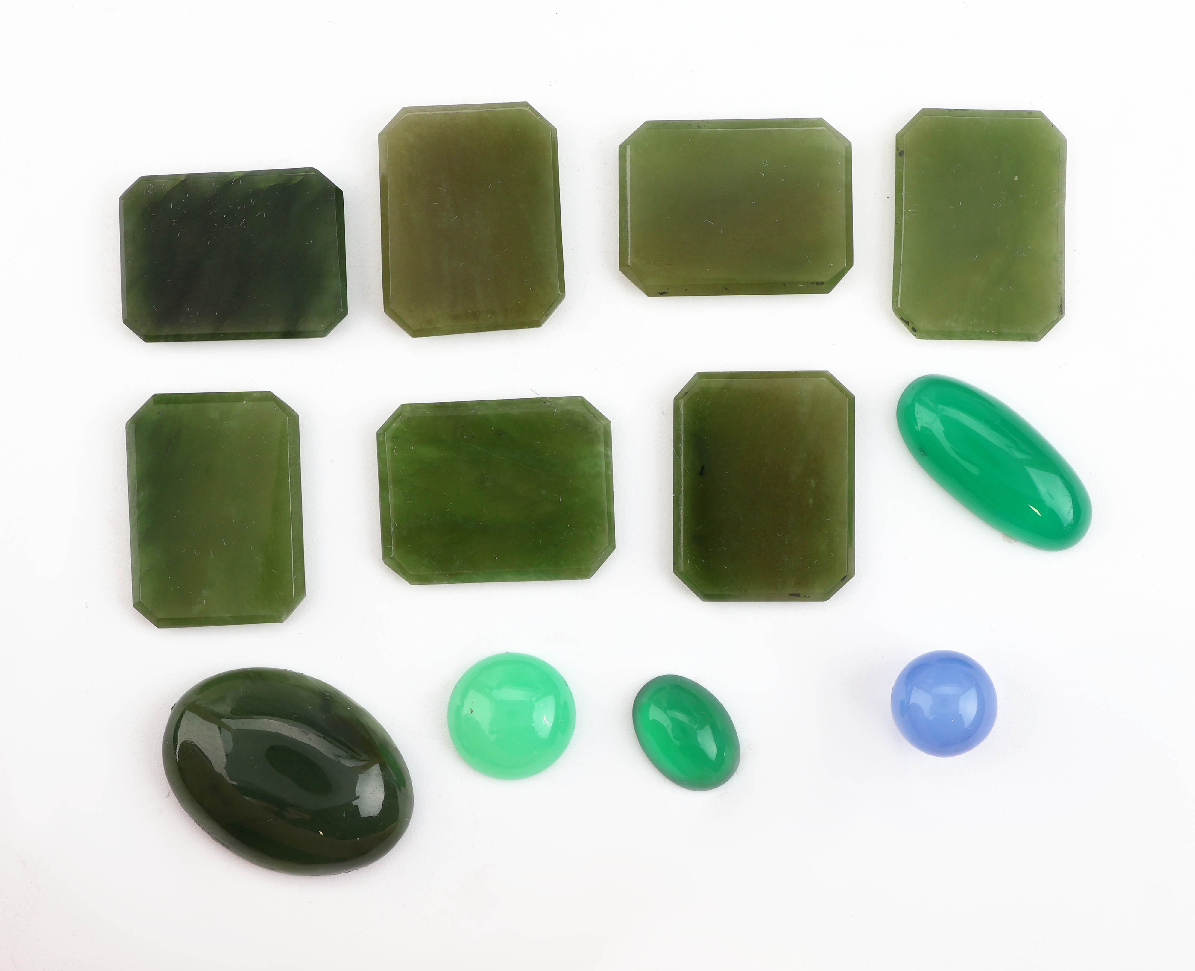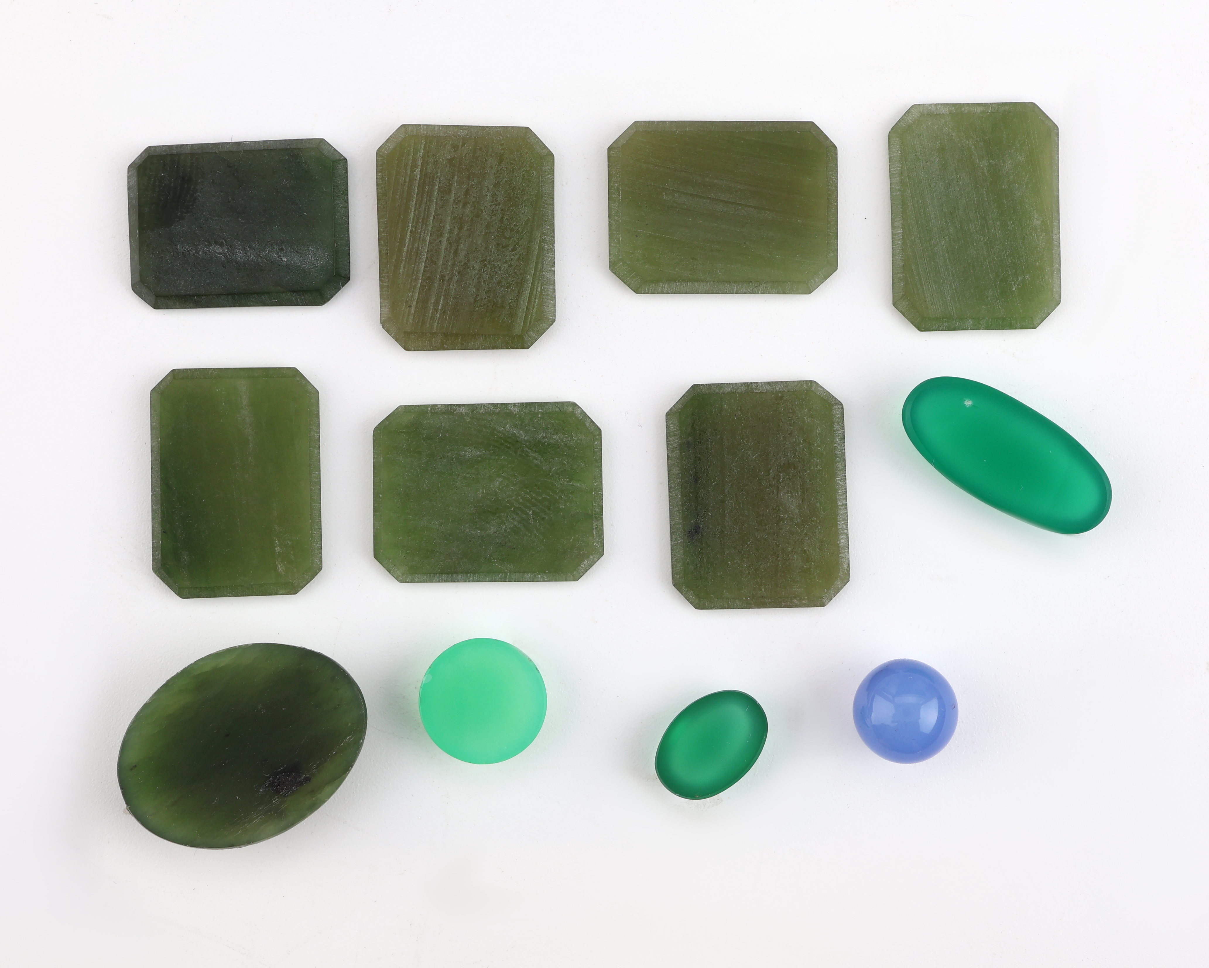 Lot 12 lose Achate zus. 78.9 ct, in versch. Formen und Farben, überwiegend Grün Schätzpreis: 300, - EUR