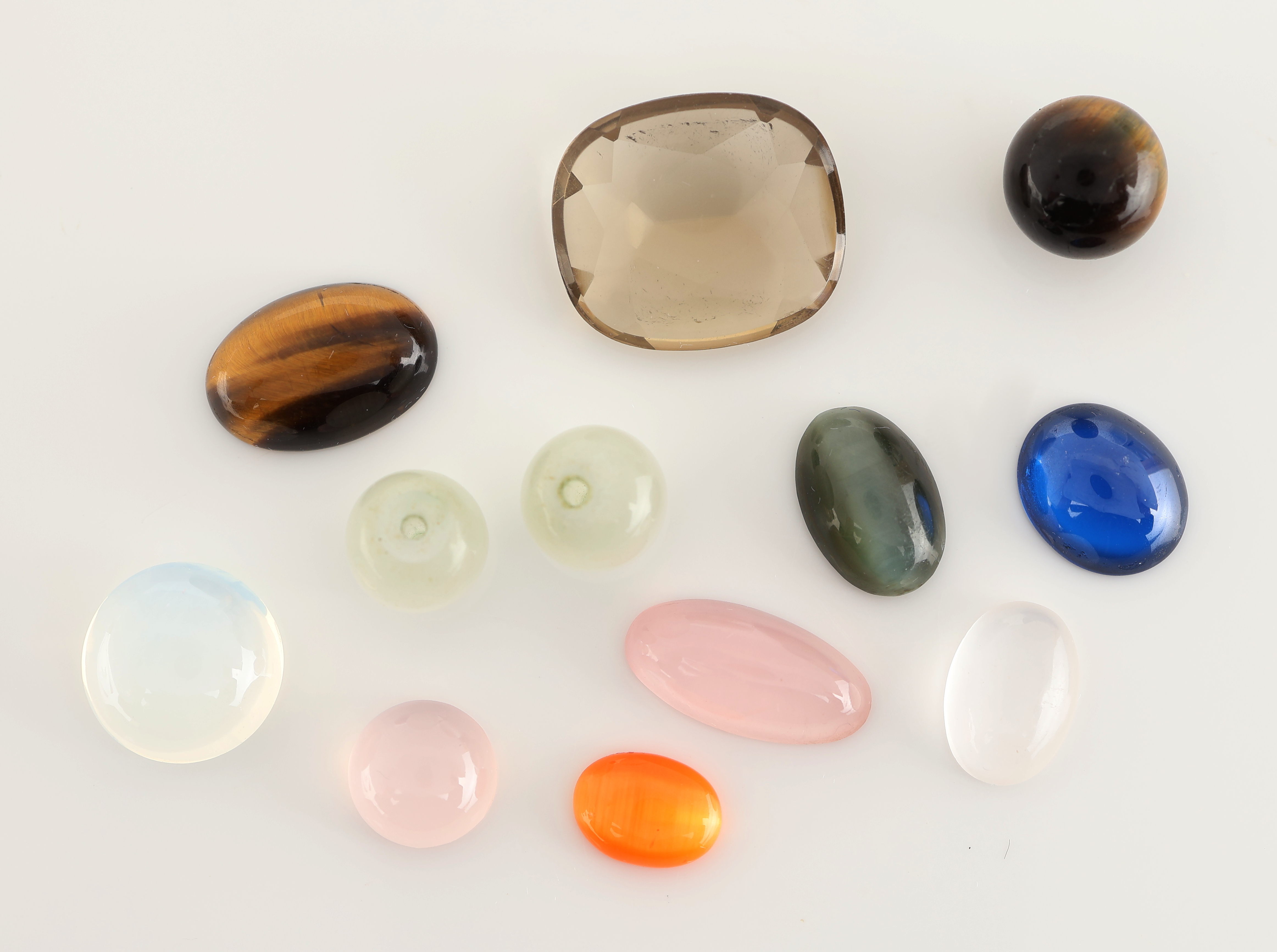 Lot 12 lose Farbsteine, zus. ca. 40.70 ct, u.a. Rosenquarz, Tigerauge, Mondstein,