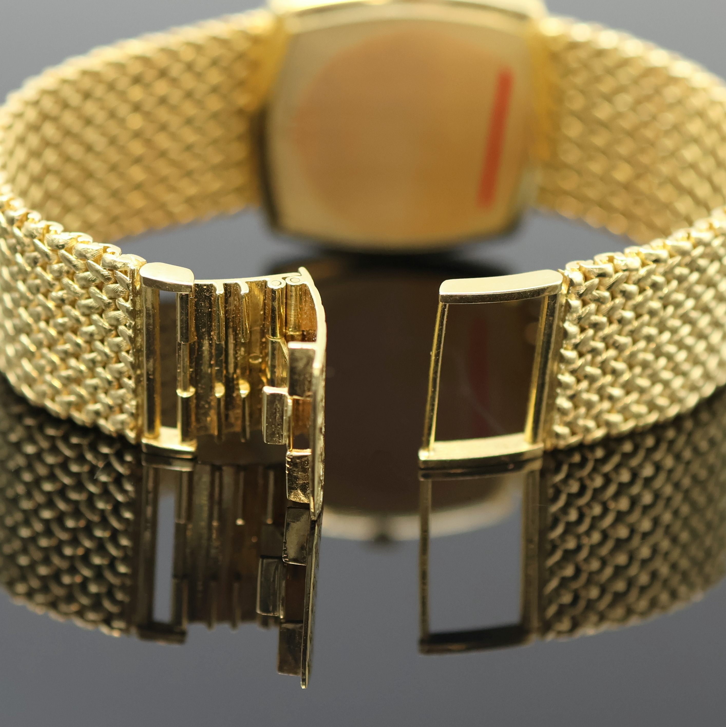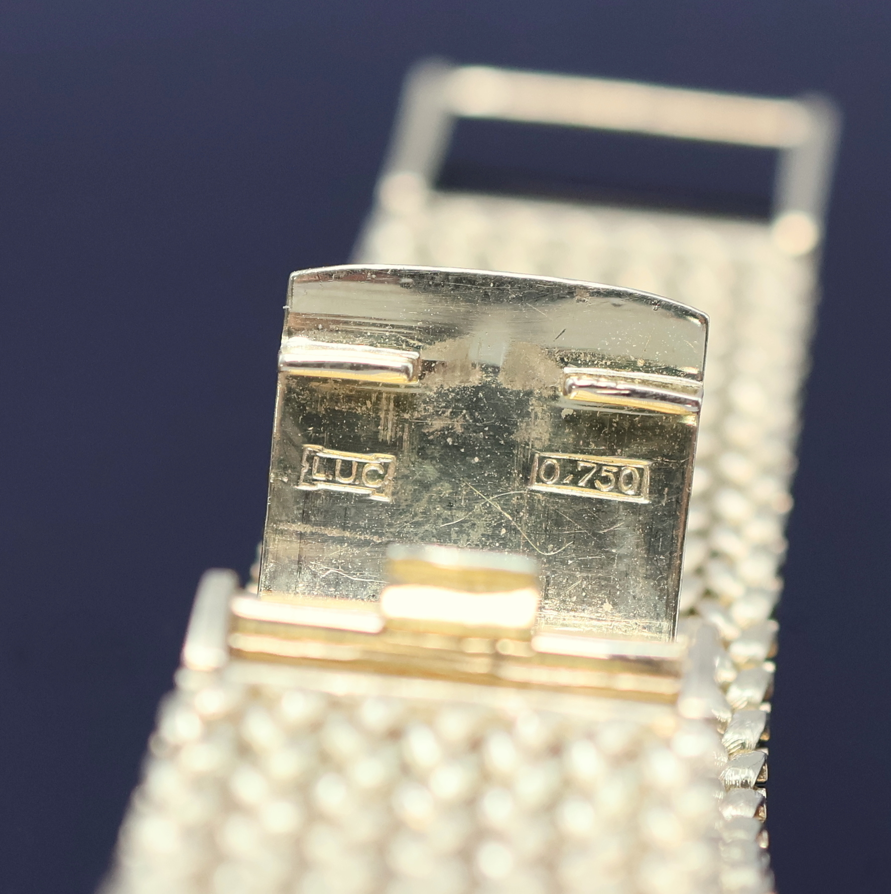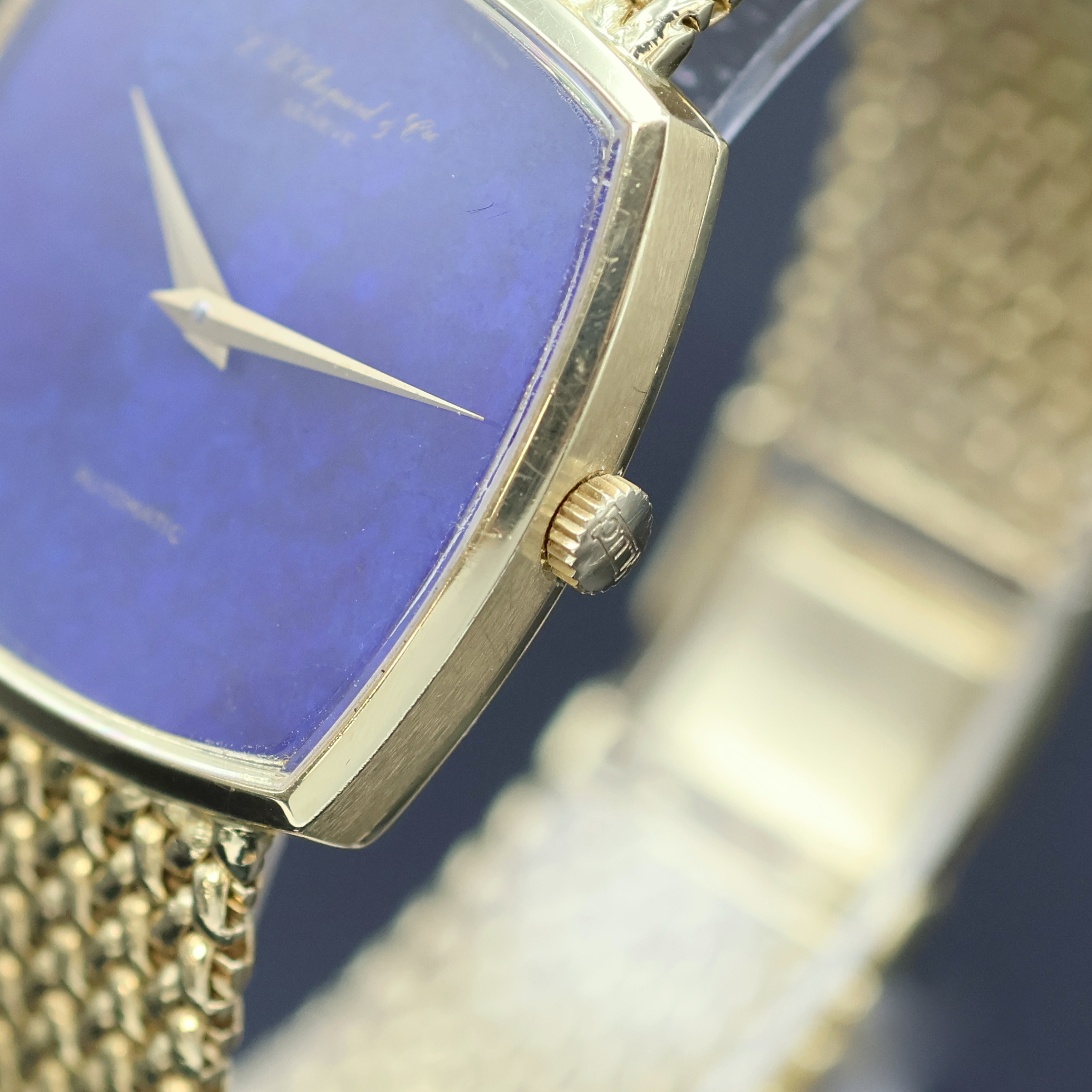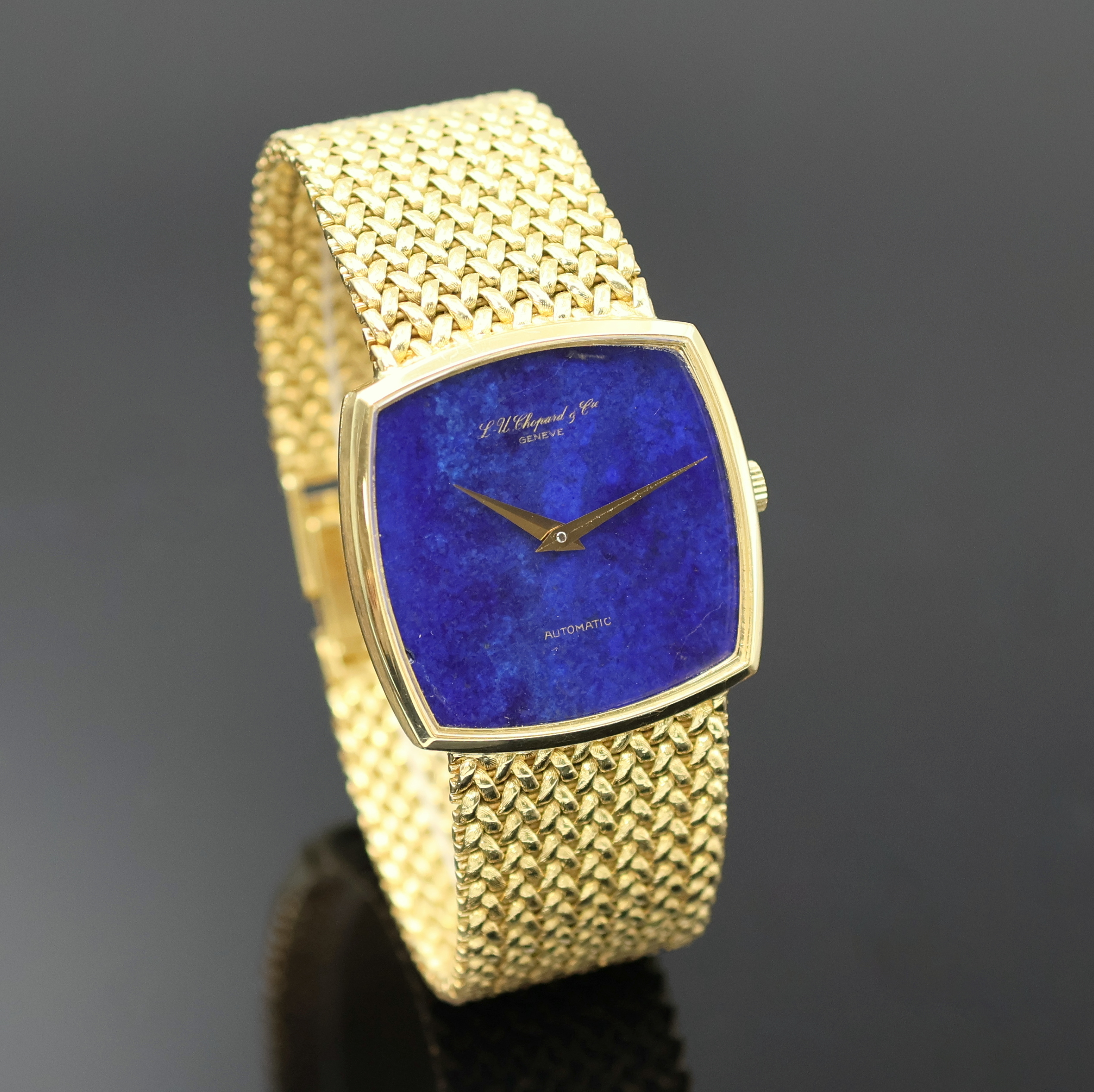 CHOPARD Armbanduhr in GG 750/000, Schweiz um 1975, Automatik, orig. Goldband, Boden aufgedr., Lapislazuli-Zifferbl. besch., gold. Zeiger, verg. Werk Kal. 90 m. Streifenschl., 30 St., Microrotor, Feinreg., M. ca. 31 x 31 mm, L. ca. 18 cm, Gew. ca. 84g, Aufzug zu rep., Überh. empf., EZ 2