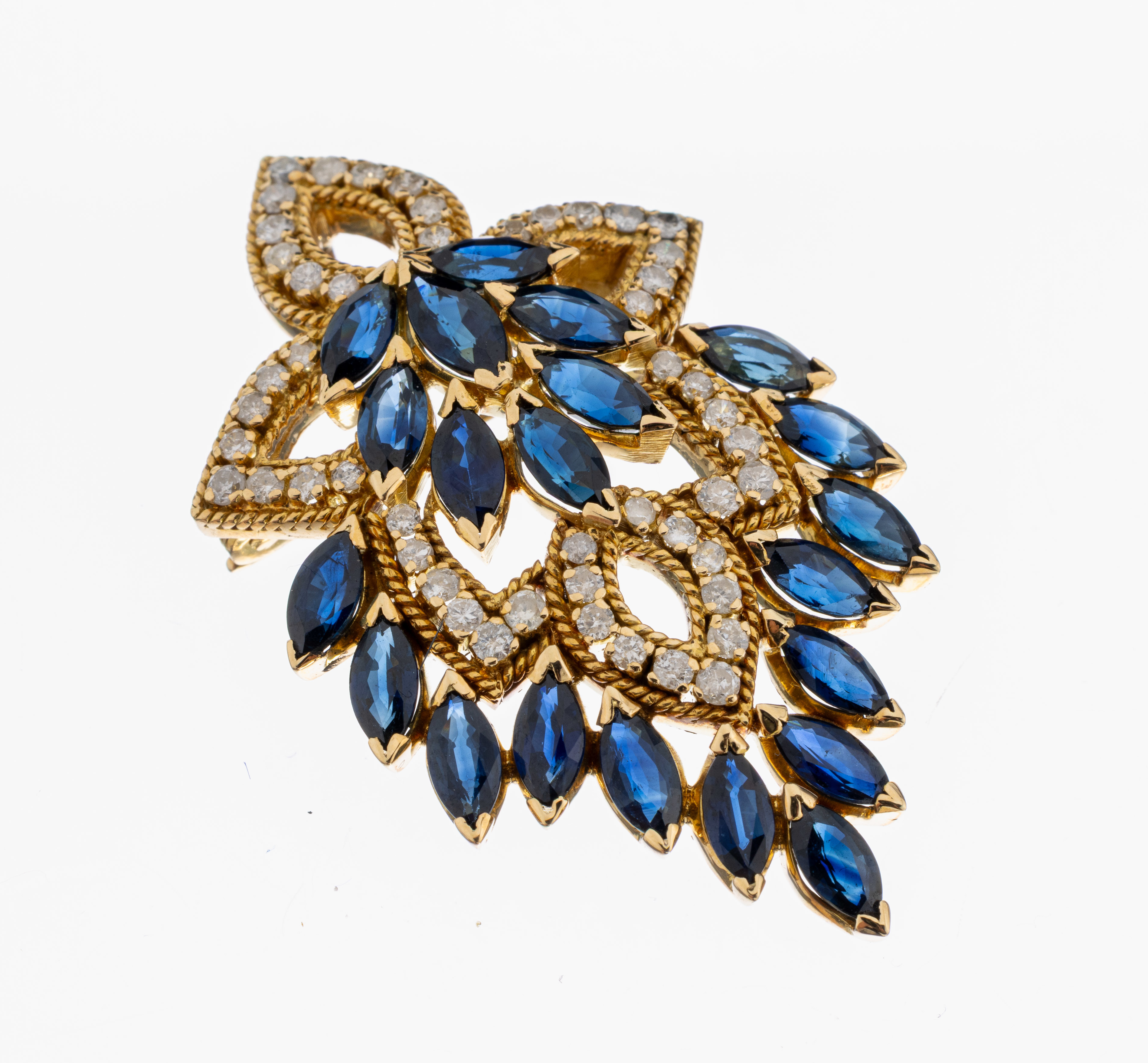 18 kt Gold Brillant-Saphir-Brosche, GG 750/000, 50 Brillanten zus. ca. 1.50 ct Weiß-