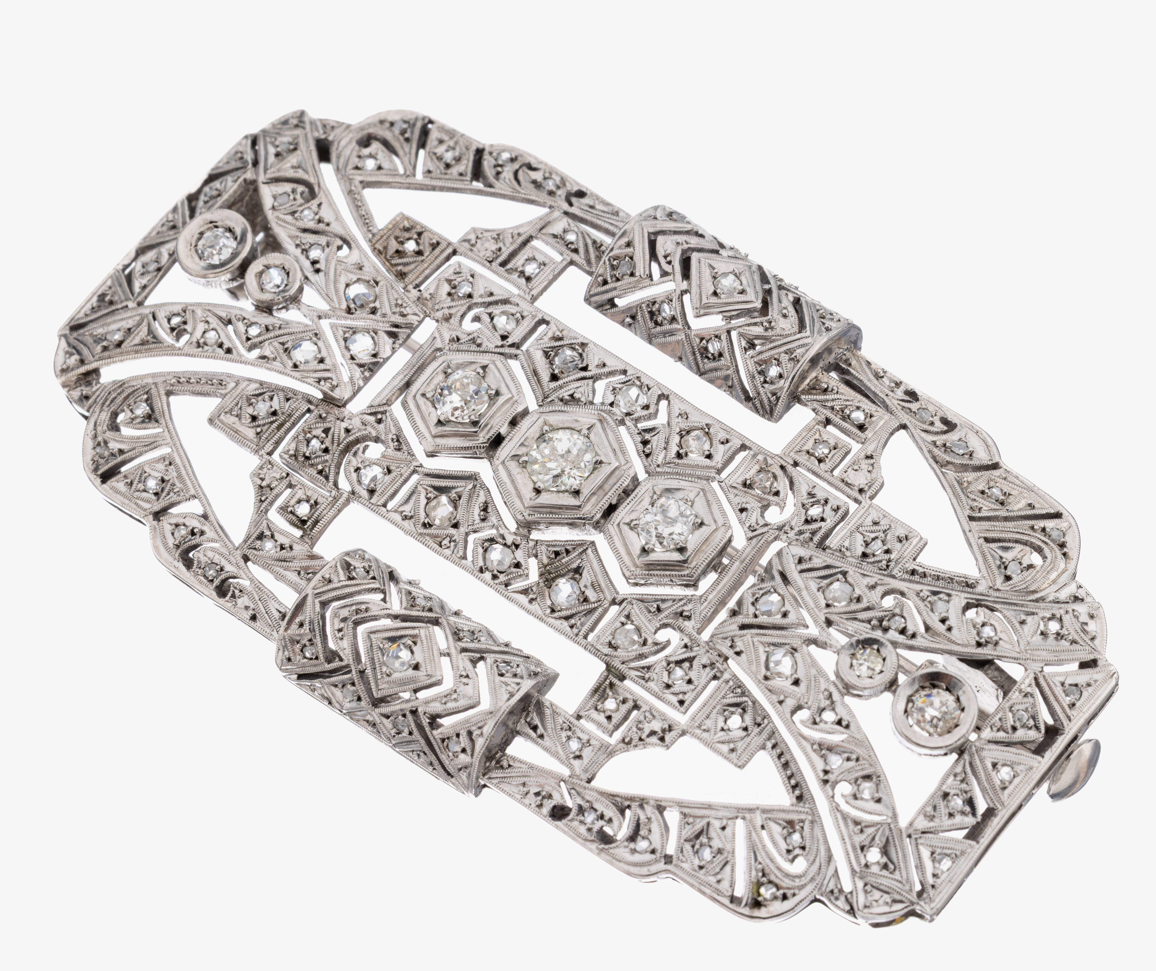 Platin Art Deco Diamant-Brosche, um 1930, Pt gepr., geometrisches Design, Altschliffdiamanten