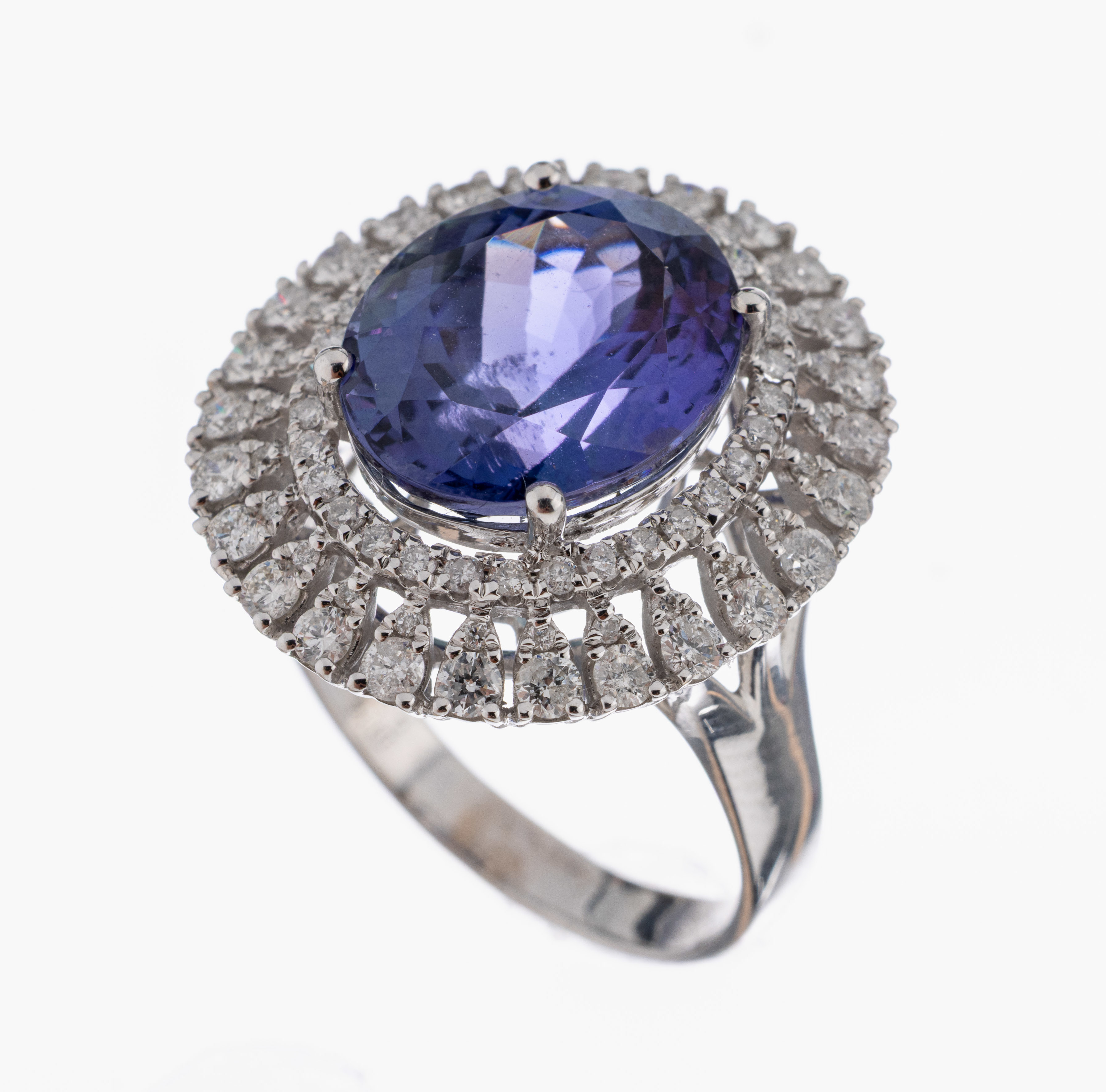 Tansanit ca. 9.08 ct (grav.), umgeben von 84 Brillanten zus. ca. 1.16 ct (grav.)