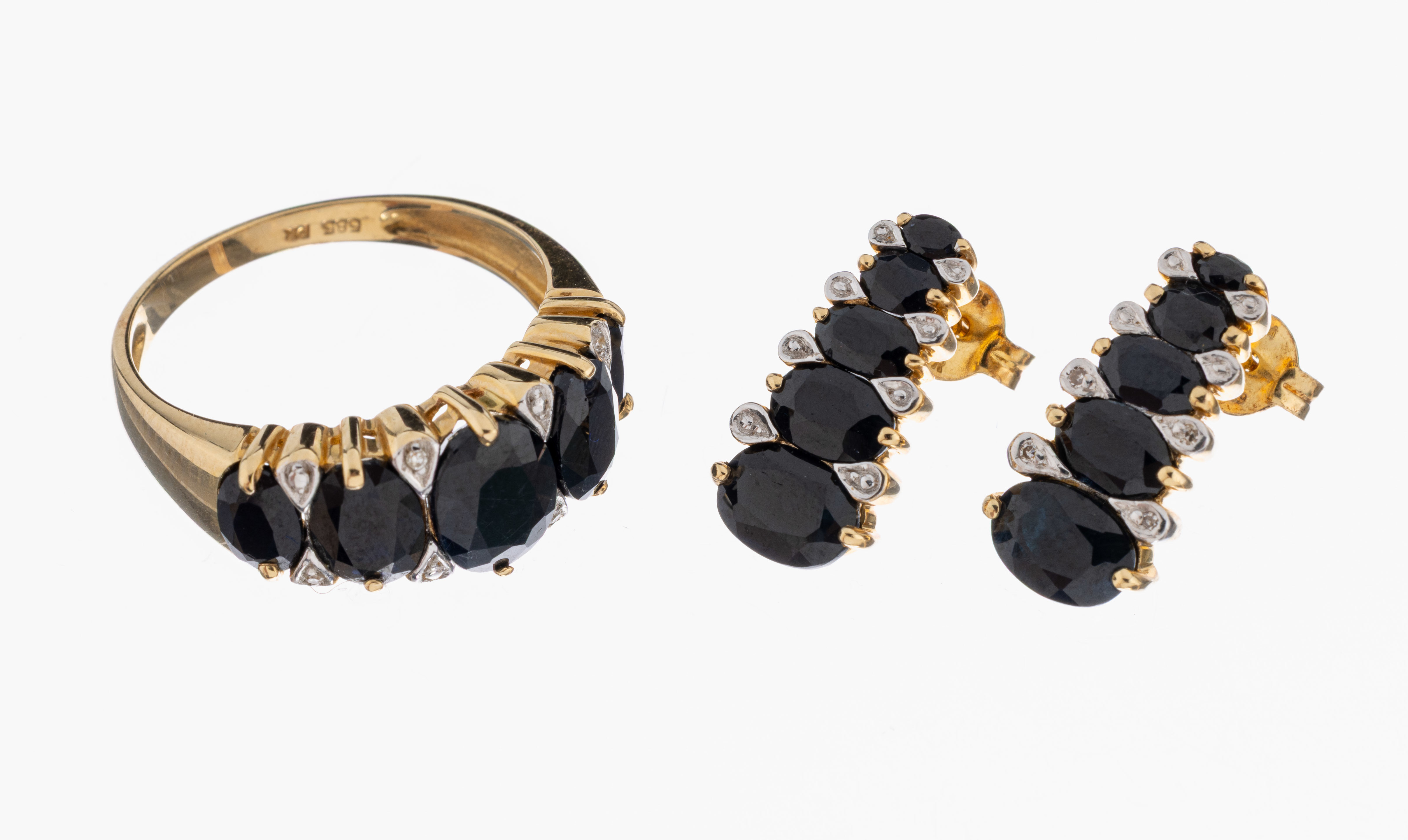 14 kt Gold Saphir-Diamant-Set, GG 585/000, best. aus: 1 Ring, RW 59, und 1 Paar Ohrstecker,