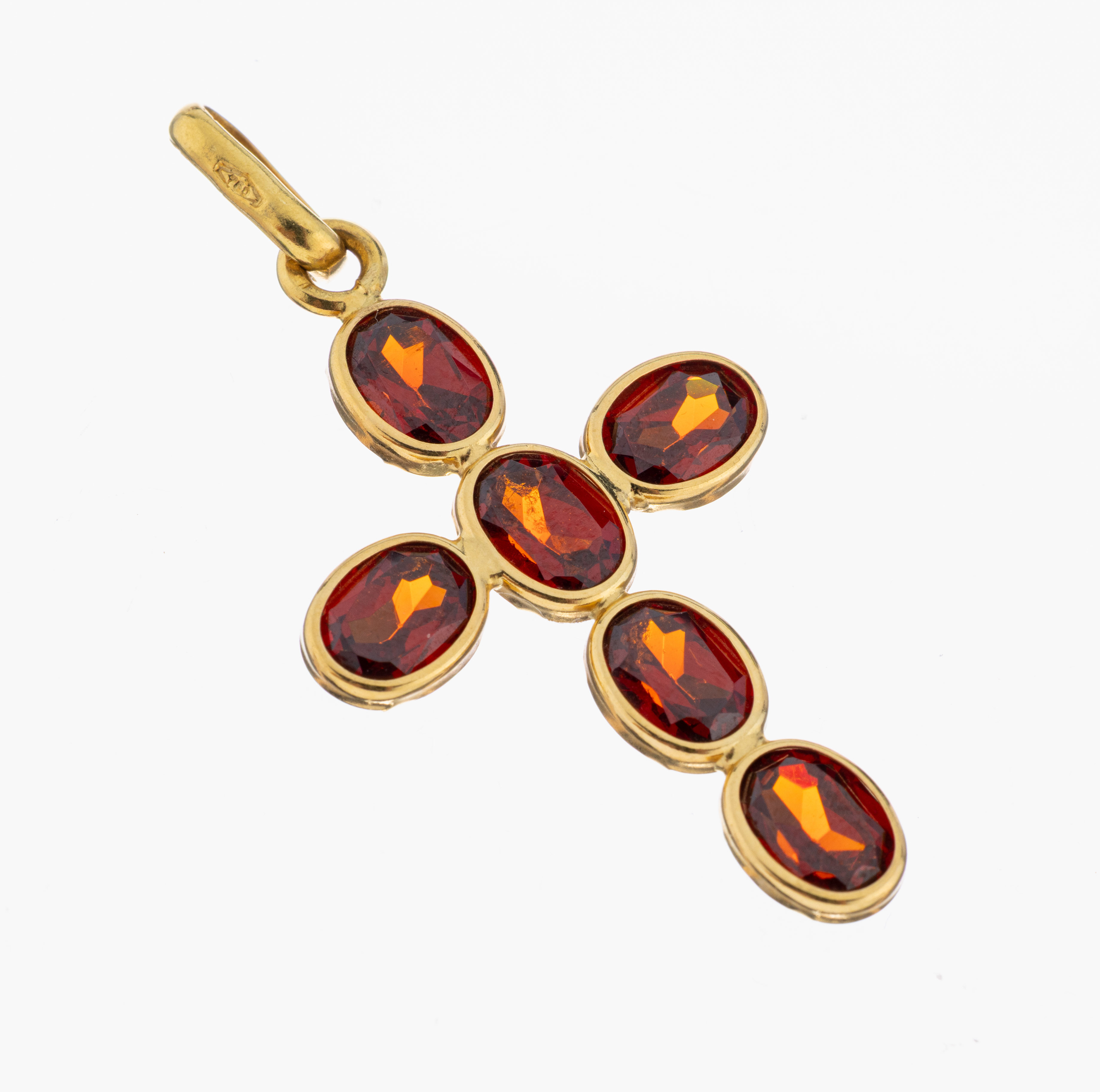 18 kt Gold Kreuzanhänger, GG 750/000, facett. granatfarb. Glassteine, ca. 4.6 x