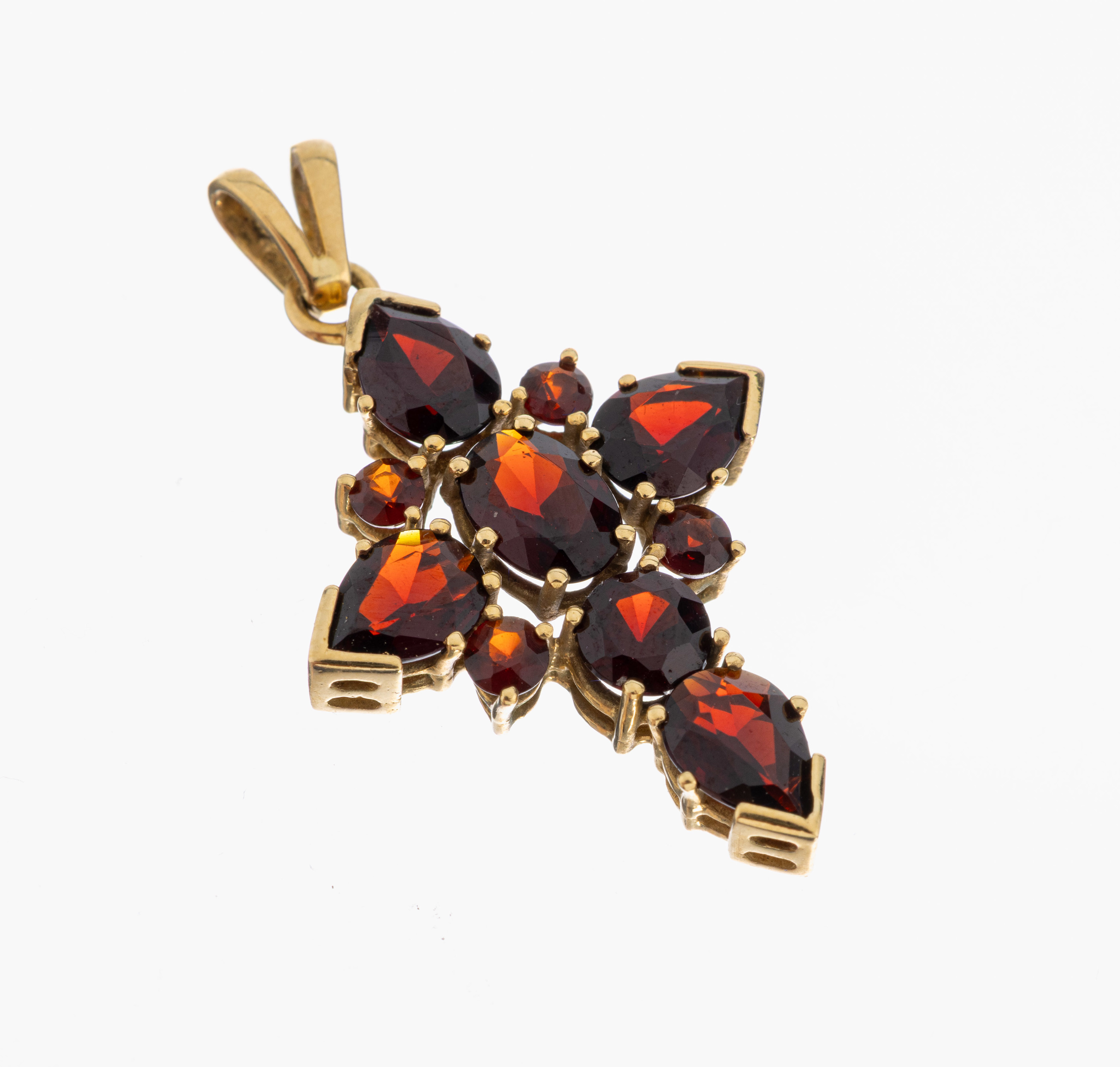 18 kt Gold Granat-Kreuzanhänger, GG 750/000, 10 facett. Granate in versch. Schliffformen