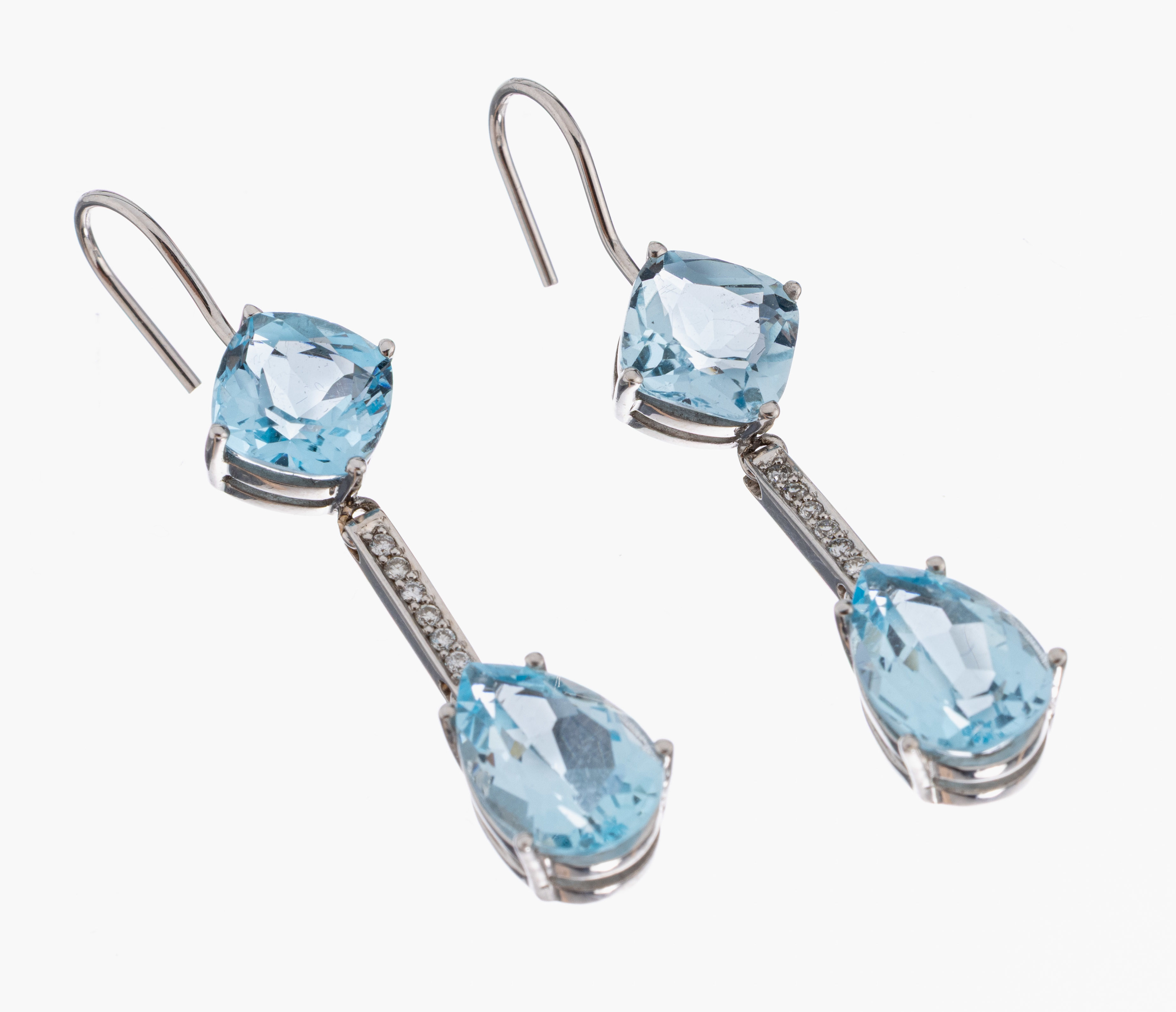 Paar 18 kt Gold Topas-Brillant-Ohrhänger, WG 750/000, 2 Blautopase (beh.) im Kissenschliff