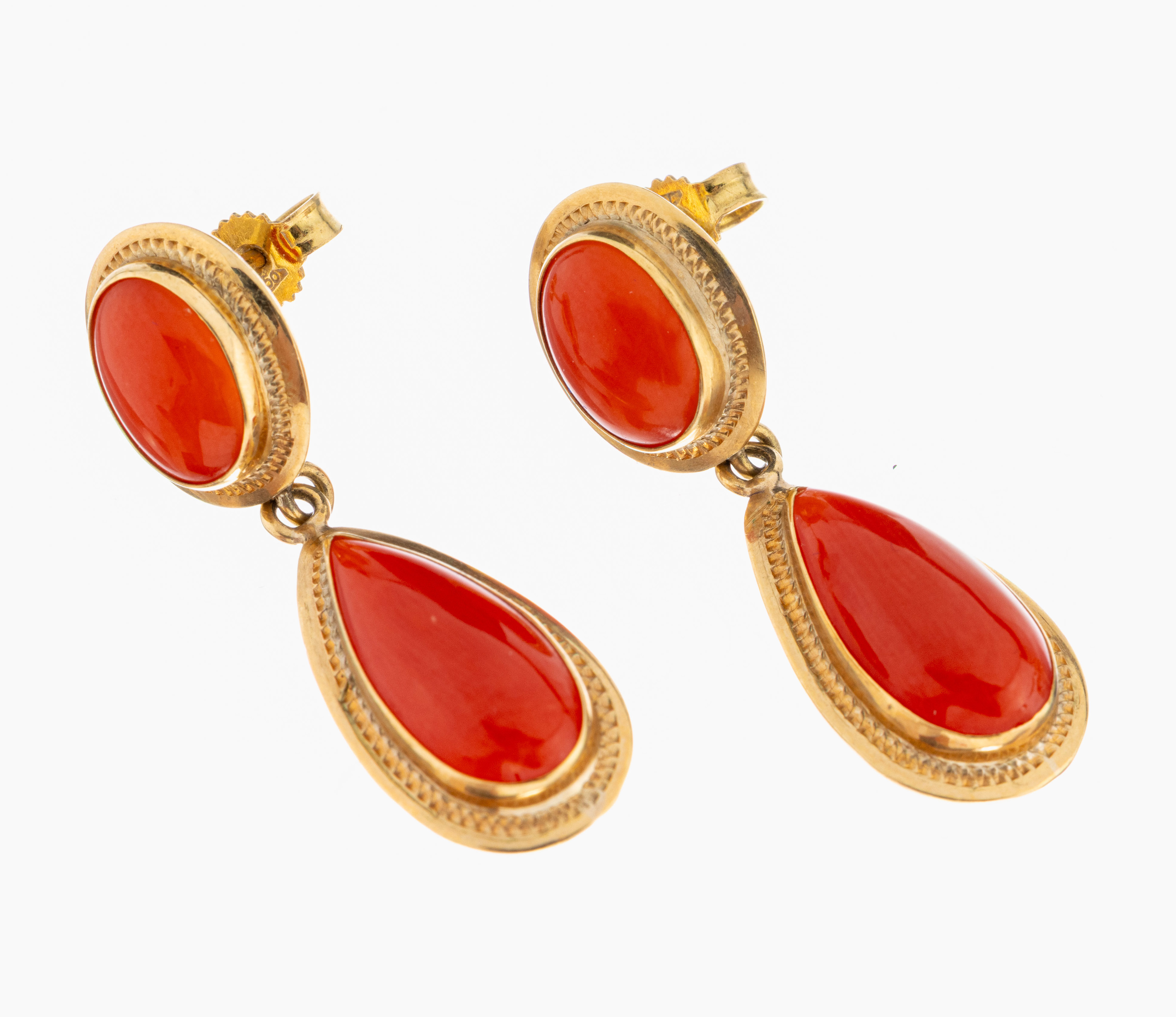 Paar 18 kt Gold Korallen-Ohrstecker, GG 750/000, länglich bewegl., 2 ovale und 2