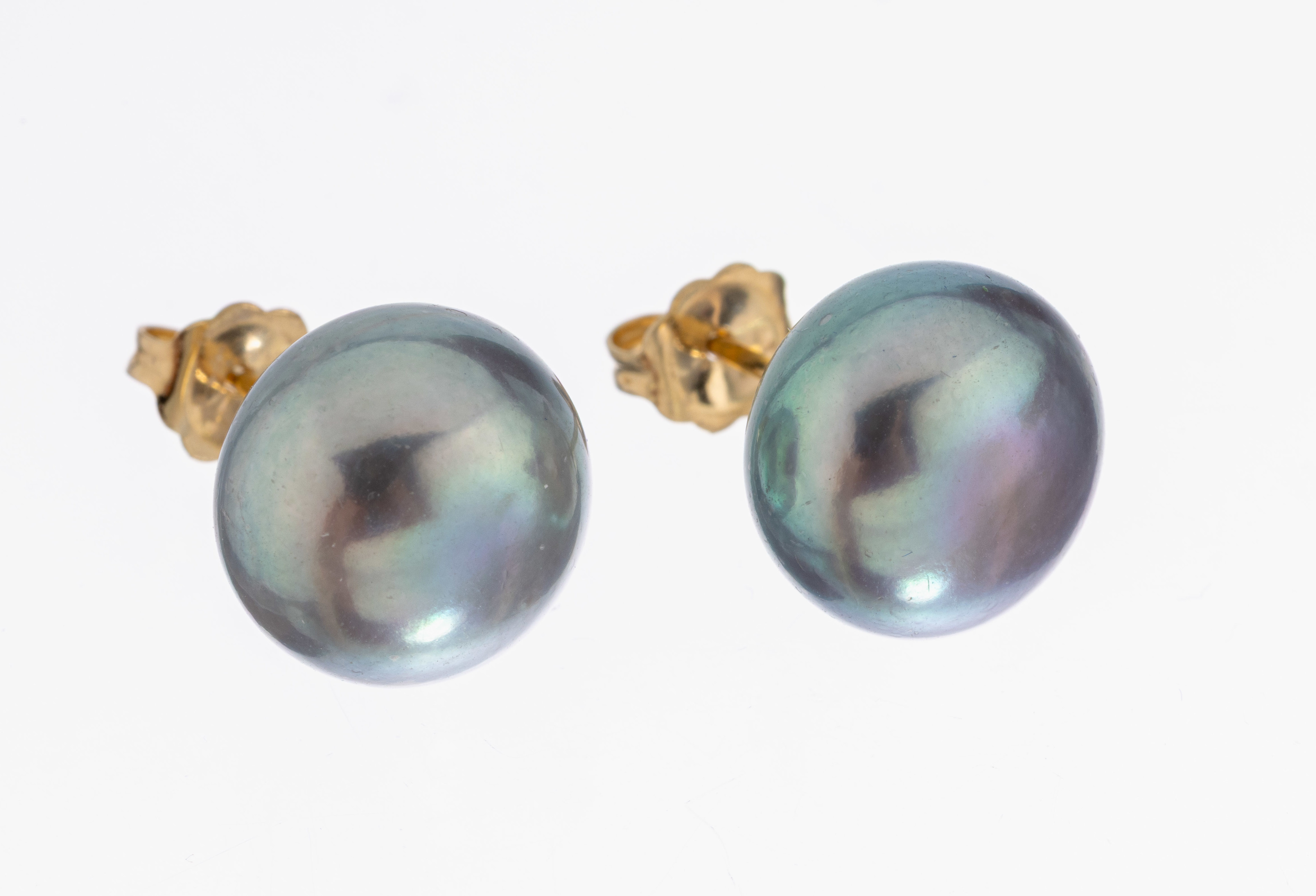 Pair of 14 kt gold pearl-earrings , YG 585/000, silvergrey pearls, dyed, diam. approx.