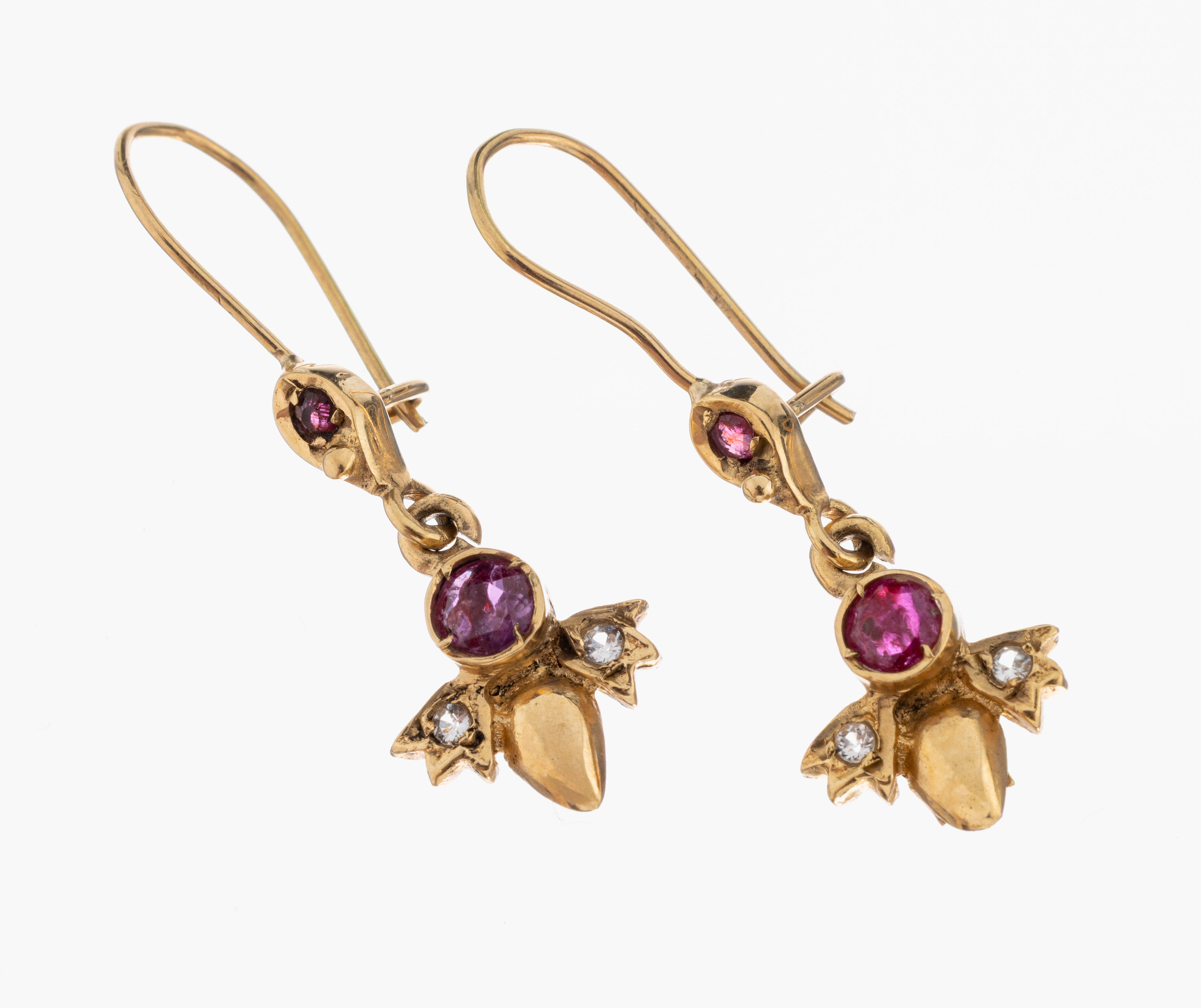 Paar 14 kt Gold Rubin-Diamant-Ohrhänger, GG585/000, bewegl. Abhängung, 2 kl. rundfacett.