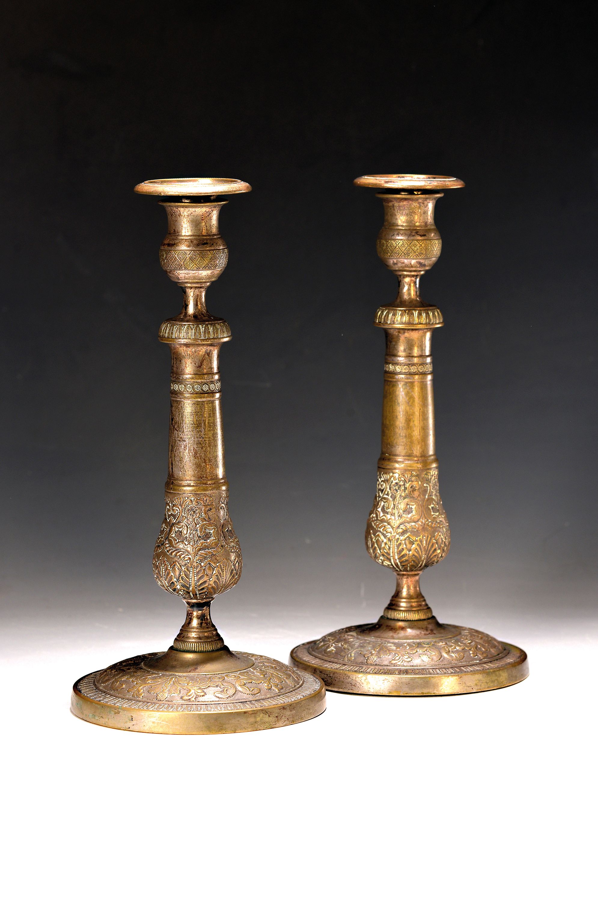 Pair of candlesticks, France, around 1890, brass, formerly silver-plated, acanthus