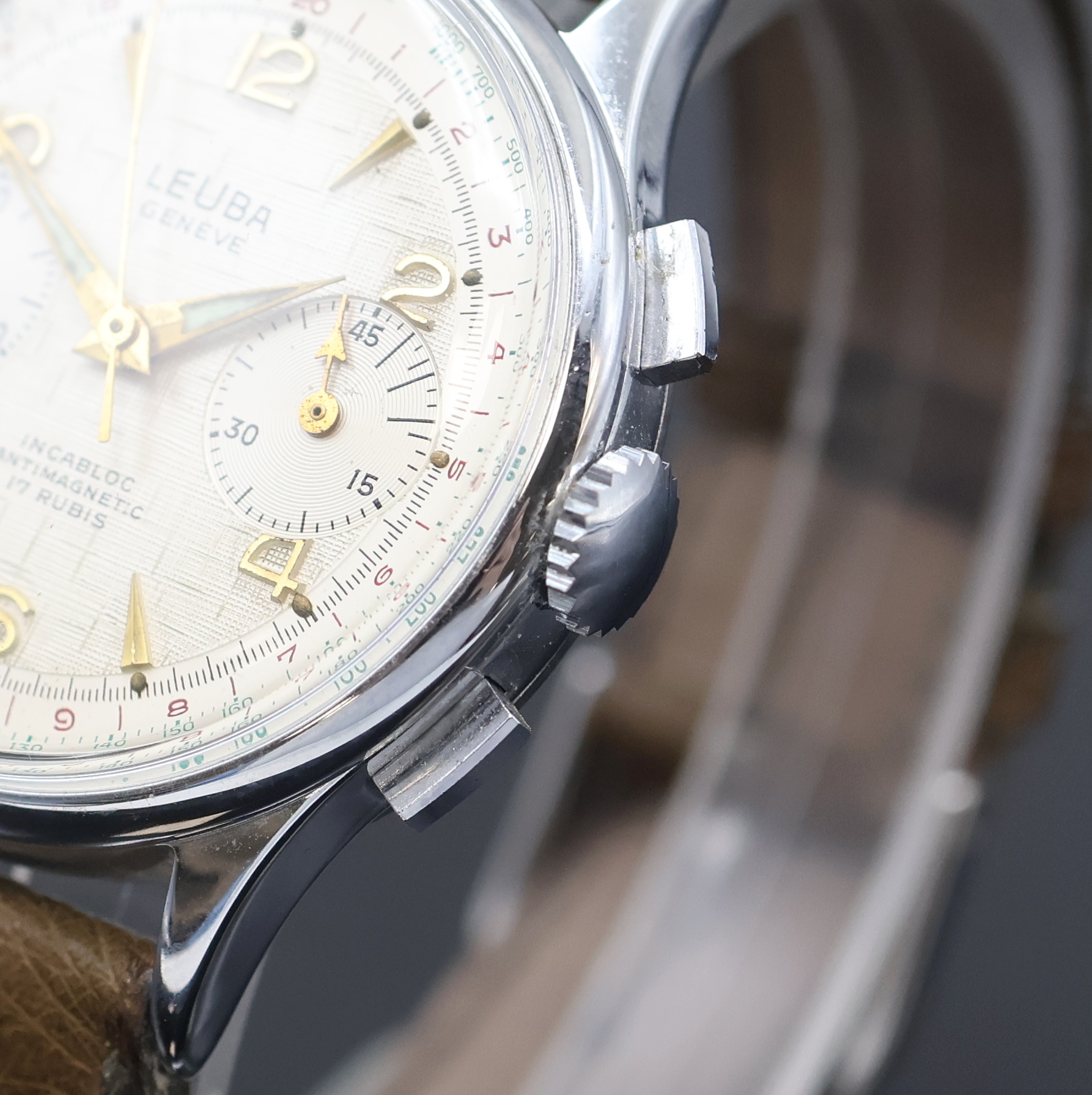 LA LEUBA Armbandchronograph, Handaufzug, Schweiz um 1954, verchr. Gehäuse, Glasrand