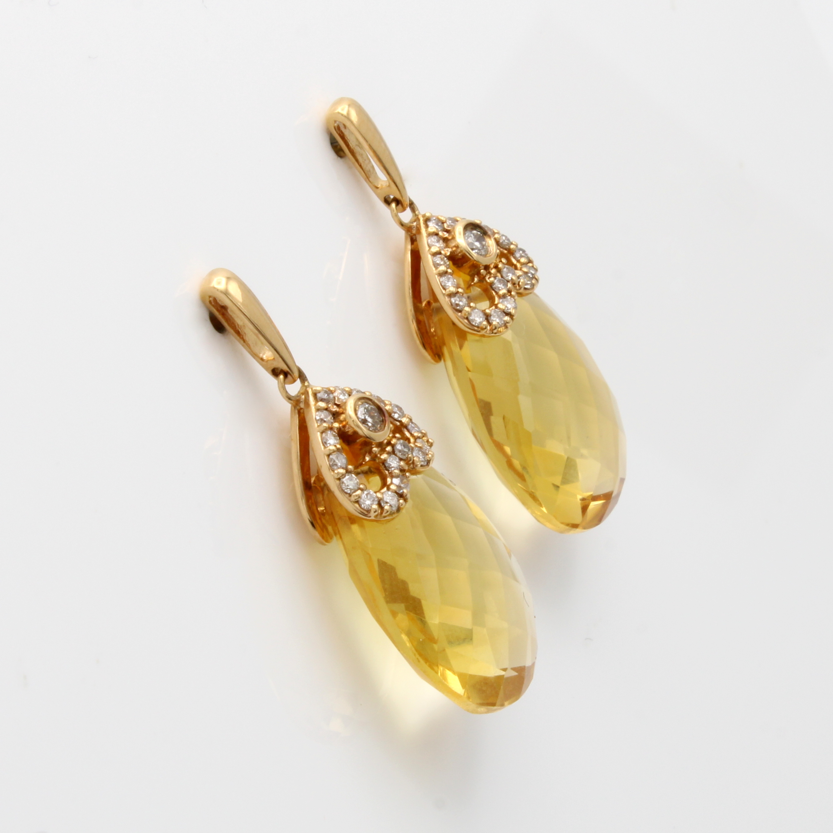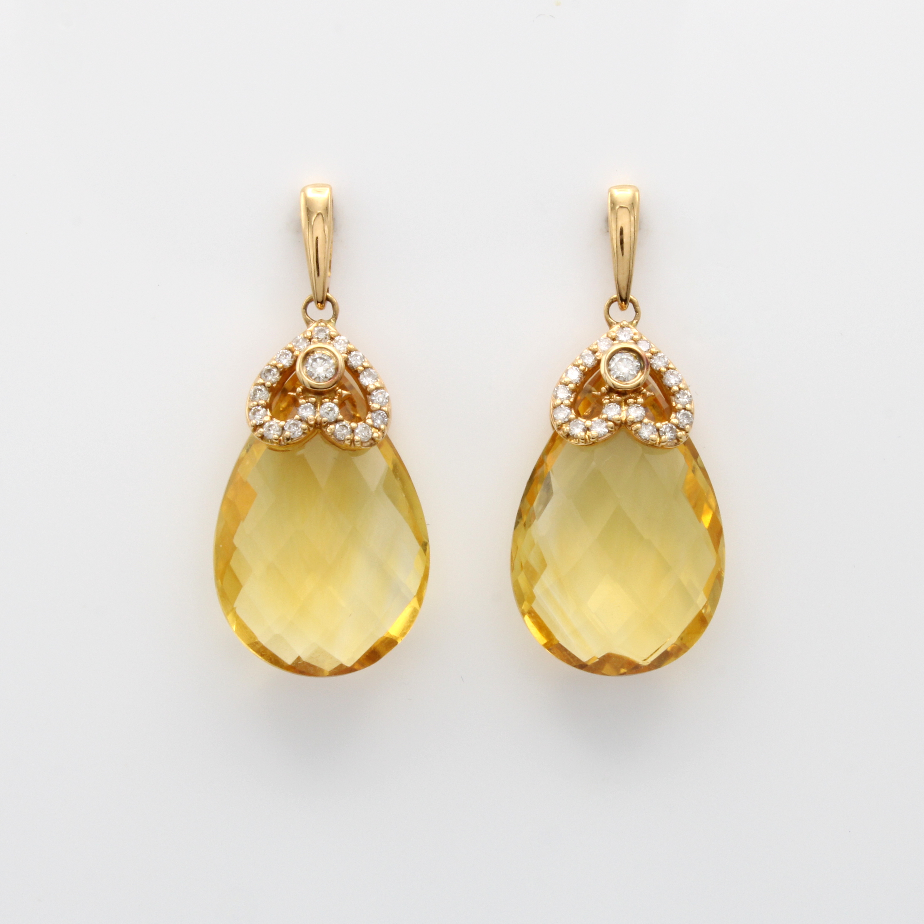 Paar Ohrstecker mit Citrinabhängungen und Brillanten, GG 750/000, 2 fac. Citrintropfenzus. ca. 23.33 ct, Oberteil bes. m. 36 Brill. zus. ca. 0.39 ct Weiß/si Schätzpreis: 3260, - EUR