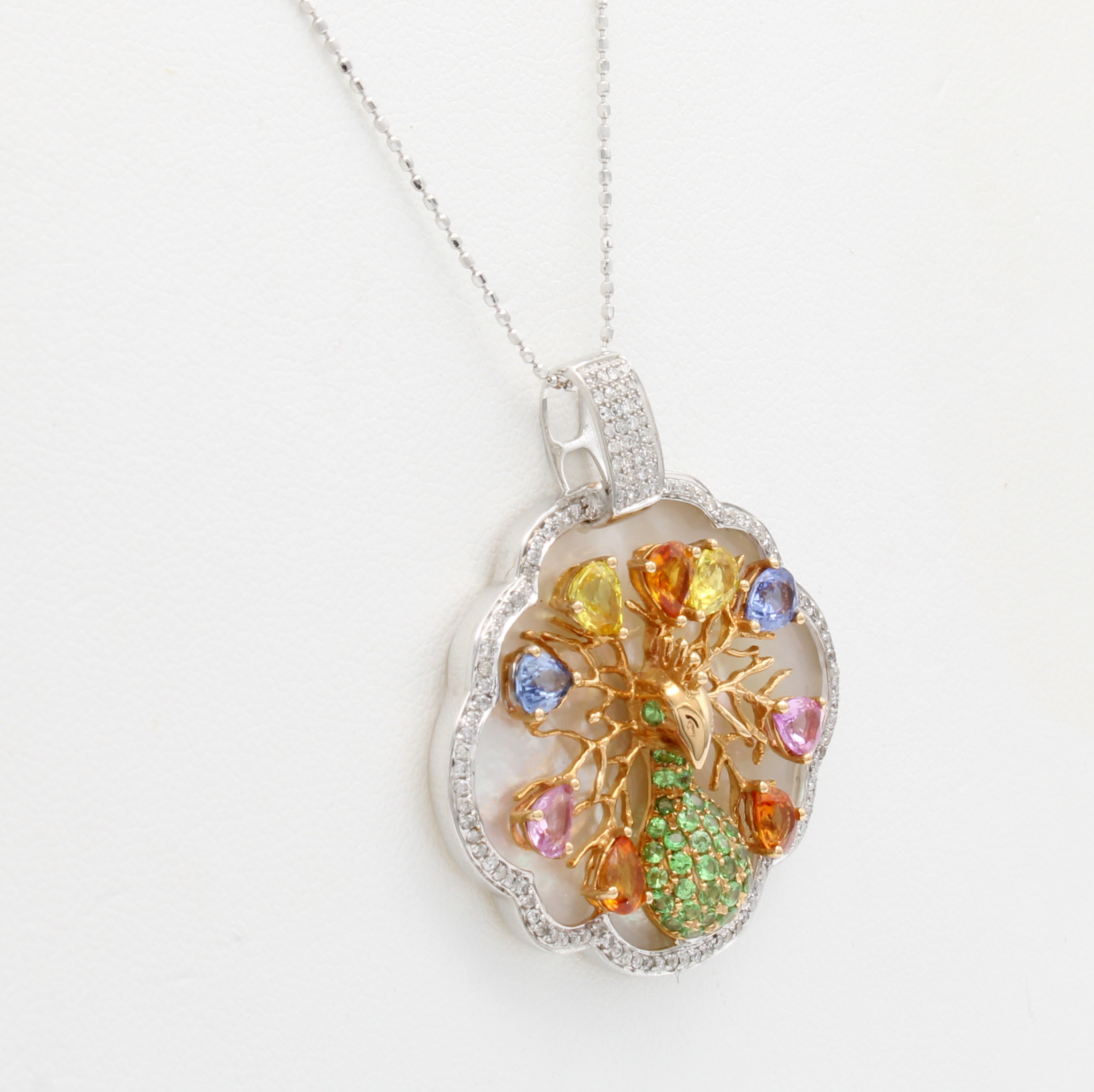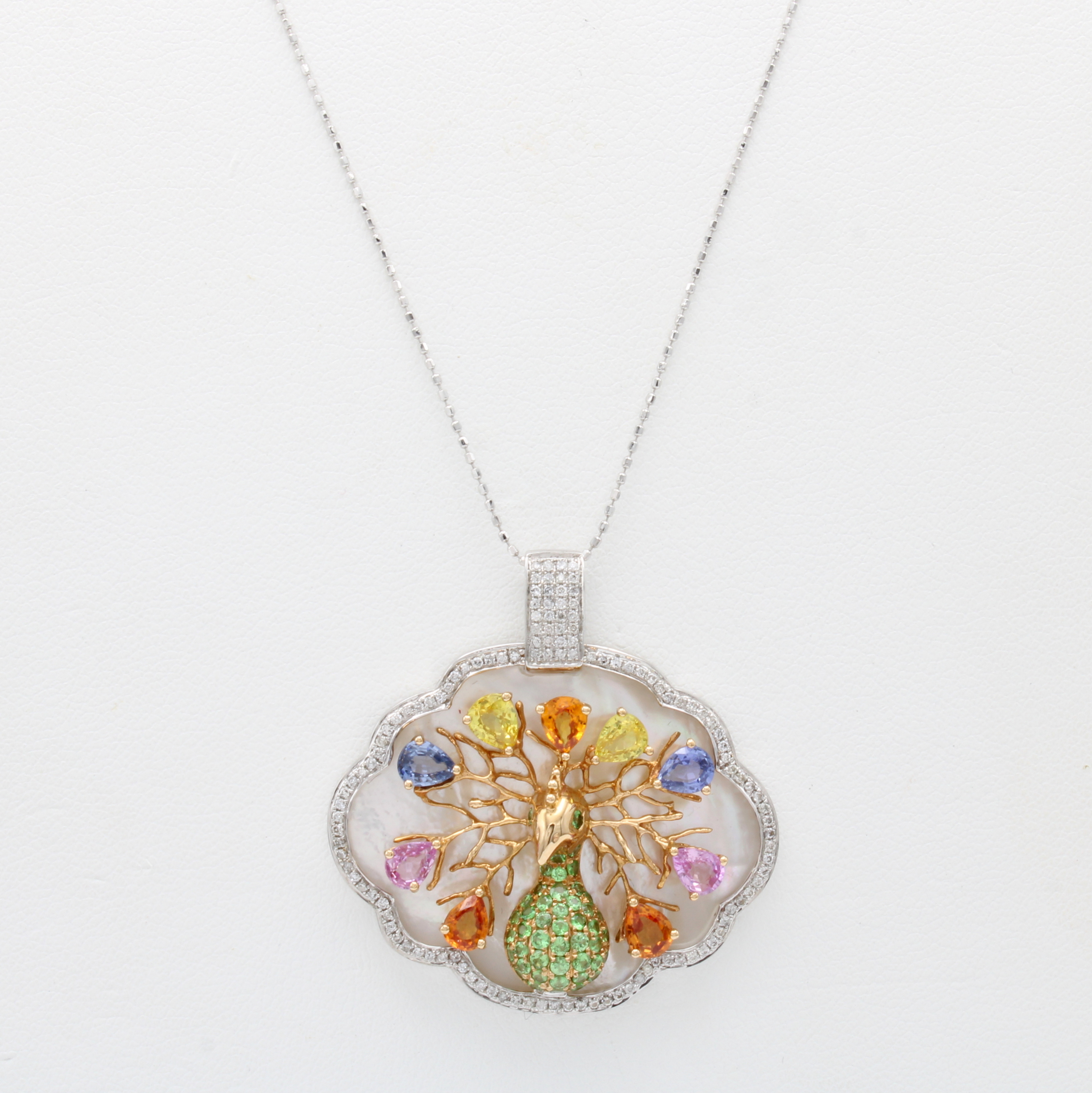 Anhänger "Pfau" mit Saphiren, Perlmutt und Brillanten an Kette, WG 750/000, 123 Brill. zus. ca. 0.36 ct Weiß/si-p, 56 fancy Saphire zus. ca. 3.13 ct, Rückseite m. Perlmutt, in L.ca. 36.5 u. 40 cm tragbar Schätzpreis: 5030, - EUR