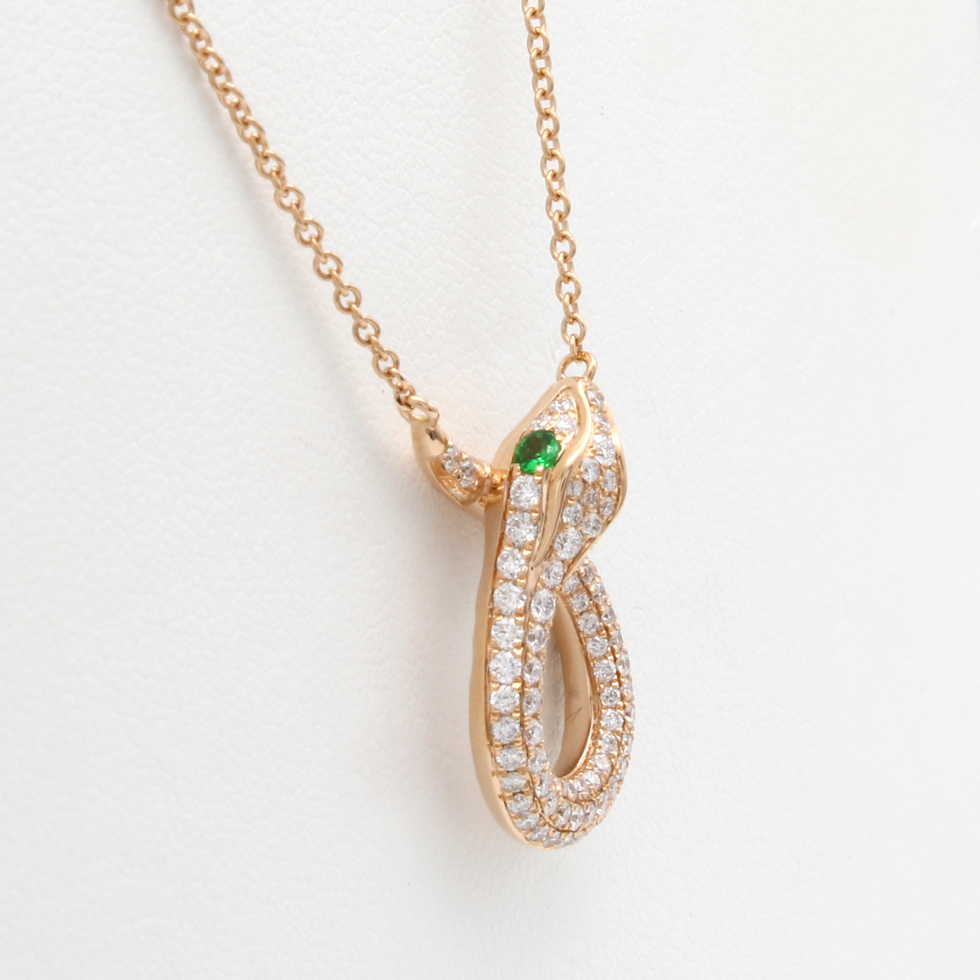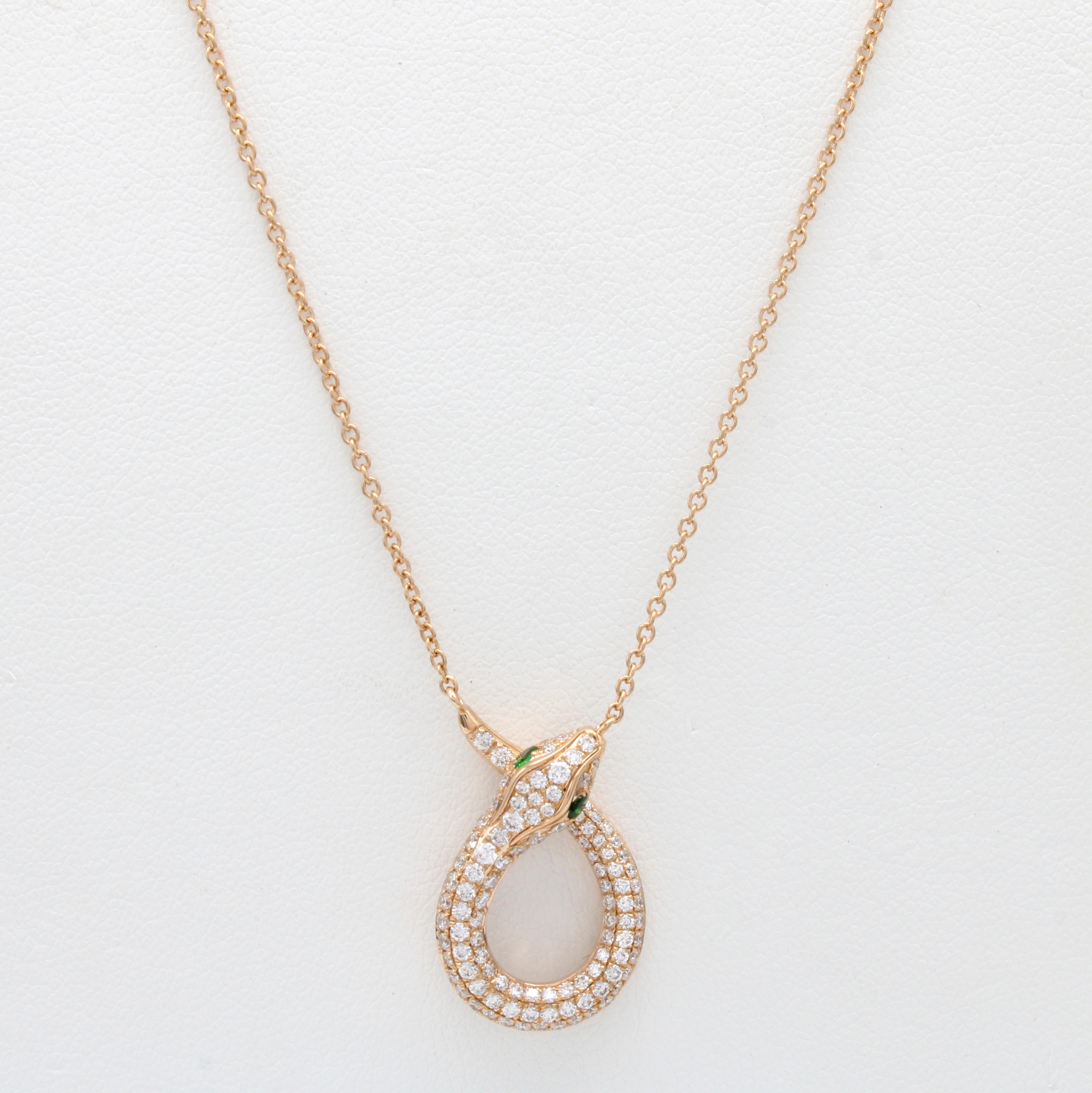 Collier "Schlange" mit Brillanten und Tsavo- riten, RG 750/000, 106 Brill. zus. ca. 0.66 ct Weiß/si, 2 Tsavorite zus. ca. 0.09 ct, L. ca. 44.5 cm Schätzpreis: 4300, - EUR