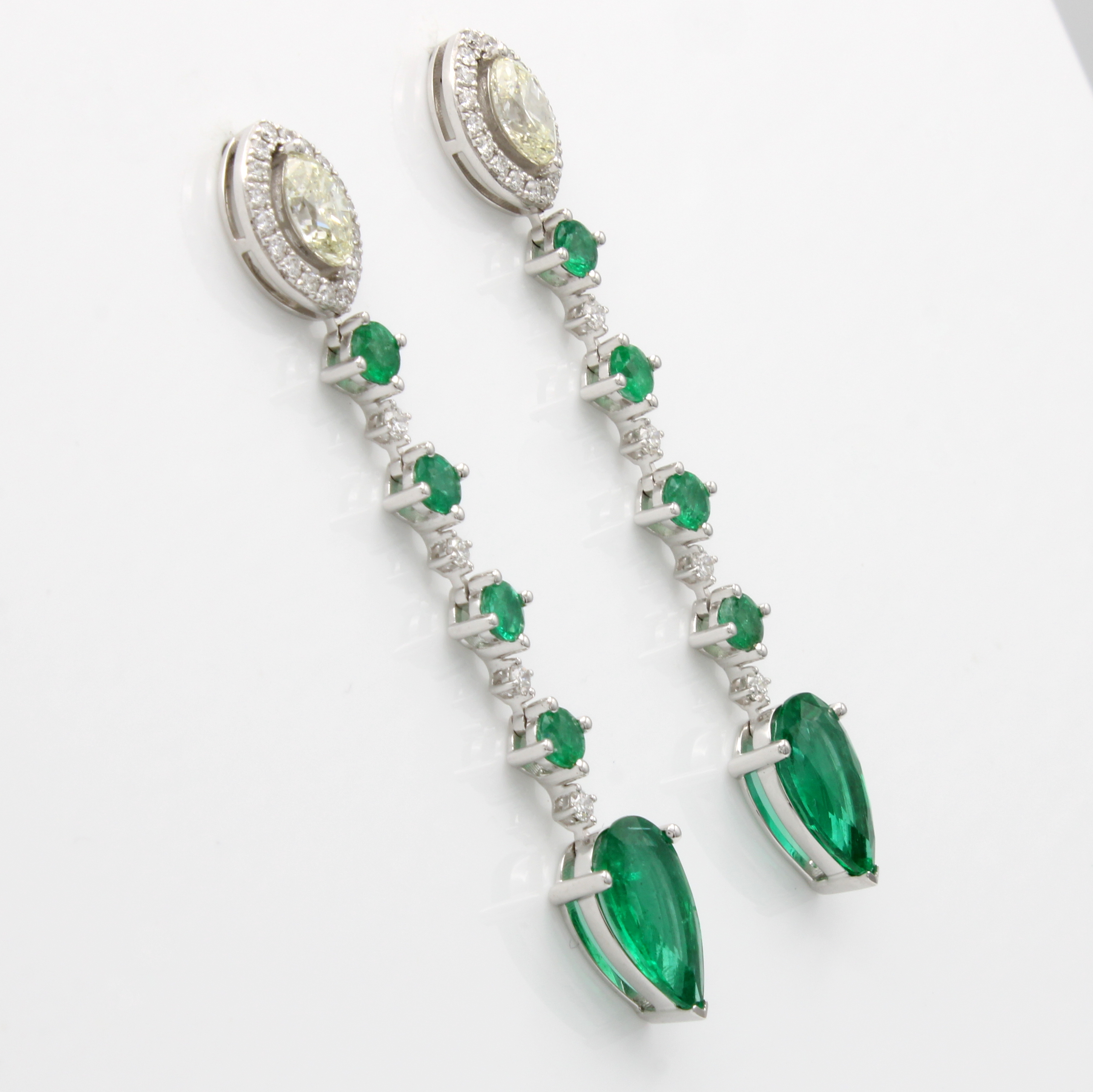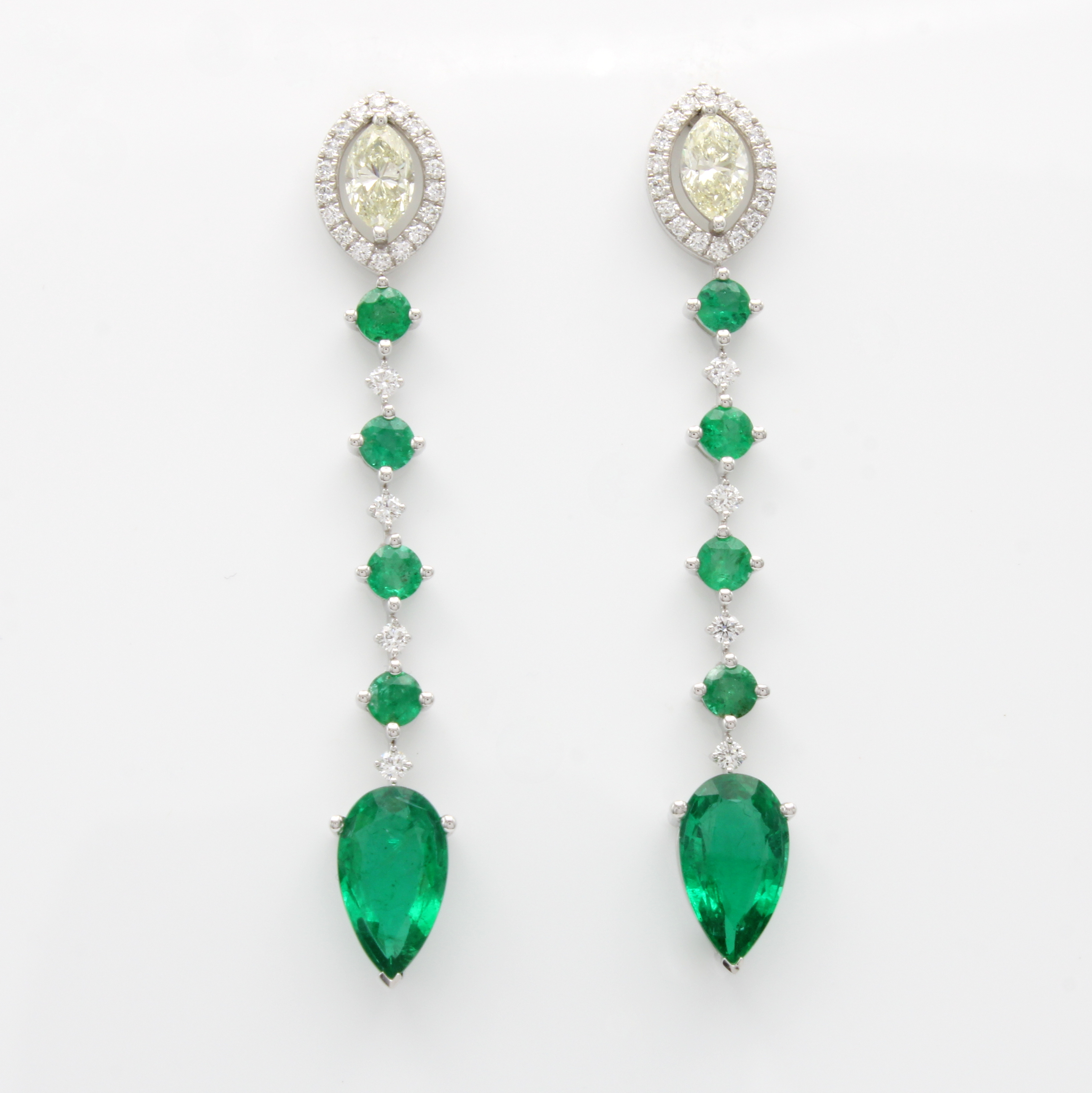 Paar Ohrstecker mit Brillanten, Diamanten und Smaragden, WG 750/000, 44 Brill. u. 2 Diam. zus. ca. 1.58 ct Weiß/si u. light yellow/si, runde u. tropfenf. Smaragde zus. ca. 4.68 ct Schätzpreis: 22800, - EUR