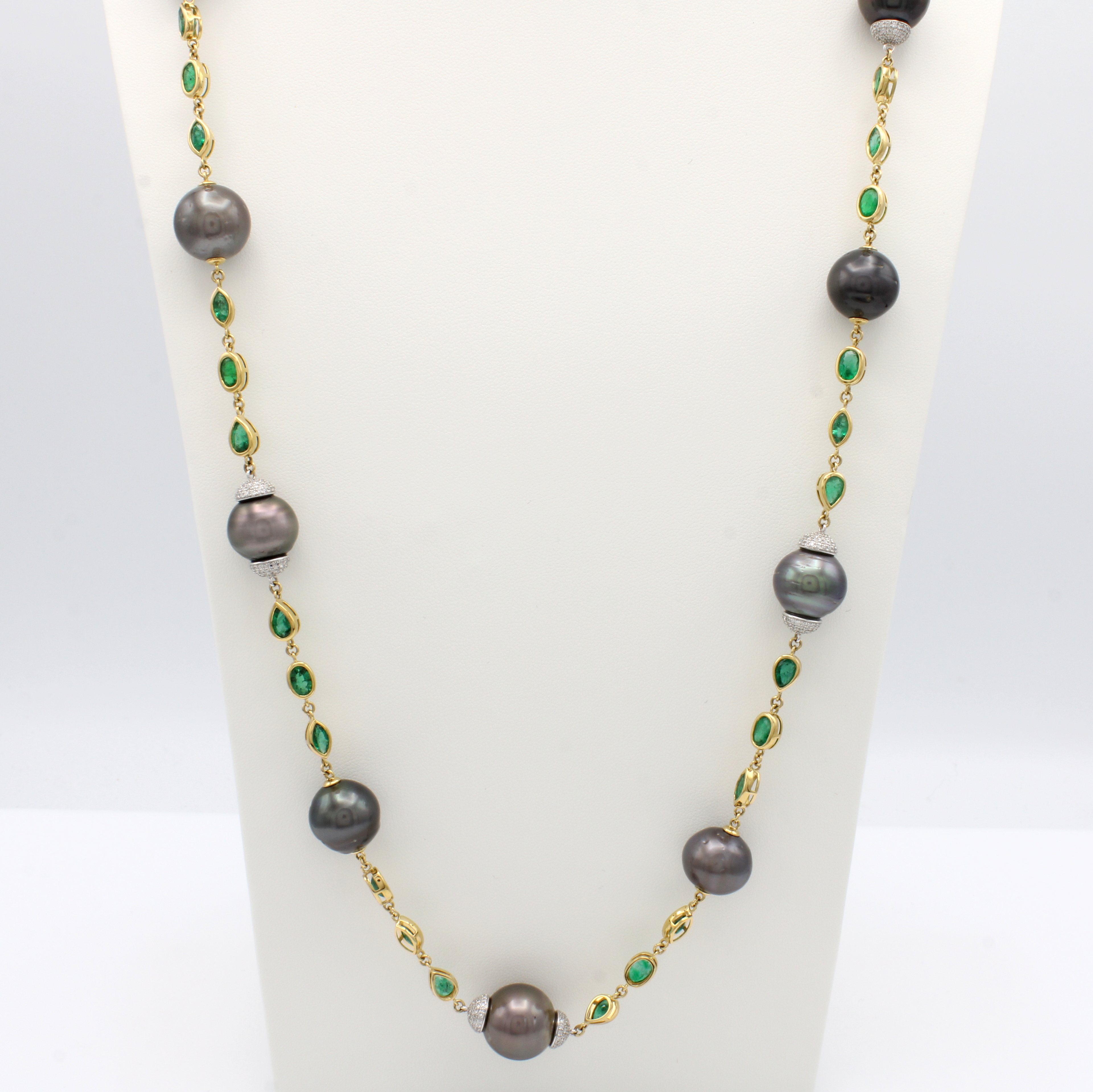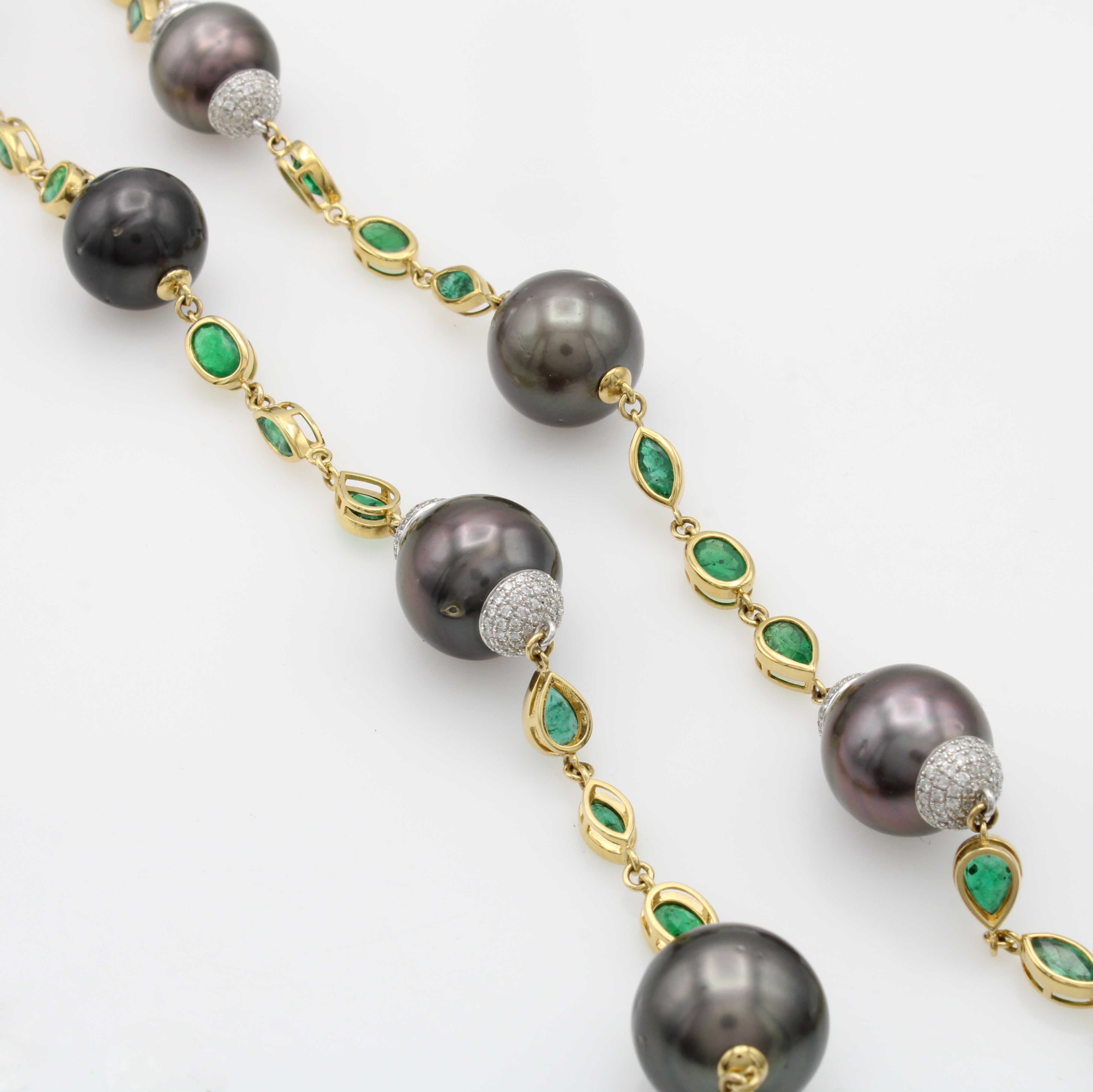 Lange Kette mit Smaragden, Brillanten und Tahitizuchtperlen, GG 750/000, 700 Brill.