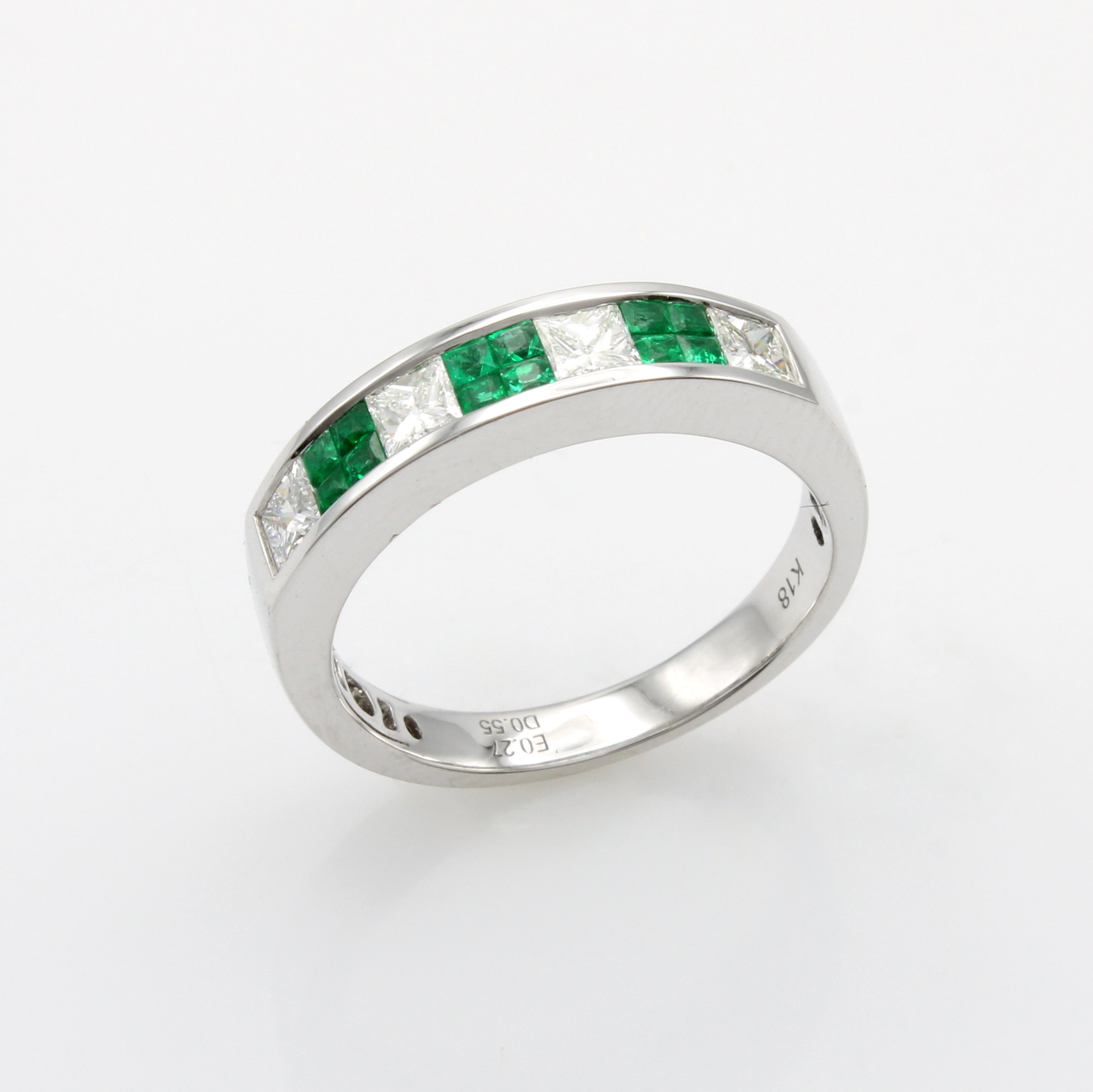 Ring mit Smaragden und Diamanten, WG 750/ 000, 4 Diam. zus. ca. 0.55 ct Weiß/vs, 12 Smaragdcarrées zus. ca. 0.27 ct, RW ca. 53 Schätzpreis: 4060, - EUR