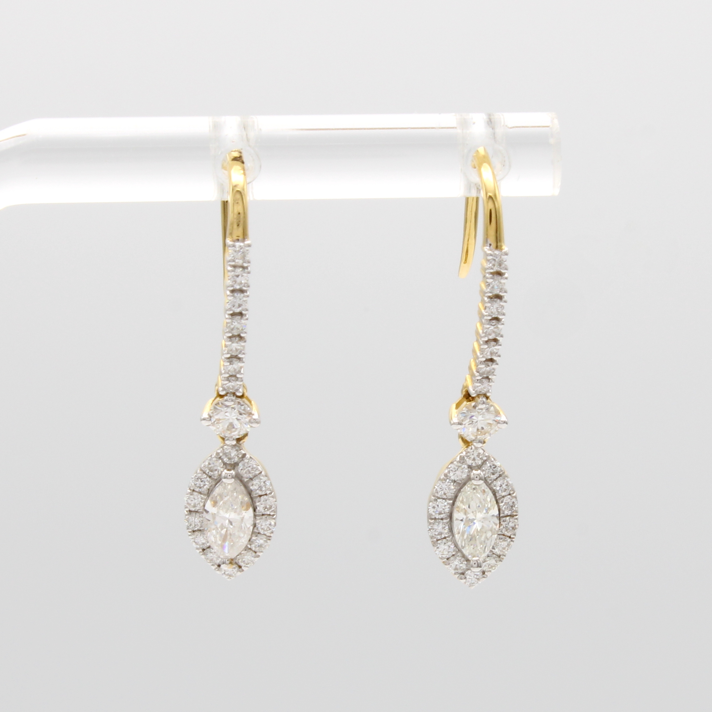 Paar Ohrhaken mit Diamanten und Brillanten, GG 750/000, 2 Diamantnavettes u. 44 Brill. zus. ca. 0.84 ct Weiß u. light yellow/si Schätzpreis: 3390, - EUR