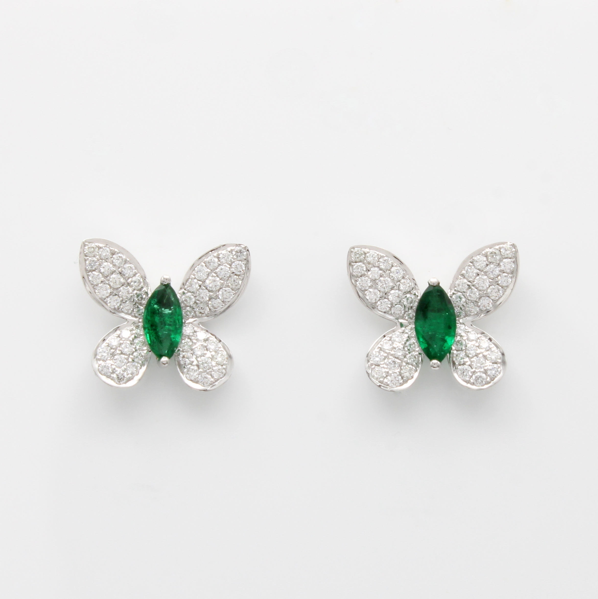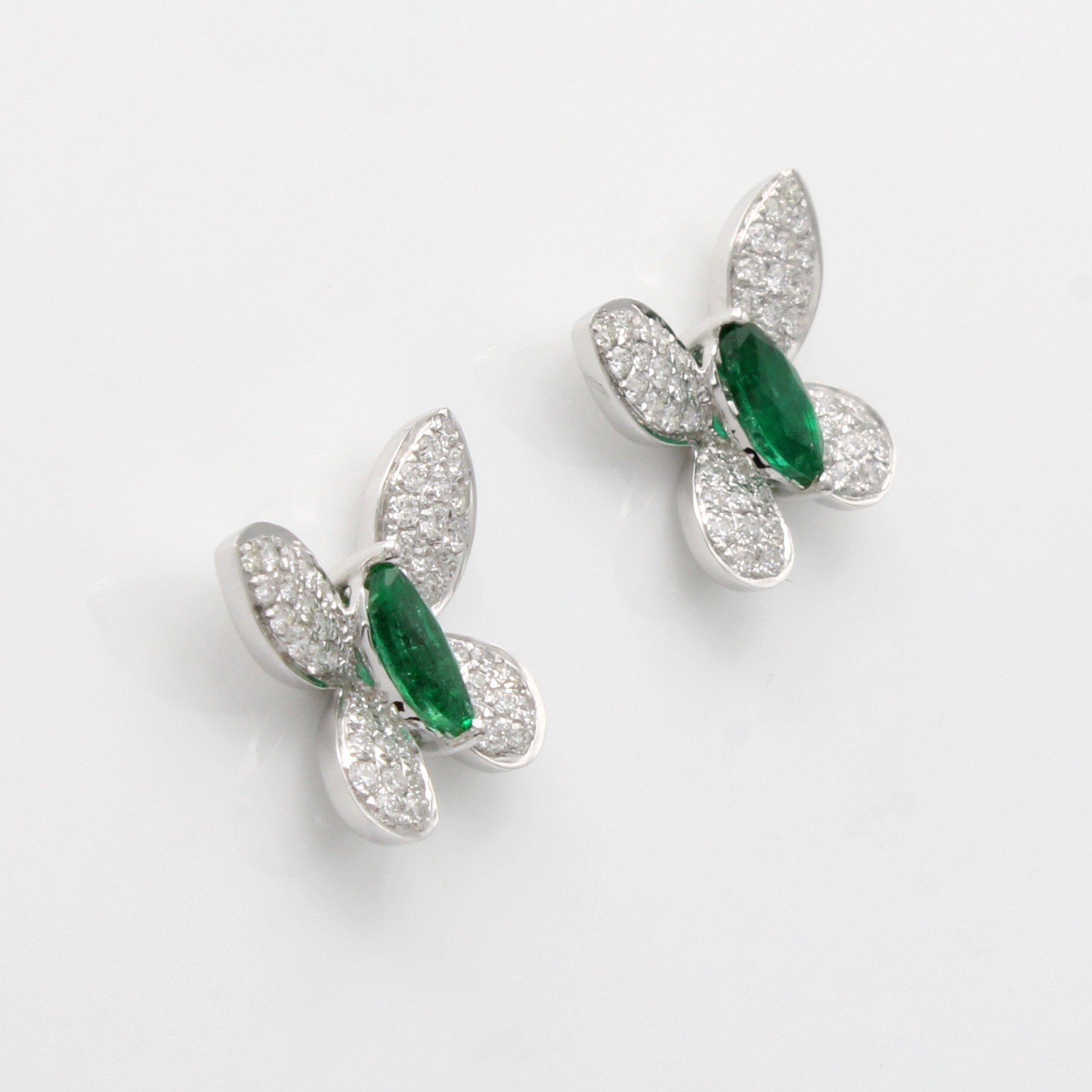 Paar Ohrstecker "Schmetterlinge" mit Smaragden und Brillanten, WG 750/000, 2 Smaragdnavettes als Körper zus. ca. 0.45 ct, Flügel bes. m. insges. 104 Brill. zus. ca. 0.41 ct Weiß/si Schätzpreis: 3200, - EUR