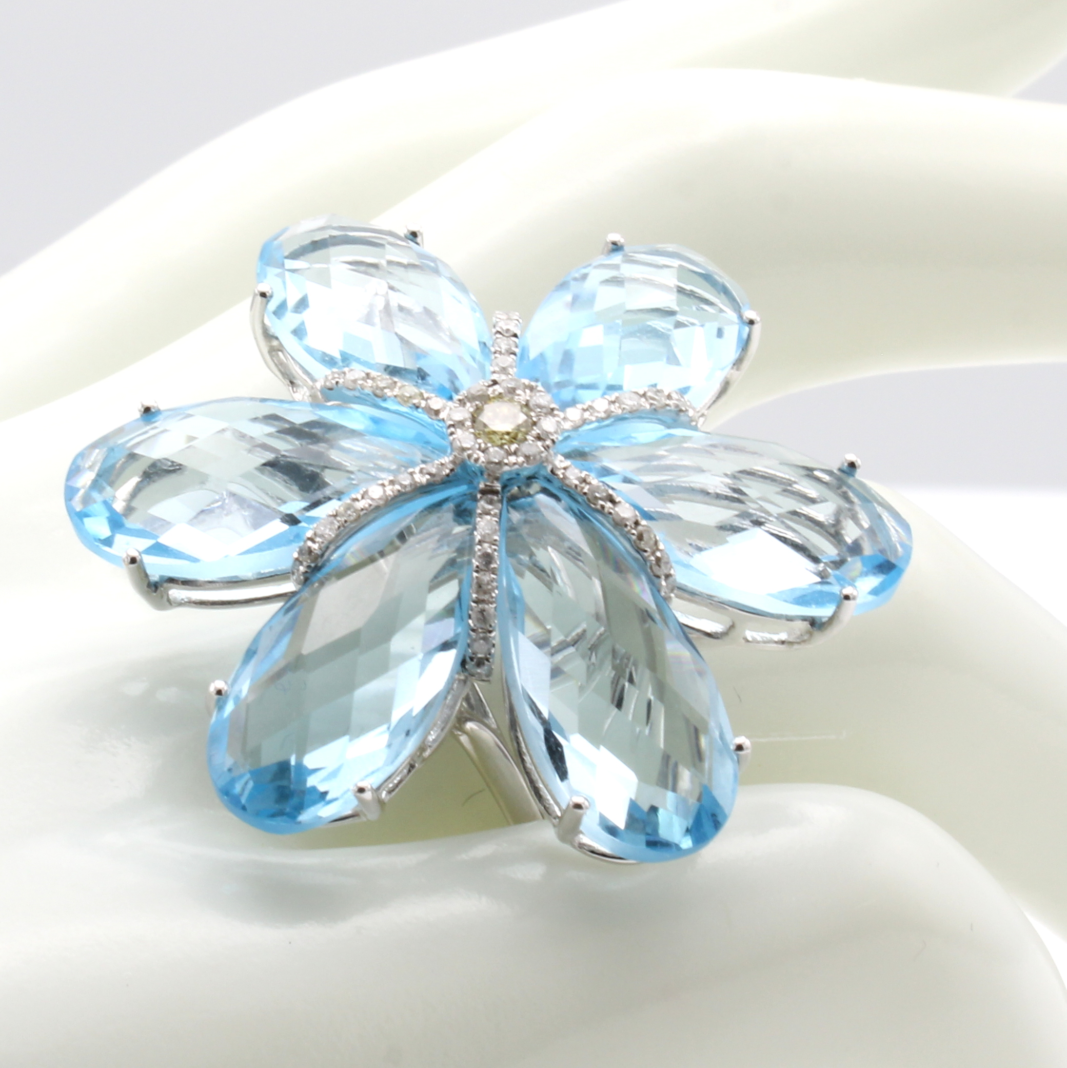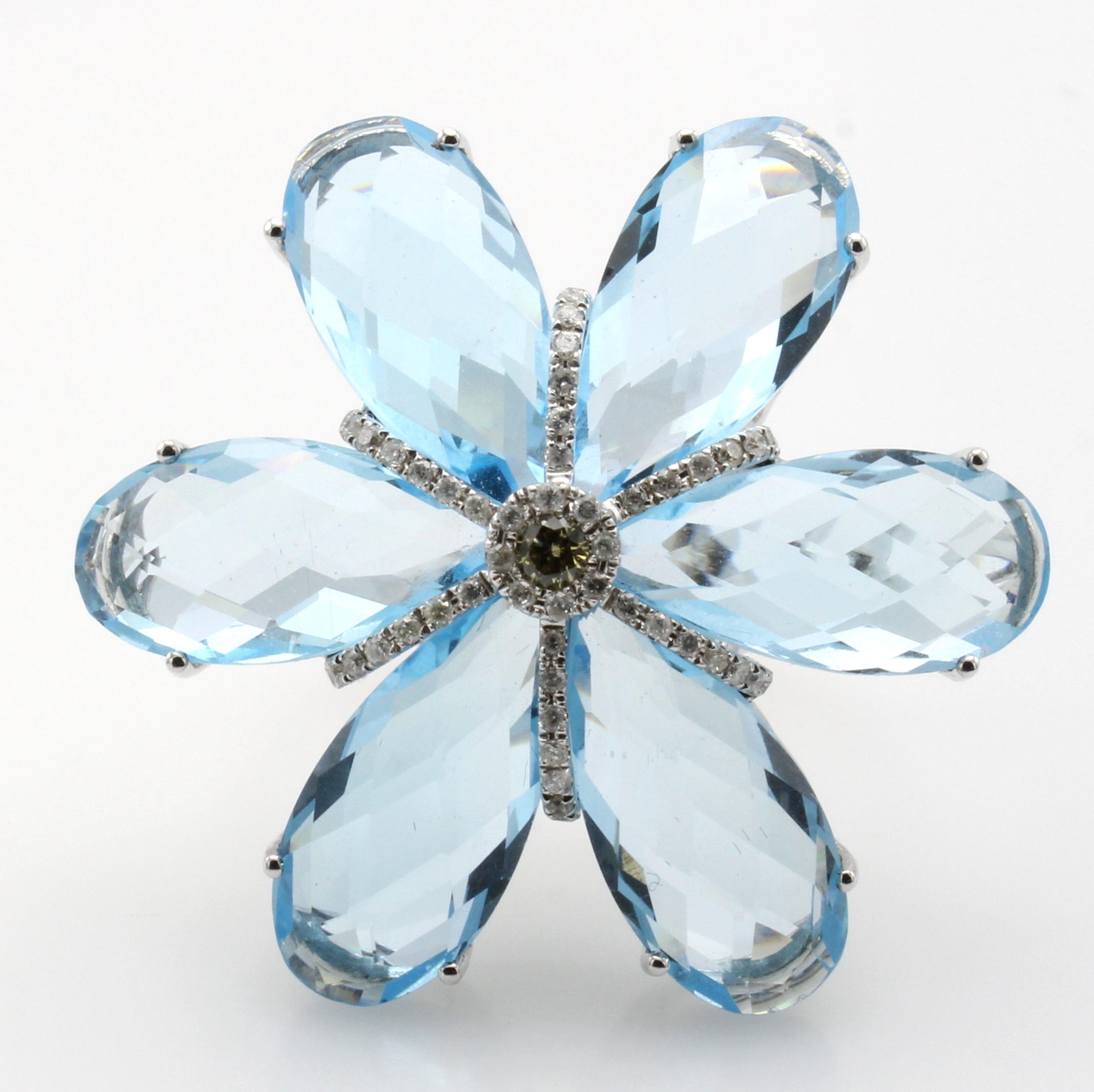 Blütenring mit Blautopasen und Brillanten, WG 750/000, 50 Brill. zus. ca. 0.32 ct Weiß- p u. Mittelstein fancy colour, 6 Topase in Tropfenform zus. ca. 35.12 ct (beh.), RW ca. 55 Schätzpreis: 6880, - EUR