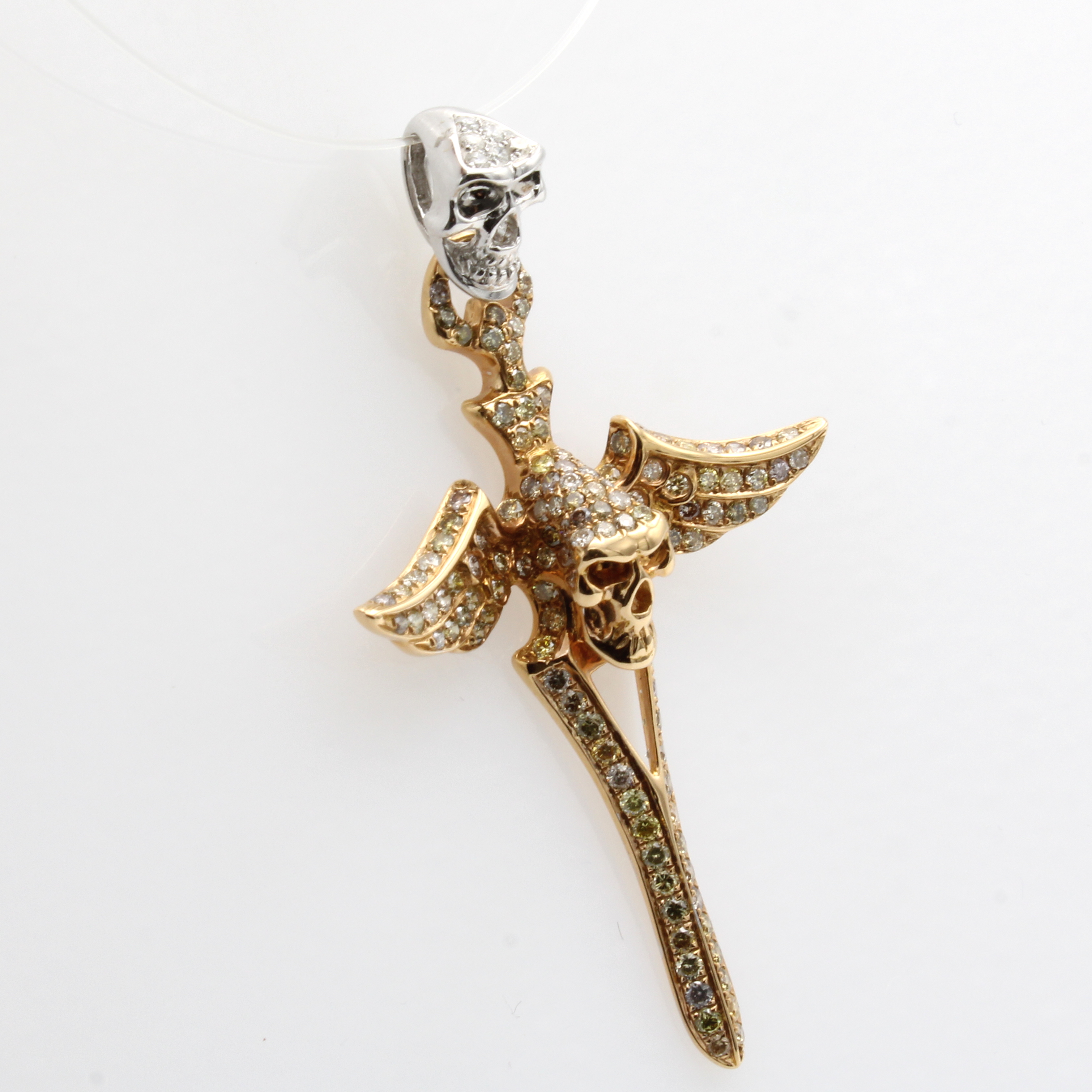 Anhänger mit Brillanten, WG/RG 750/000, in Form eines Kreuzes mit Totenkopf- u. Engelsflügel-Design, 147 Brill. zus. ca. 1.84 ct feines Weiß/si-p u. fancy yellow, Maße ca. 5x3.5 cm Schätzpreis: 5040, - EUR