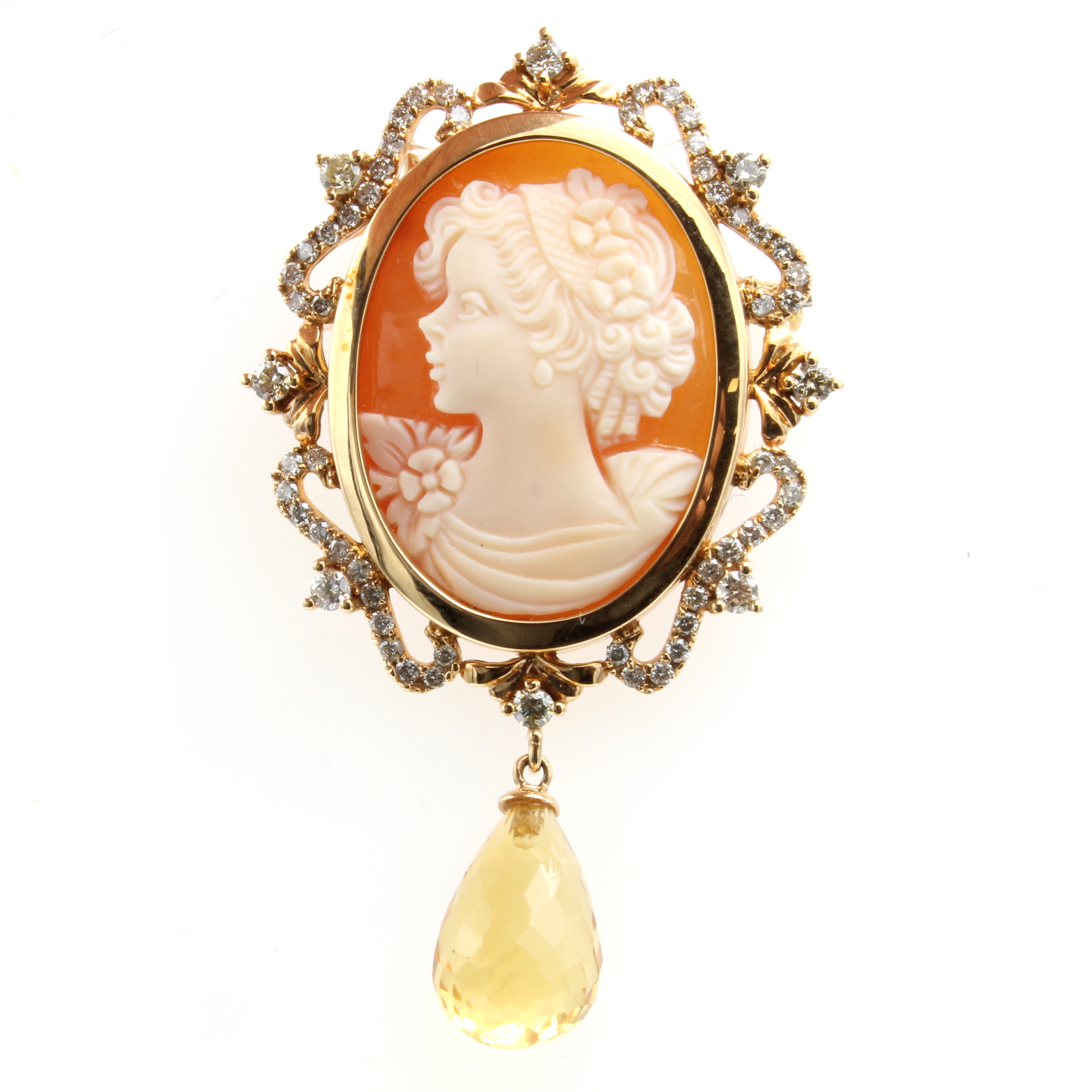 Anhänger/Brosche mit Carneol, Brillanten und Citrin, RG 750/000, Darstellung eines Frauenmotives, 60 Brill. zus. ca. 0.70 ct Weiß-Braun/p, fac. Citrinabhängung ca. 5 ct Schätzpreis: 4340, - EUR