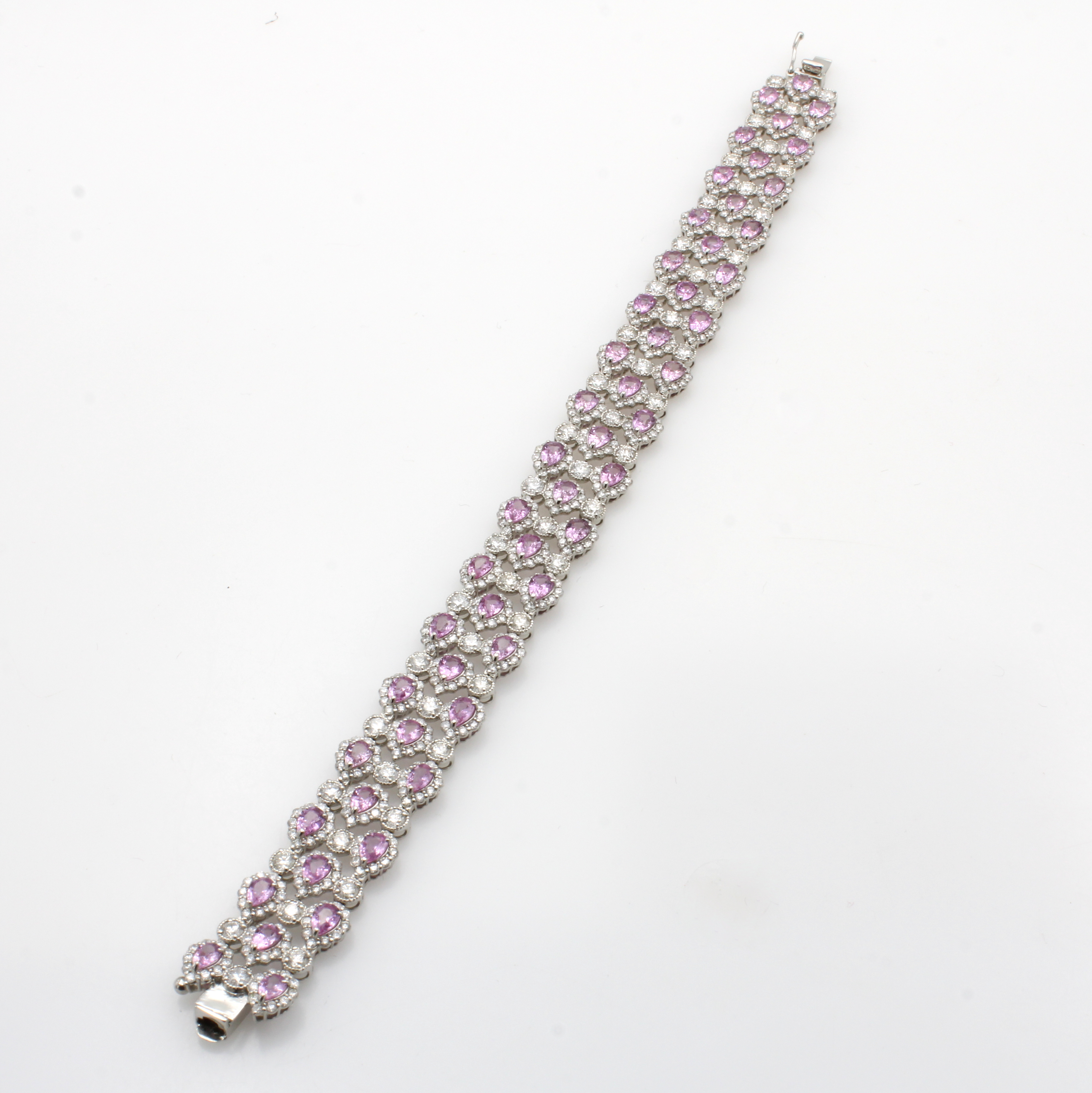 Armband mit Brillanten und Saphiren, 900er Platin, 561 Brill. zus. ca. 7.2 ct Weiß/si, 51 rosa Saphire zus. ca. 8.9 ct, Kastenschl. m. Sicherheitsacht, L. ca. 18 cm Schätzpreis: 24450, - EUR