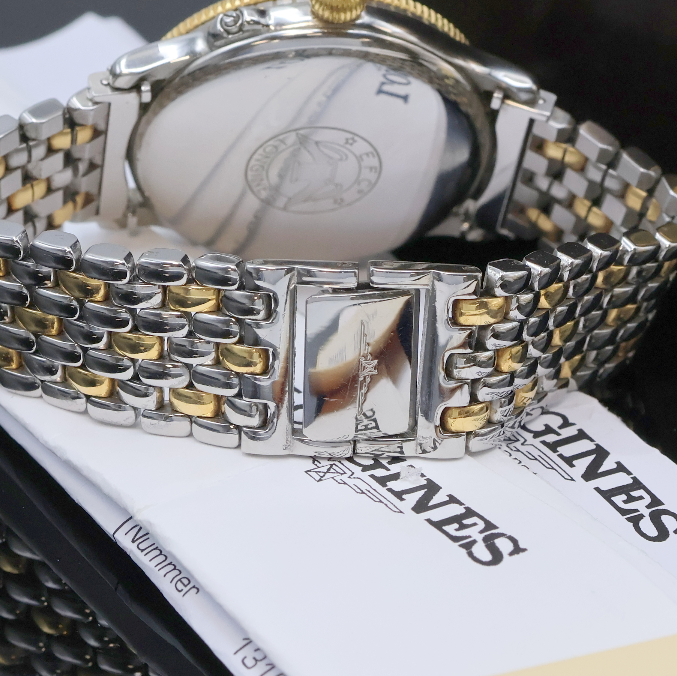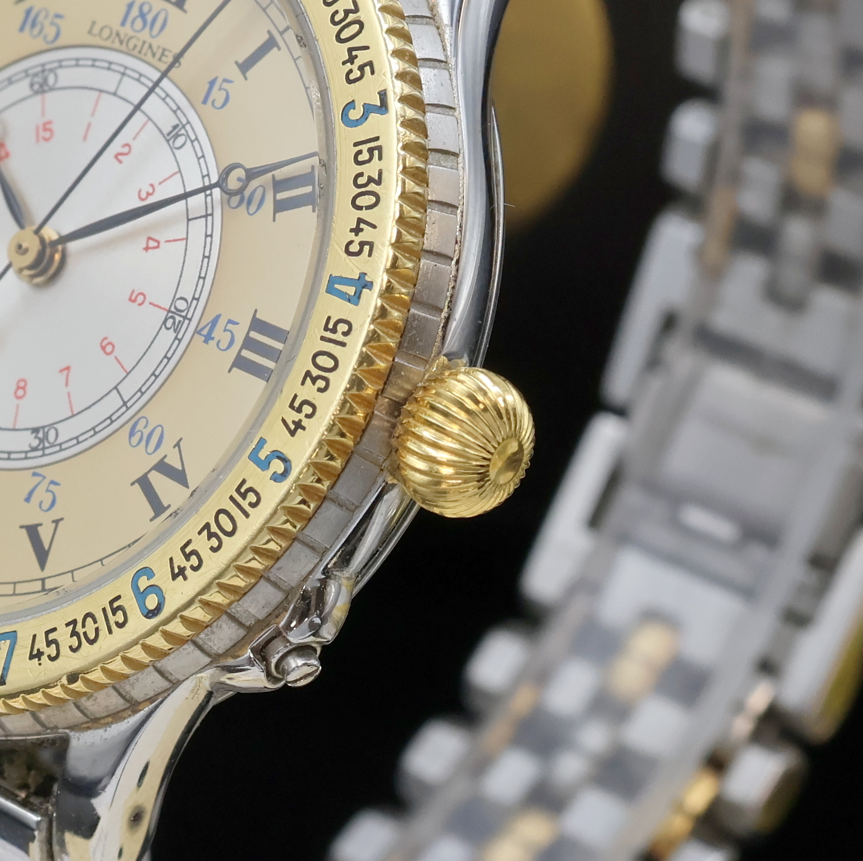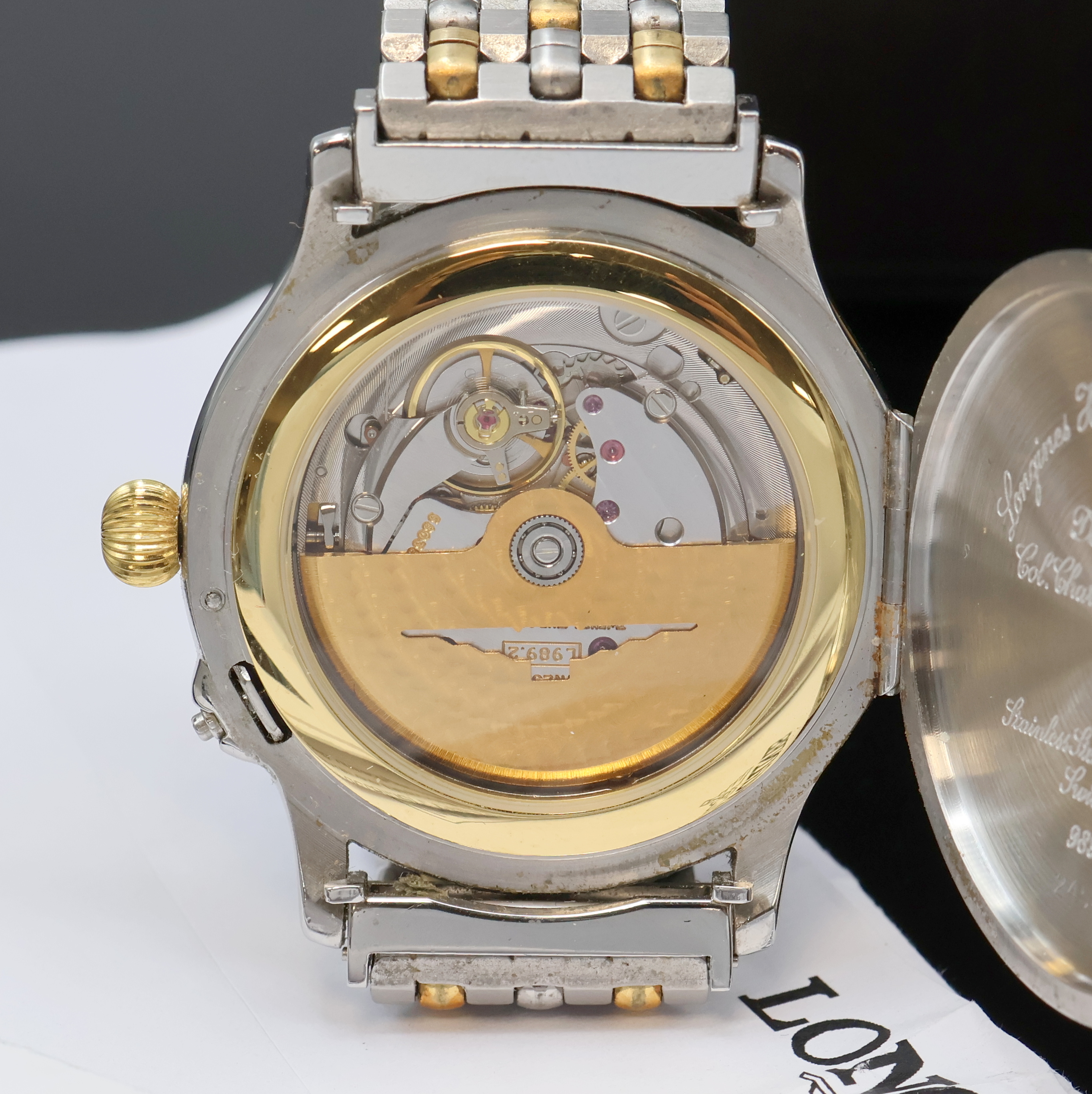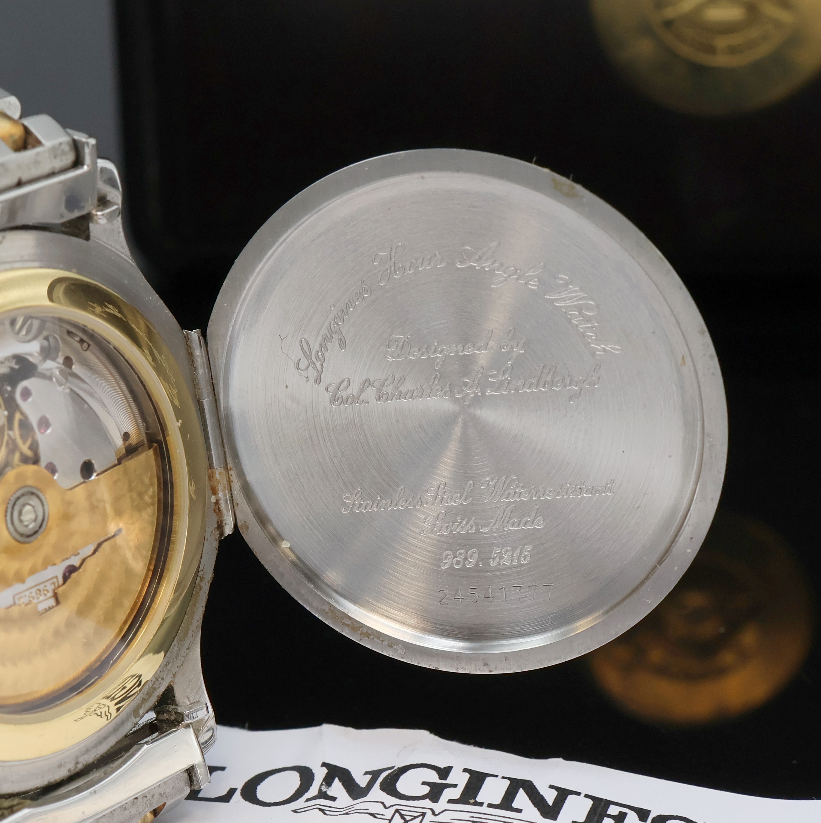 LONGINES Hour Angle Watch Designed by Charles A. Lindbergh Referenz 989.5215, Schweiz um 1990, Automatik, Geh. nach altem Vorbild, Edelstahl/Gold komb., orig. Gliederband, Lünette beids. drehb., Werkverglasung unter Scharnierboden, gold. Ziffernring, im Zentrum vers. u. drehb. Innenscheibe, Kal. L989.2 m. Streifenschl., 2 Federhäuser, 25 St., D. ca. 38 mm, L. ca. 18 cm, Longines Box sowie 3 Bandelemente anbei, EZ 2