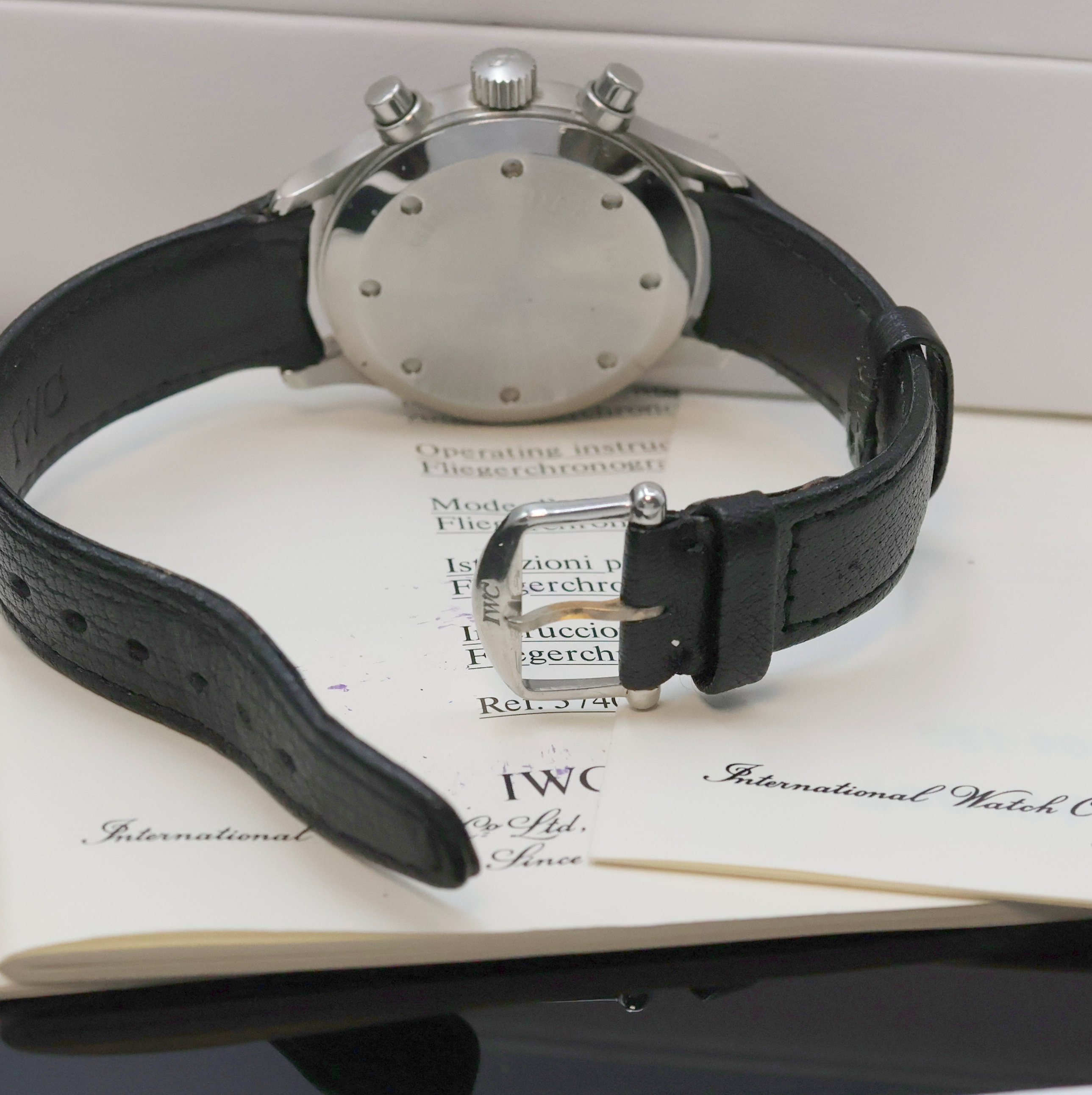 IWC Herrenarmbanduhr "Der Fliegerchronograph" Referenz 3740, Edelstahlgeh. inkl. orig. Lederband m. orig. Dornschl., Boden und Krone verschr., schwarzes Kontrastzifferbl. m. Tritiumindizes, quarz, Anz. v. Std., Min., kl. Sek., Datum und Chronographenz., Werk rhod., 25 St., Streifenschl., D. ca. 36 mm, orig. Etui und Pap., demnach gek. 12/1991, EZ 2, aus Sammlungsauflösung