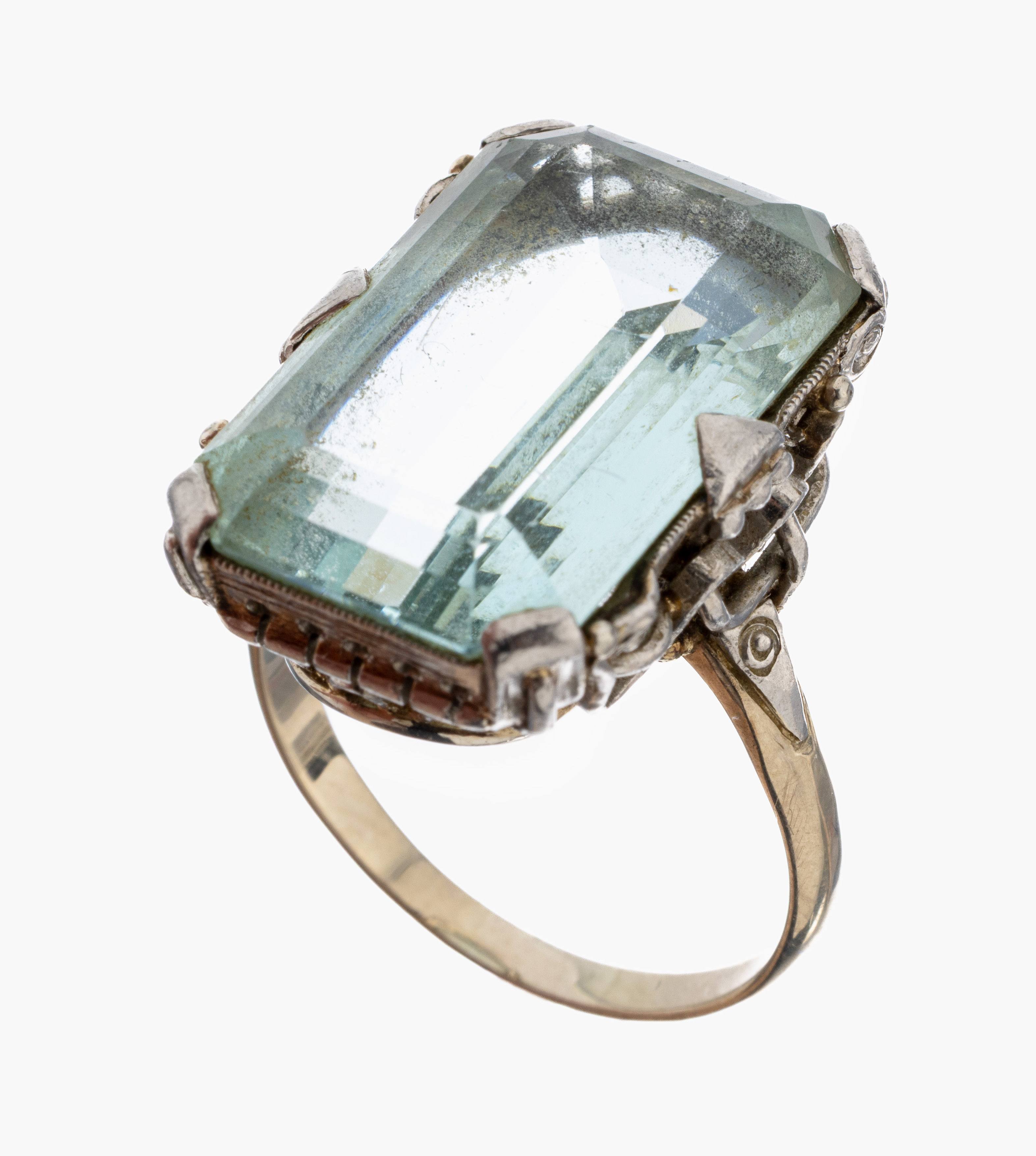 14 kt Gold Aquamarin-Ring, 1940er-50er Jahre, WG 585/000 gepr., Aquamarin im Treppenschliff