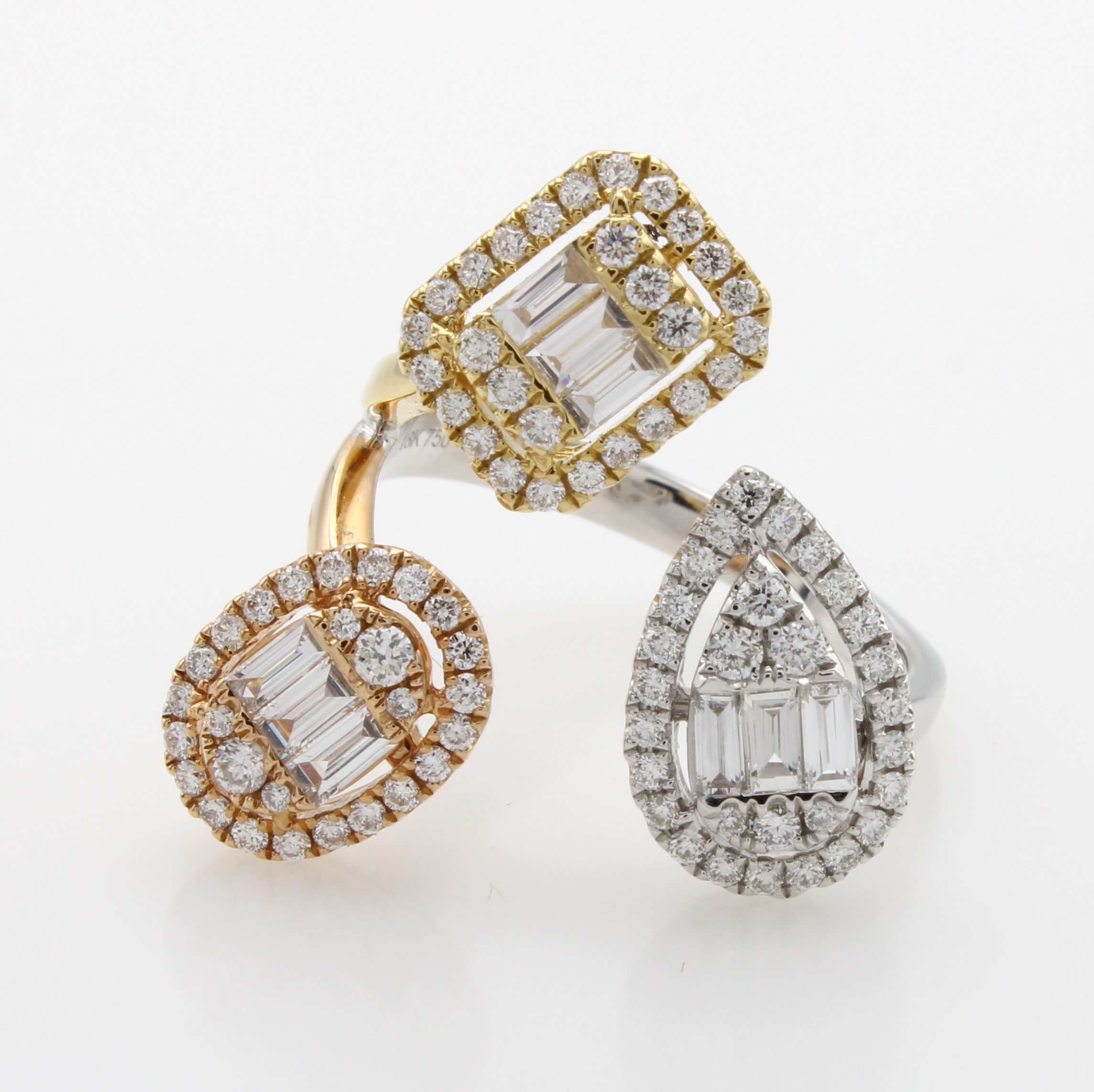 Ring mit Diamanten und Brillanten, WG/GG/RG achteckiger, ovaler u. runder Ringkopf, Diamantbaguettes zus. ca. 0.42 ct u. Brill. zus. ca. 0.58 ct feines Weiß-Weiß/si, RW ca. 53 Schätzpreis: 5680, - EUR